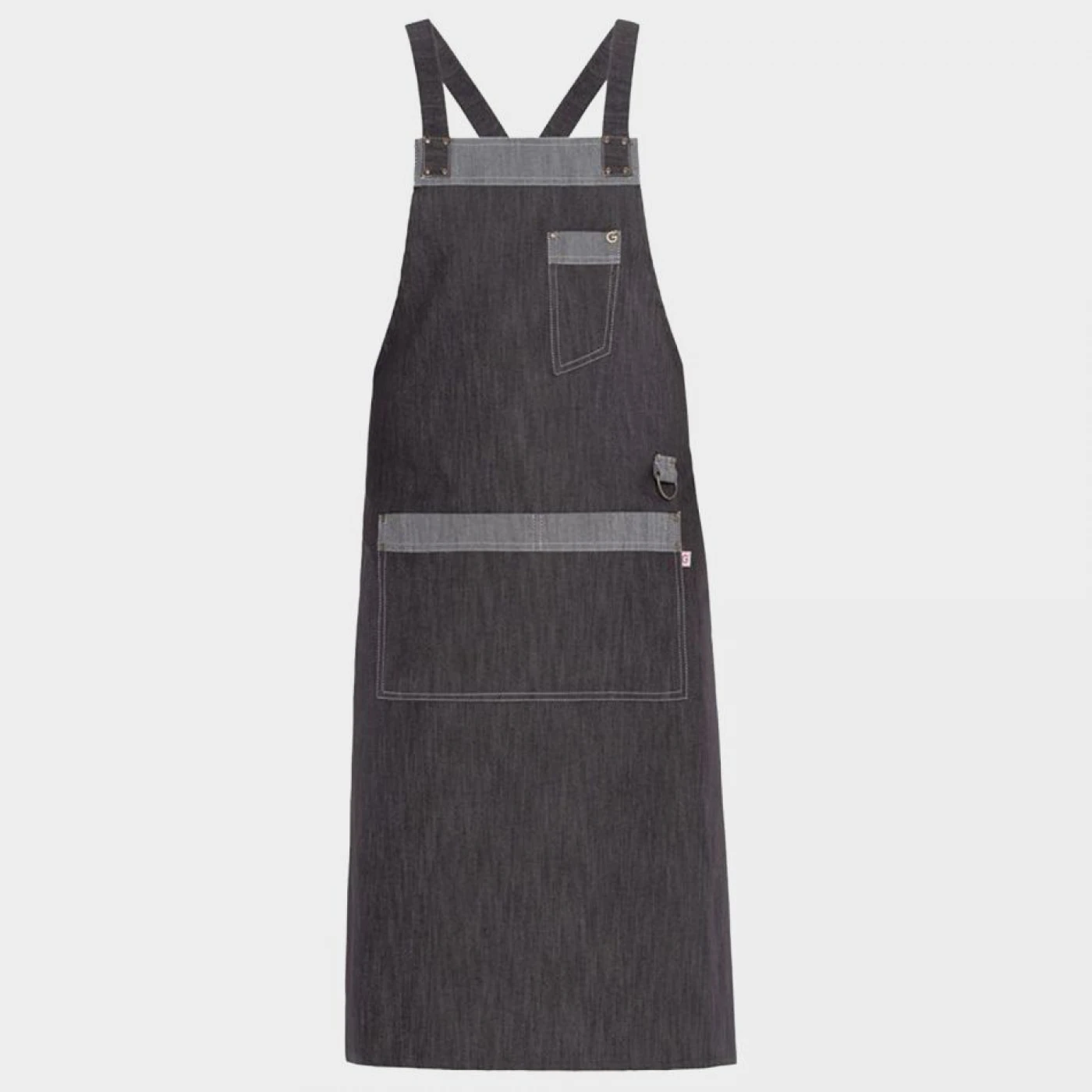 Șorț tip pieptar cu două buzunare, buzunar pentru pix și curea de umăr reglabilă.