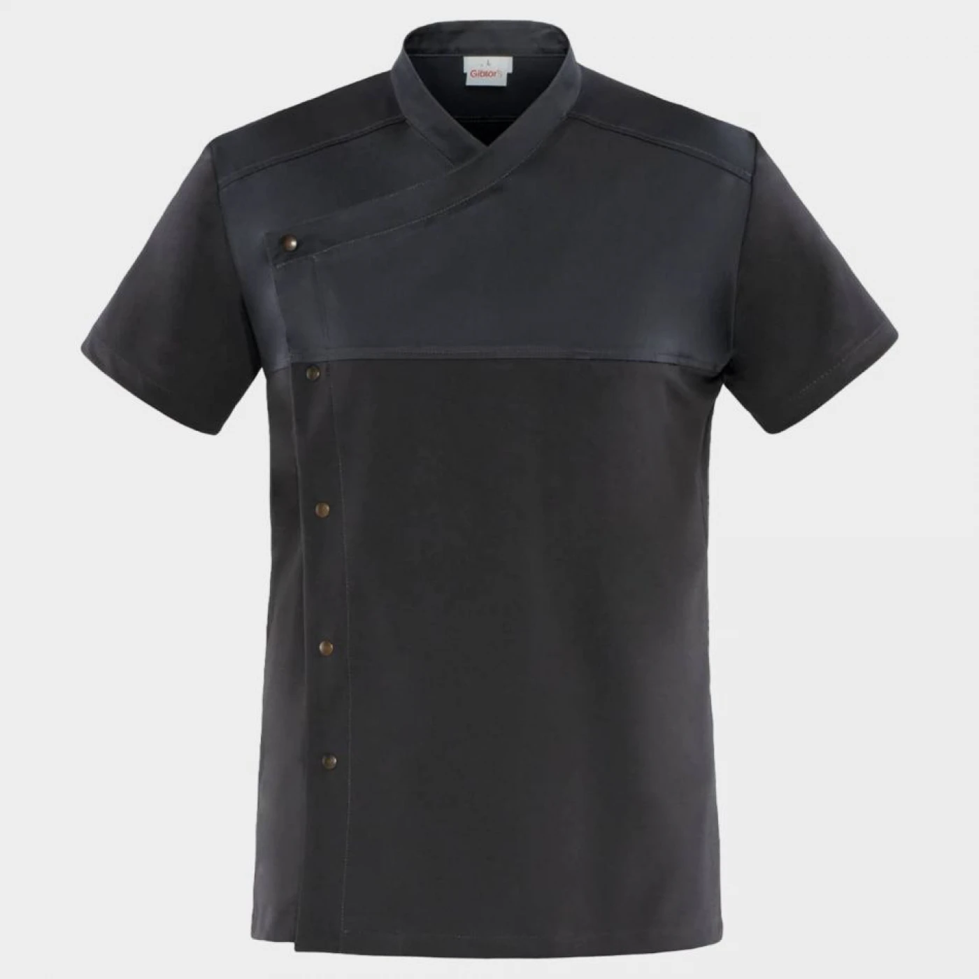 Tunica pentru bucătari. Închidere cu nasturi, buzunar superior ascuns la piept, plasă pe spate.