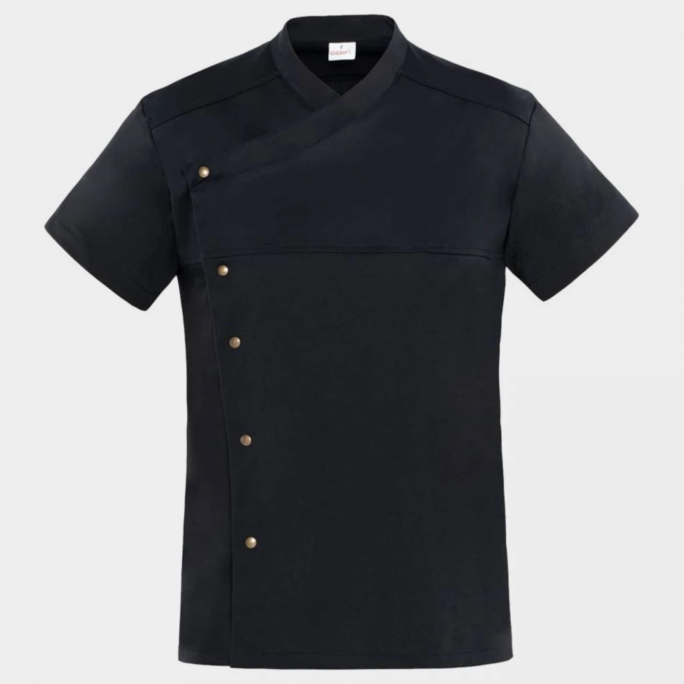 Tunica pentru bucătari. Închidere cu nasturi, buzunar superior ascuns la piept, plasă la spate.