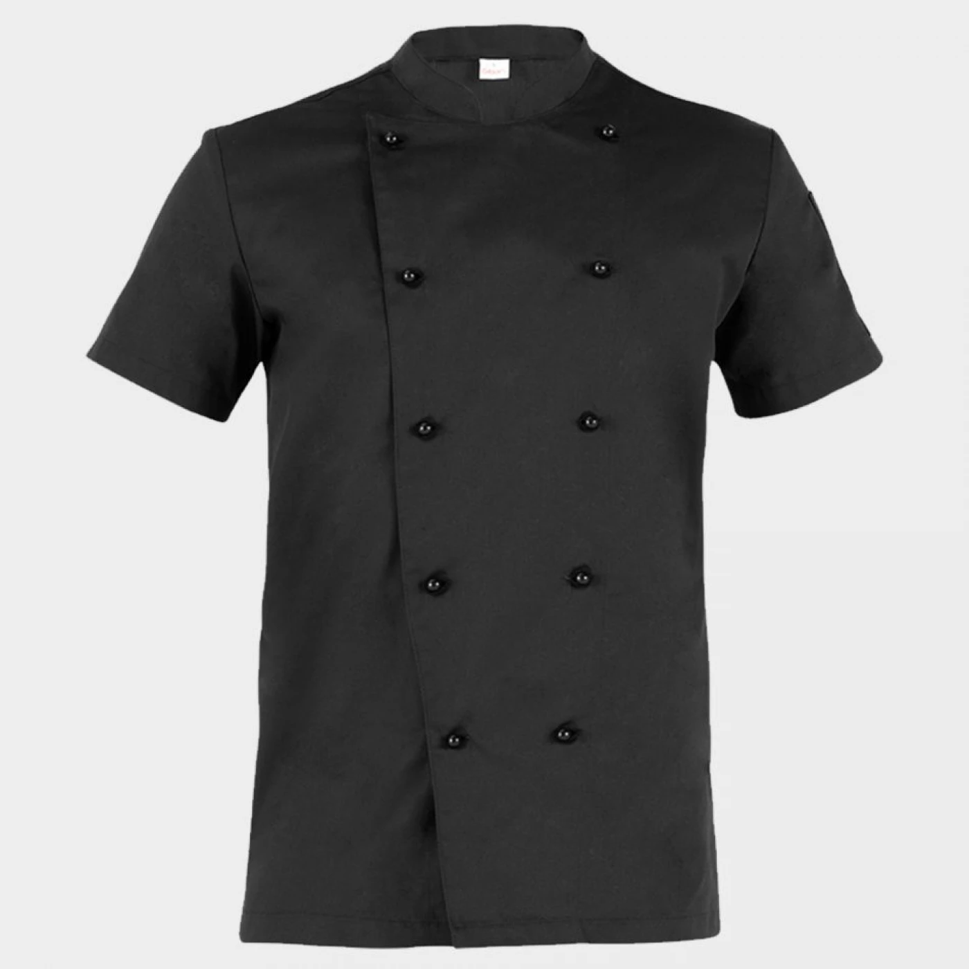 Tunică pentru bucătar cu mânecă scurtă, buzunar pentru pix pe mânecă, închidere cu nasturi detașabile, croi mulat.