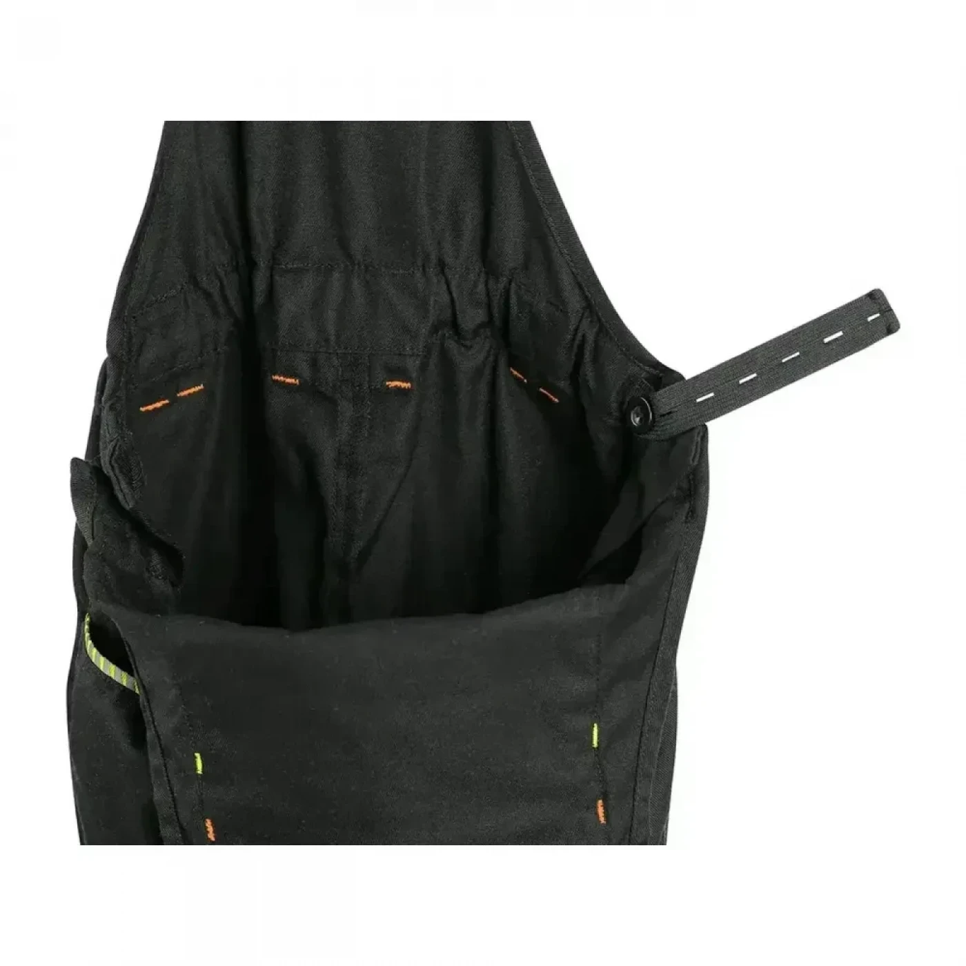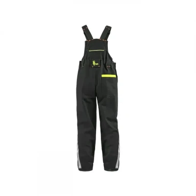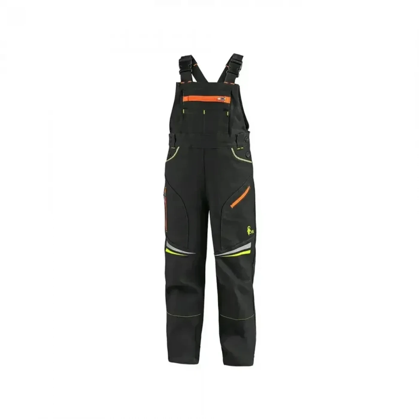 Pantaloni pentru copii cu pieptar, buzunar cu fermoar pe piept și buzunare mai mici, talie cu găici pentru curea, închidere laterală cu nasturi, elastic cu nasture pentru reglarea mărimii la spate, buzunare frontale, buzunare pentru creioane și obiecte mici pe coapsa stângă, buzunar cu fermoar pe coapsa dreaptă, buzunar simplu la spate, bretele elastice la spate, accesorii reflectorizante.