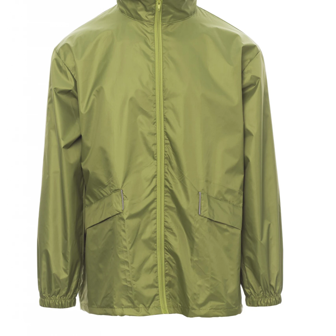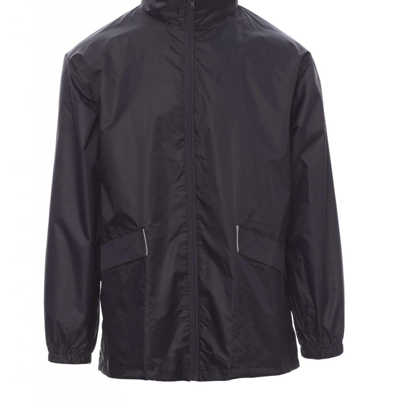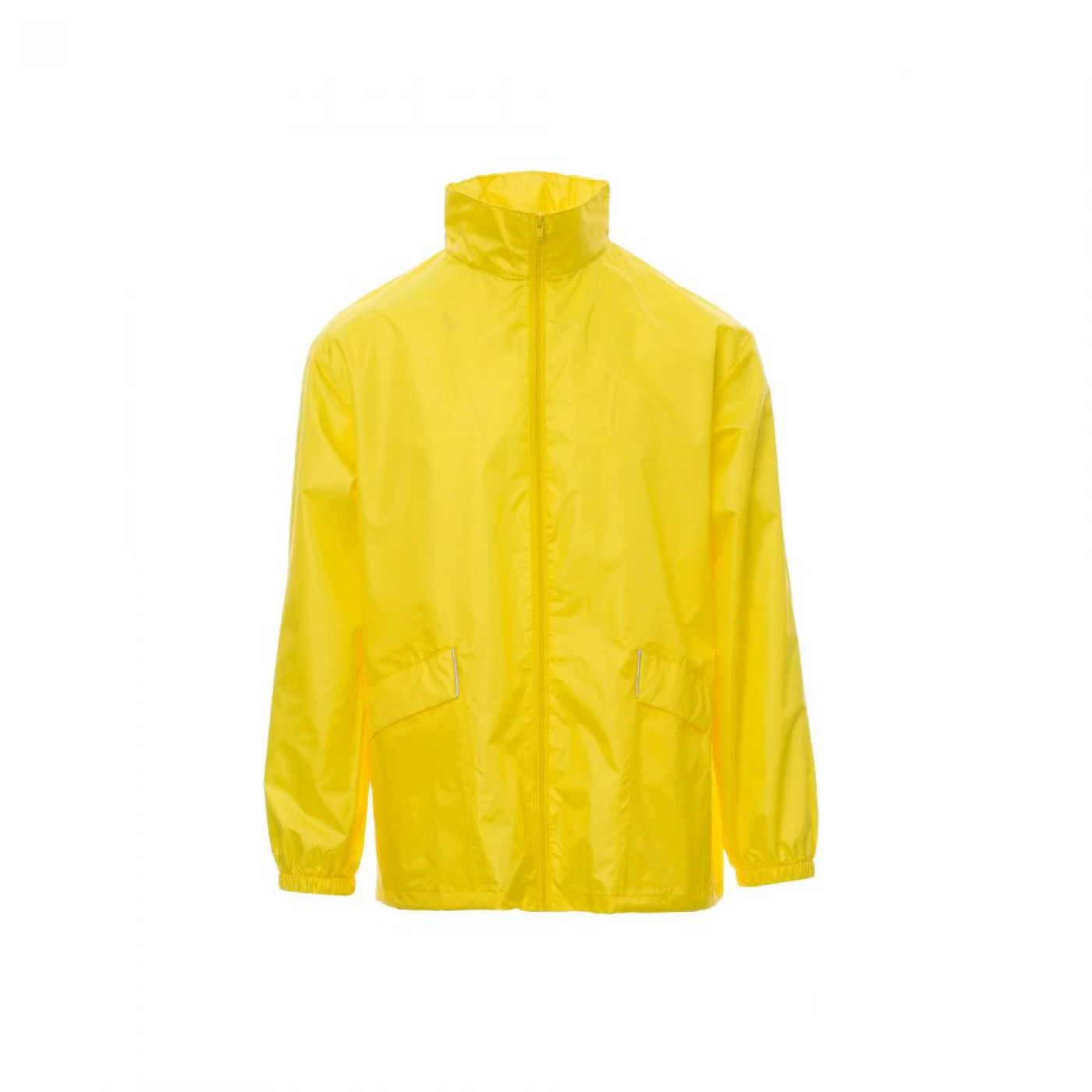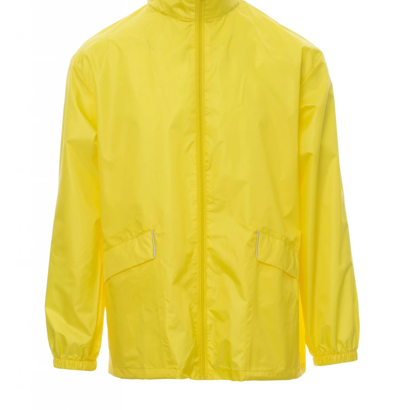 Jacheta impermeabilă unisex, cu glugă pliabilă, manșete elastice, două buzunare cu închidere Velcro, elemente reflectorizante și inserție pe spate. Interior: necăptușit, cu efect argintiu (cu excepția variantei galbene). Ambalată individual într-un săculeț cu șnur și curea laterală. \n \n