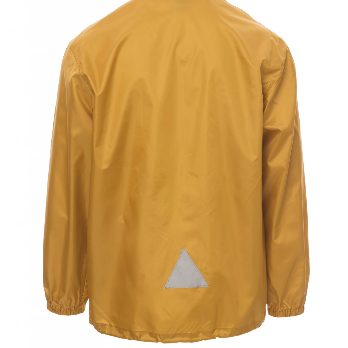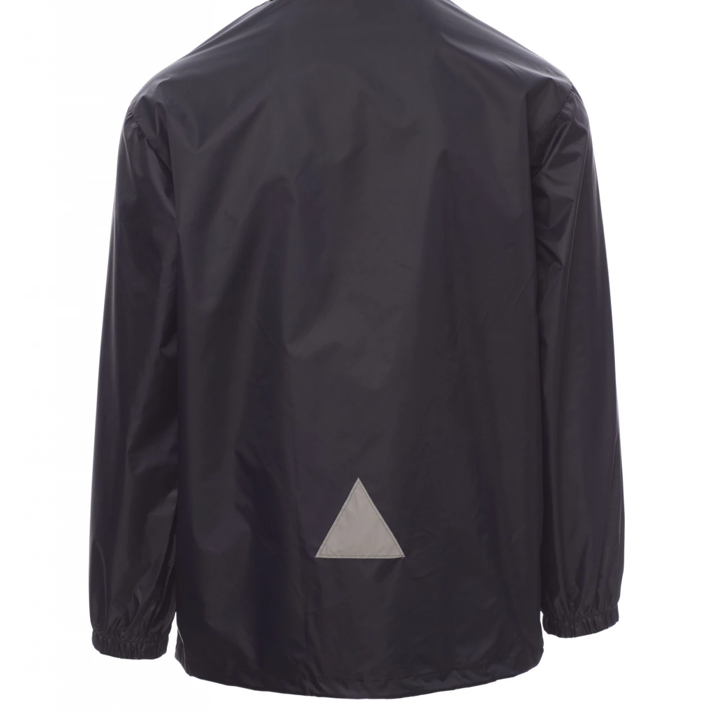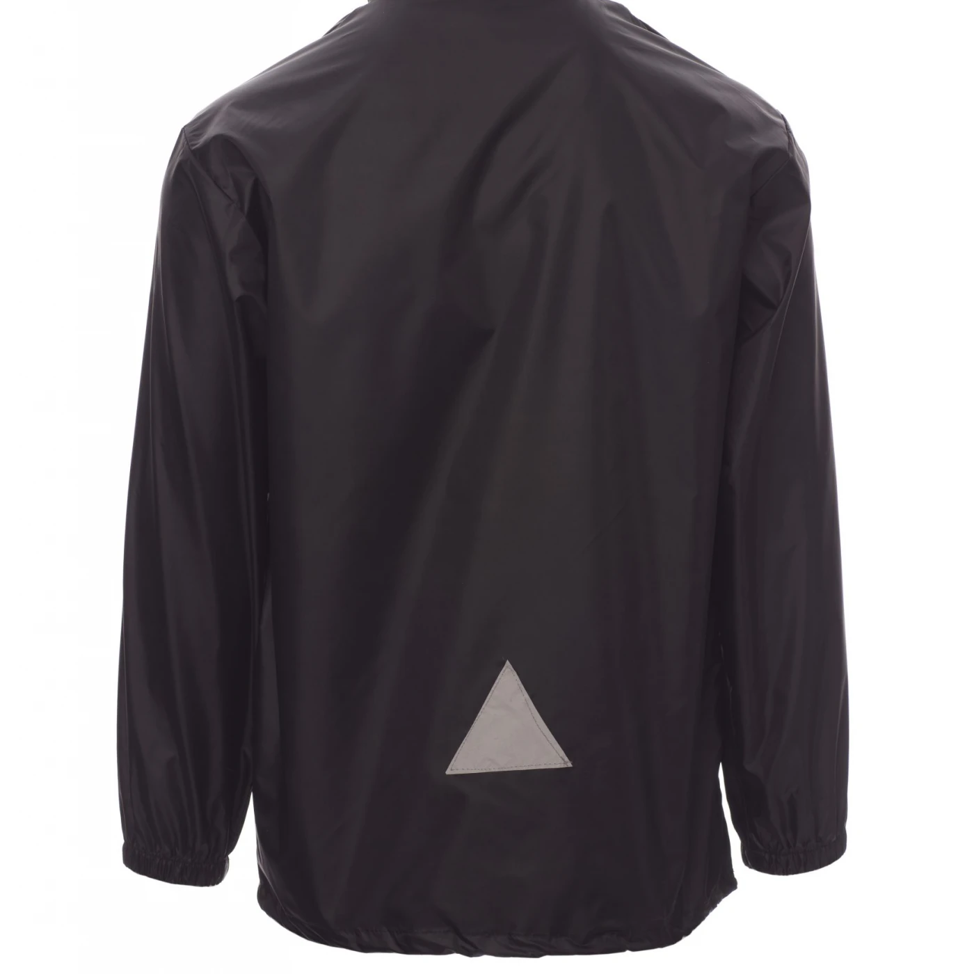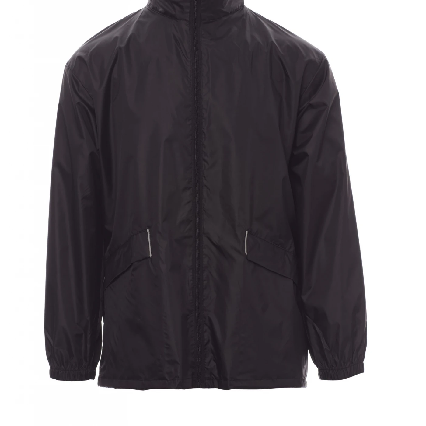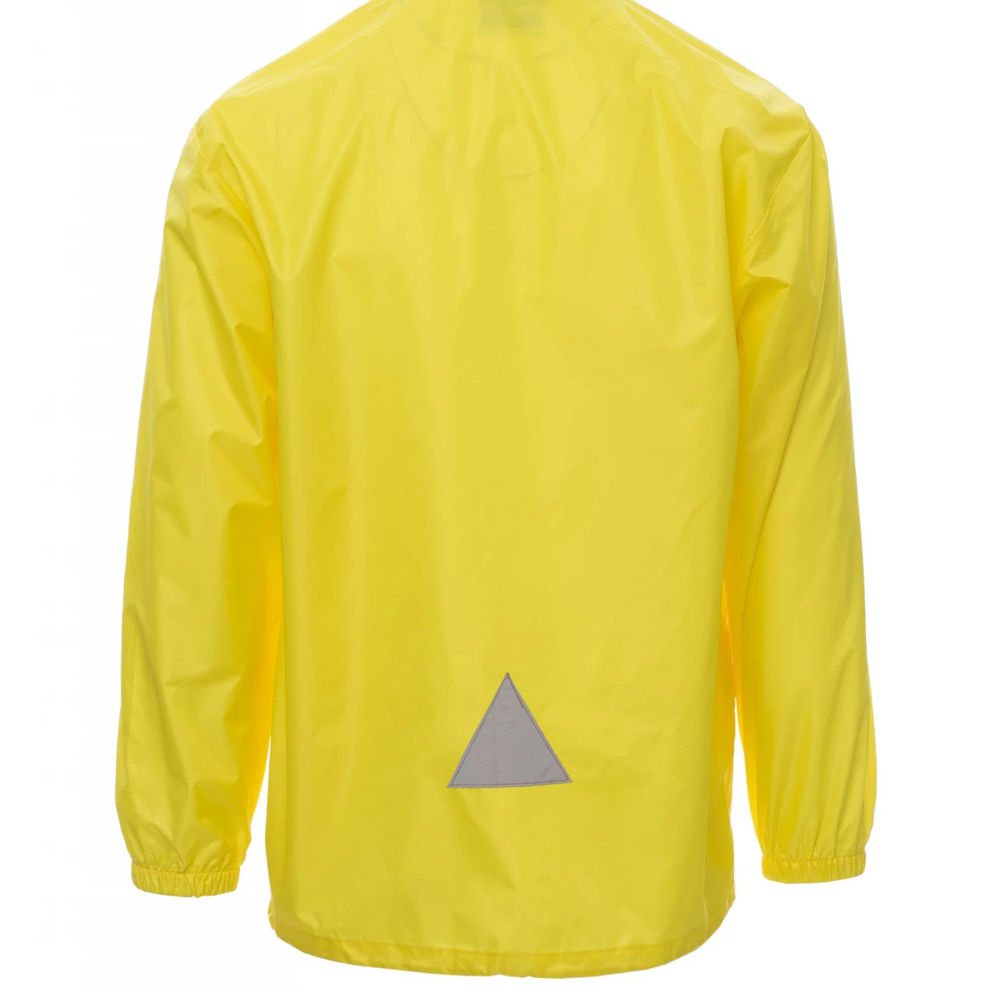 Jacheta impermeabilă unisex, cu glugă pliabilă, manșete elastice, două buzunare cu închidere Velcro, elemente reflectorizante și inserție pe spate. Interior: necăptușit, cu efect argintiu (cu excepția variantei galbene). Ambalată individual într-un săculeț cu șnur și curea laterală. \n \n