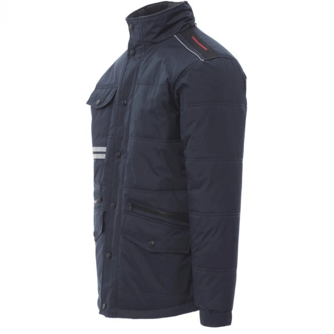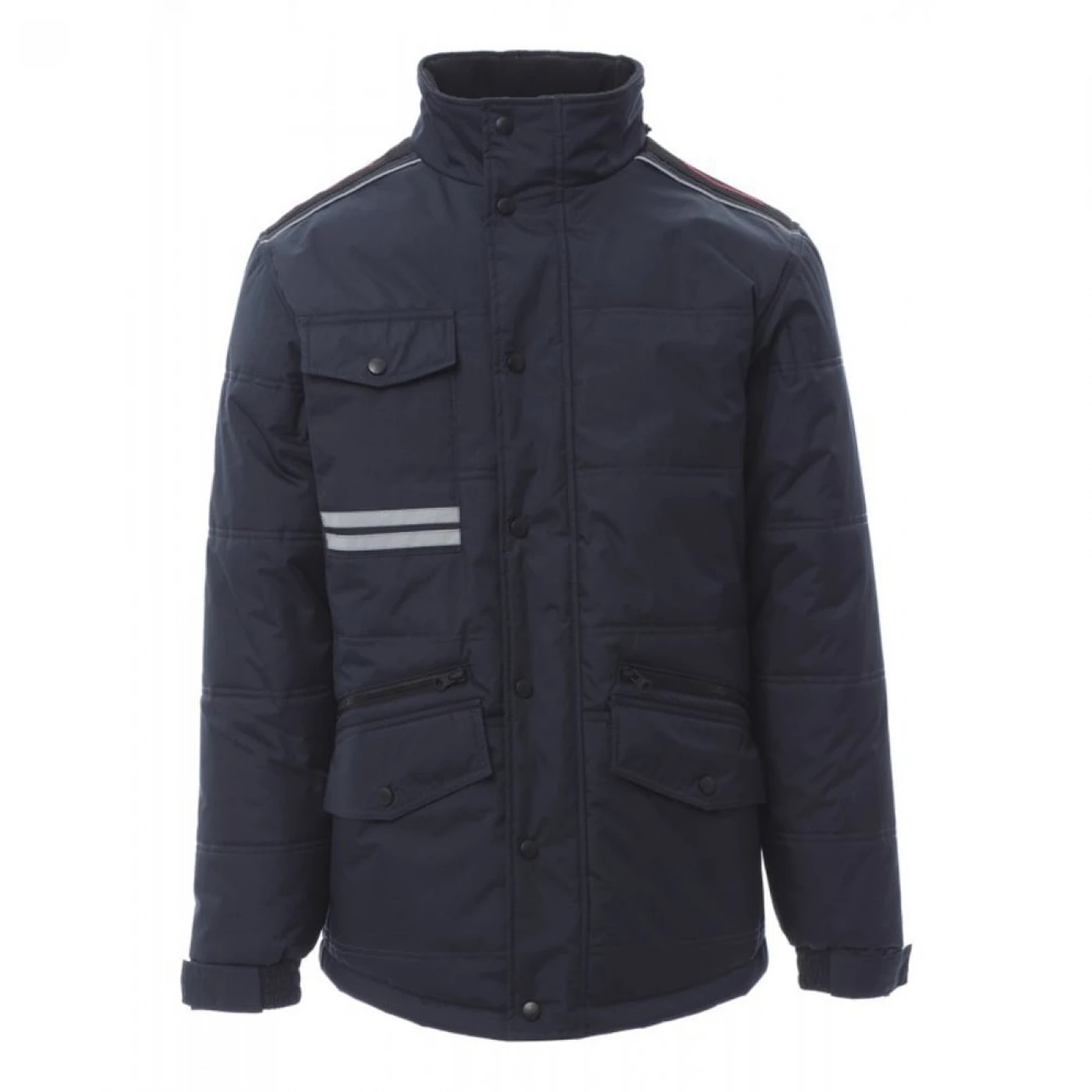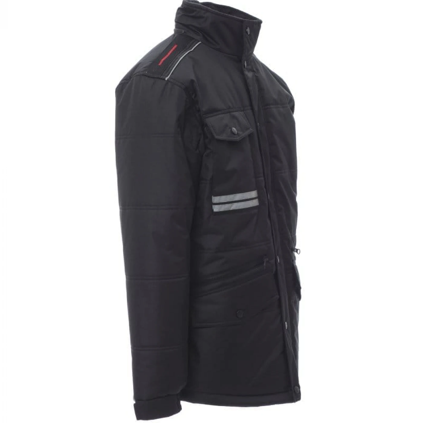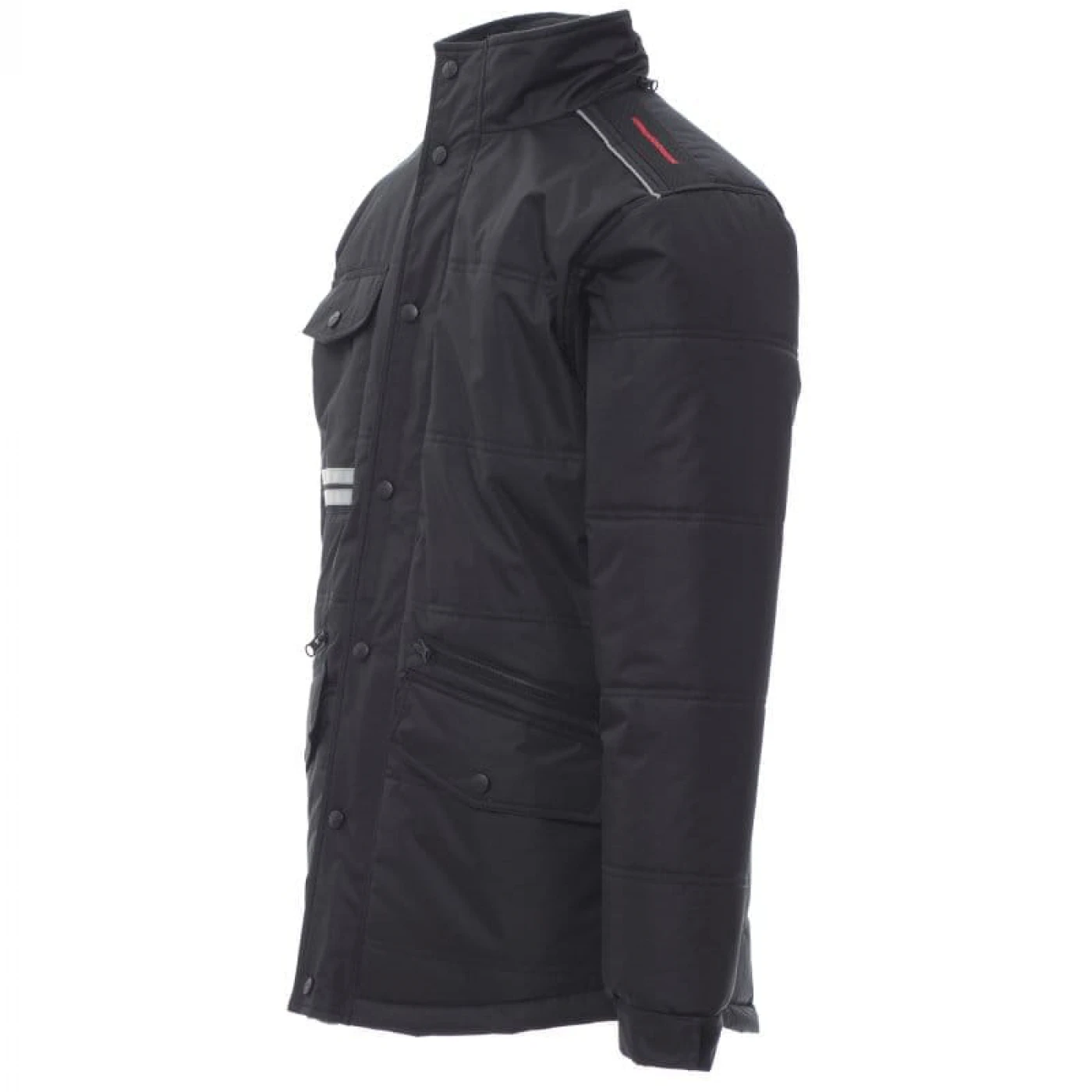 Jacheta lunga (3/4) de iarna pentru barbati captusita cu fleece pe interior. Asigura protectie in sezonul rece impotriva vantului (windproof) si ploii (waterproof). Are gluga pliabila si este echipata cu doua buzunare frontale clasice cu inchidere cu butoni, doua buzunare frontale suplimentare cu inchidere cu fermoar si un buzunar la piept cu inchidere cu buton. Pentru o vizibilitate sporita, jacheta prezinta doua dungi reflectorizante pe buzunarul din fata si doua dungi reflectorizante orizontale pe spatele jachetei.