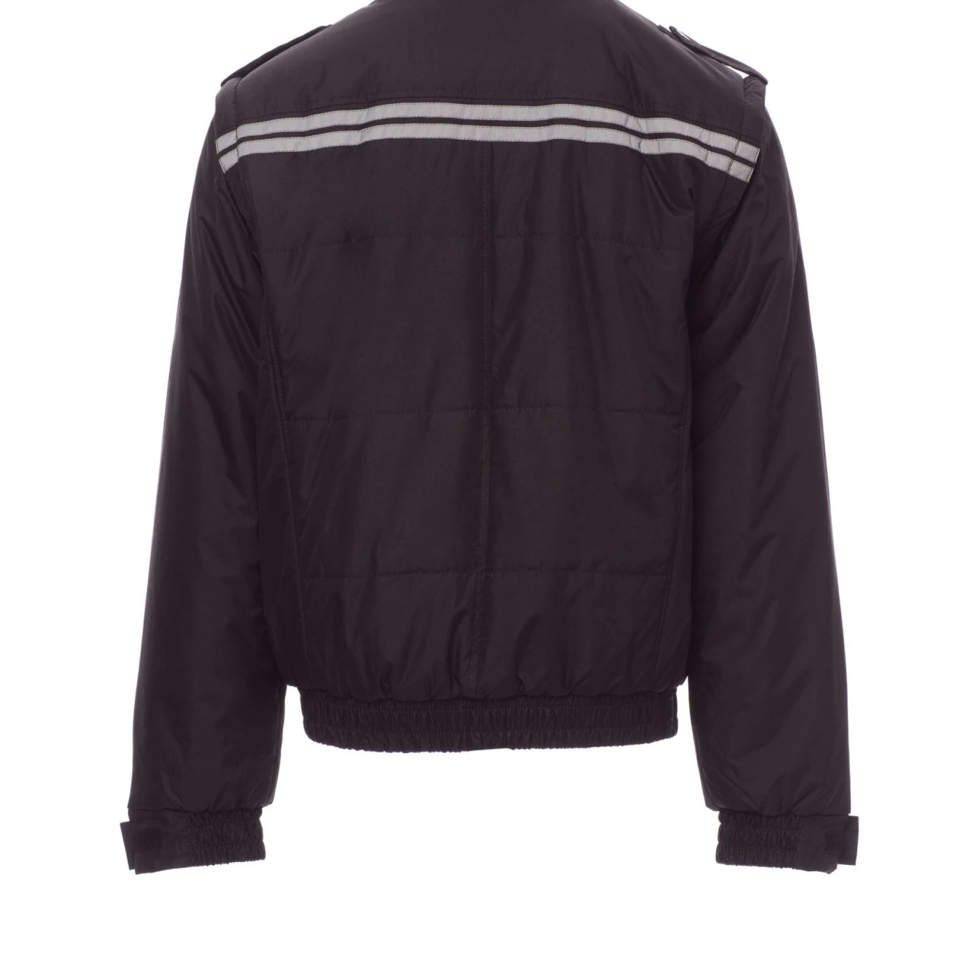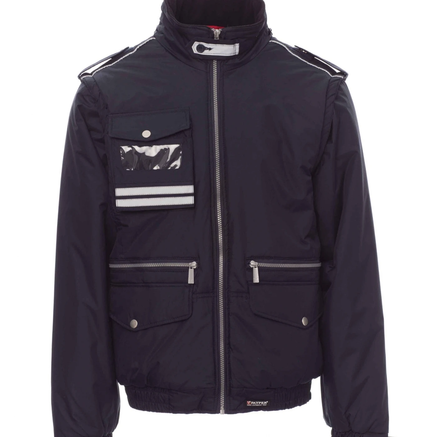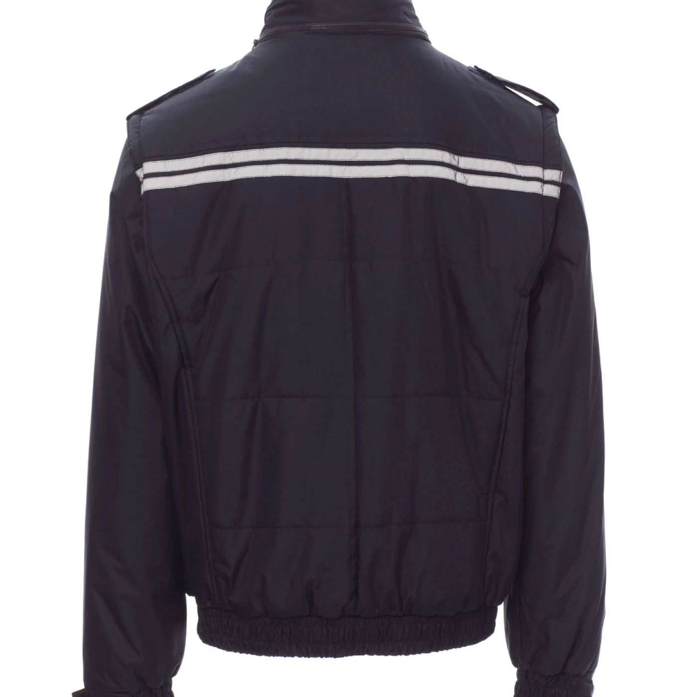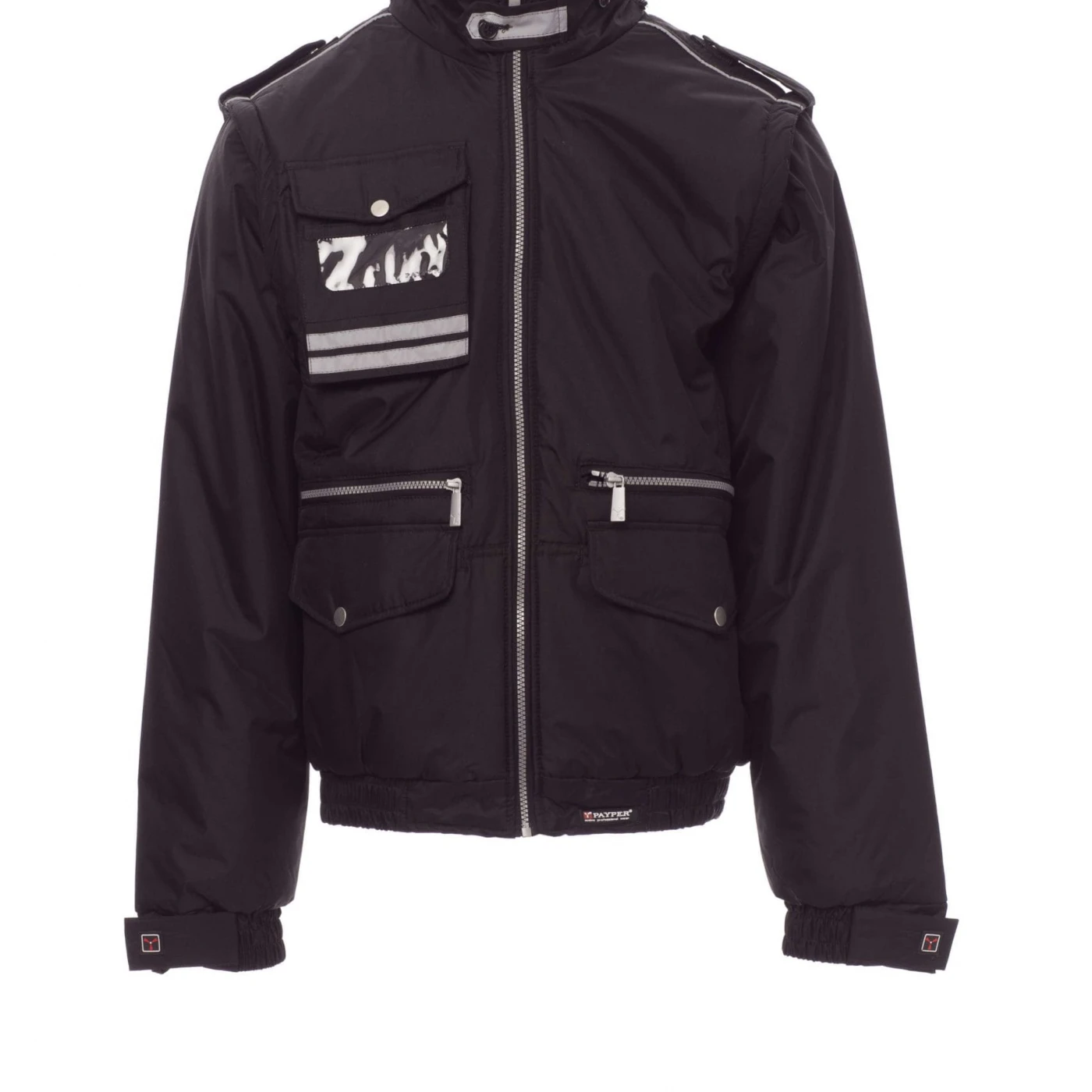Geacă subțire casual pentru bărbați, ajustată pe corp, cu mâneci detașabile, fermoar din plastic cu cursor metalic, glugă ce poate fi strânsă în guler, bandă elastică în talie, manșete reglabile, epoleți și guler cu fermoar, două buzunare LOCK SYSTEM, două buzunare cu fermoar, un suport pentru ecuson cu două fețe, paspoaluri reflectorizante pe umeri și bandă dublă reflectorizantă pe buzunarul de pe piept și pe spate. La interior: vătuită, căptușeală de înaltă densitate, în culoare argintie, micro-fleece pe spate, fleece pe partea interioară a gulerului, un buzunar interior. \n