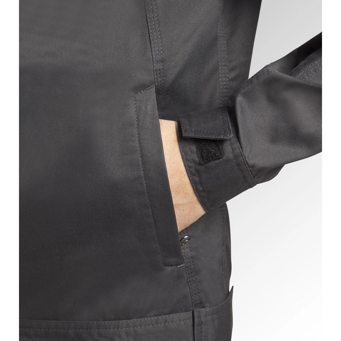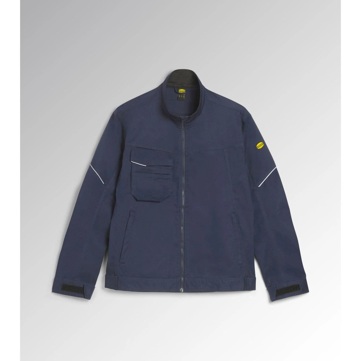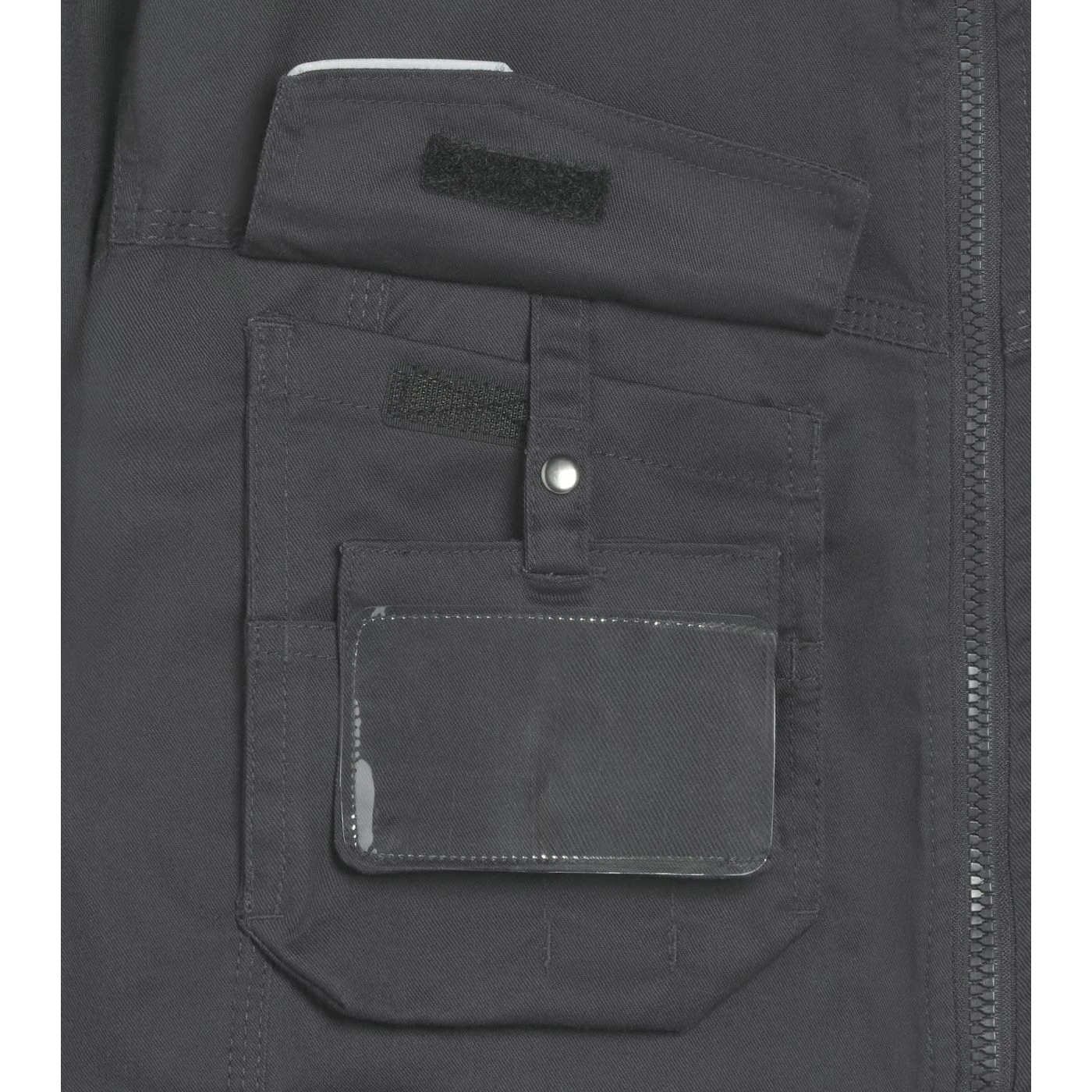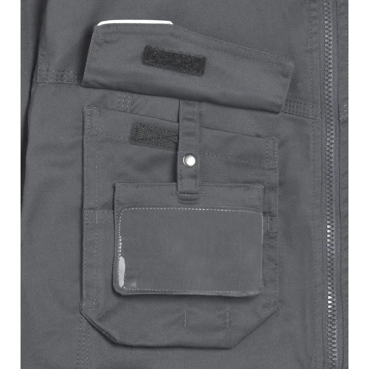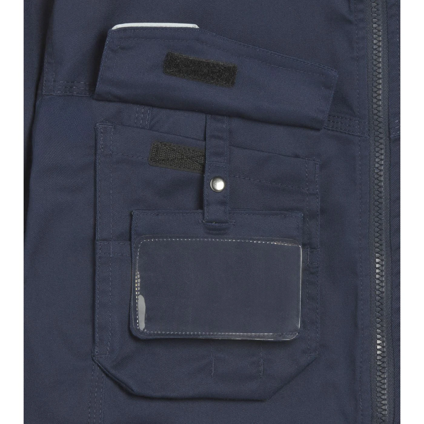 Multi-pocket stretch poly-cotton jacket, stand-up collar with full zip and chin guard, multifunctional breast pocket with badge holder on the left side, right side free for customisation. Zipped side pockets. Adjustable Velcro hem. Ergonomic sleeves with adjustable cuffs, darts and reflective details. Triple seams.
