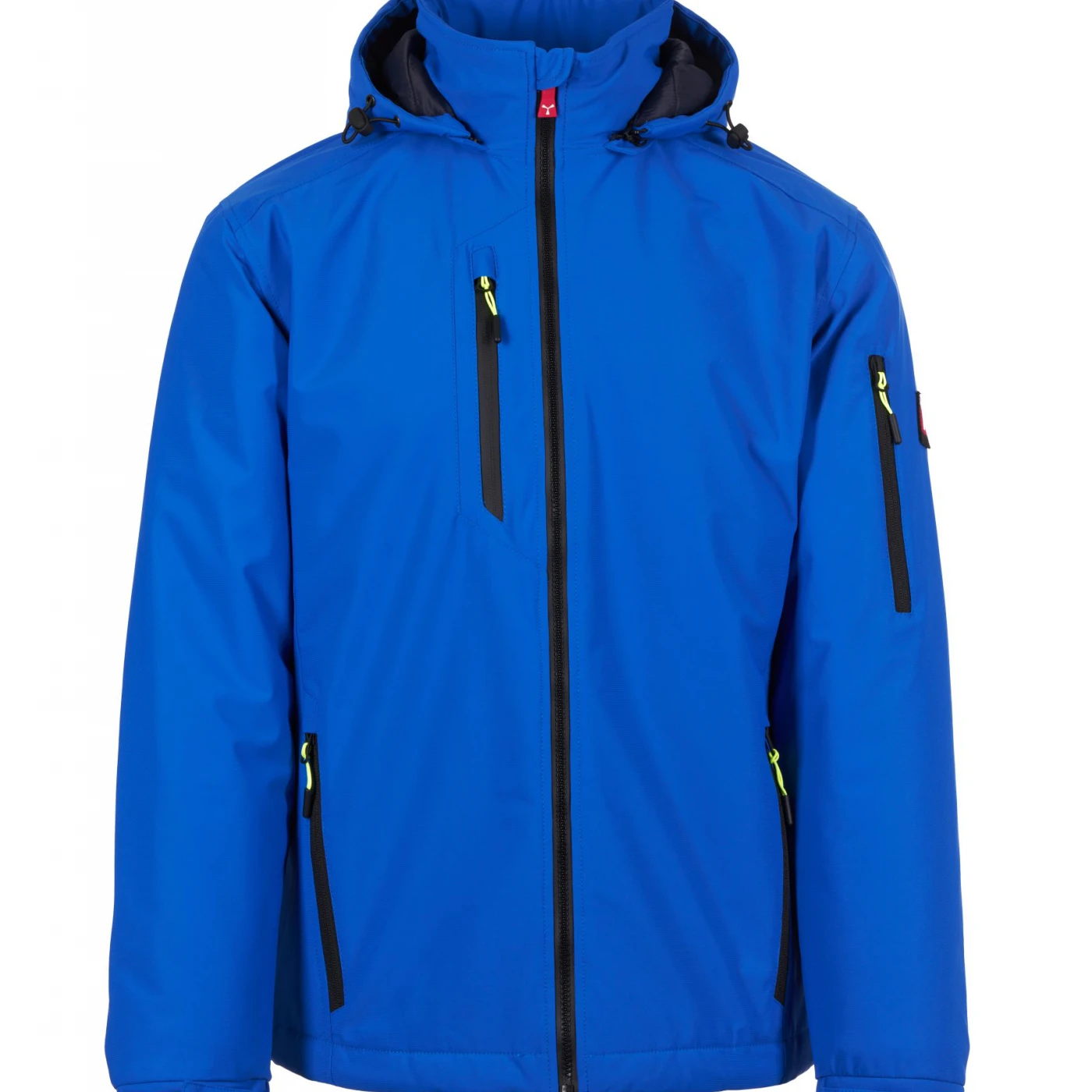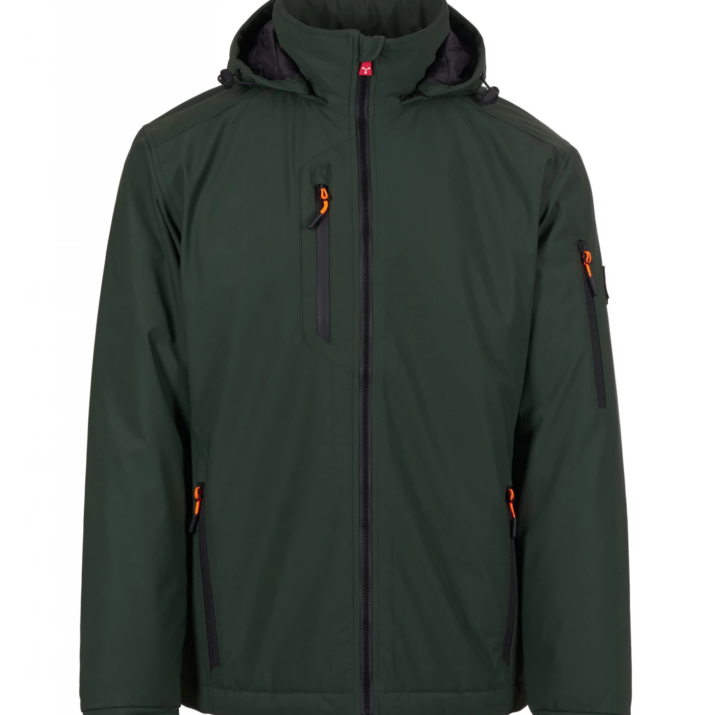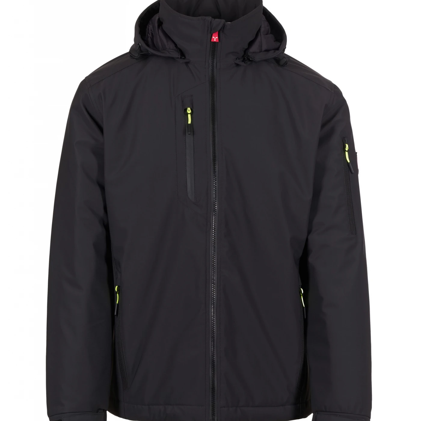 Soft-shell impermeabil pentru bărbați, cu căptușeală lejeră și închidere cu fermoar SBS dotat cu cursor metalic „semi-auto lock” și dispozitiv de tragere personalizat. Glugă detașabilă cu șnur reglabil. Elemente reflectorizante aplicate pe spate, la nivelul taliei și pe glugă. Manșete elastice, ajustabile cu închidere tip scai. Două buzunare laterale cu fermoar, un buzunar la piept și unul pe brațul stâng, ambele cu fermoar, acesta din urmă având suport integrat pentru pix. Prezintă detalii fluorescente și un buzunar interior cu închidere tip scai. Partea inferioară este reglabilă cu opritor personalizat. \n \n