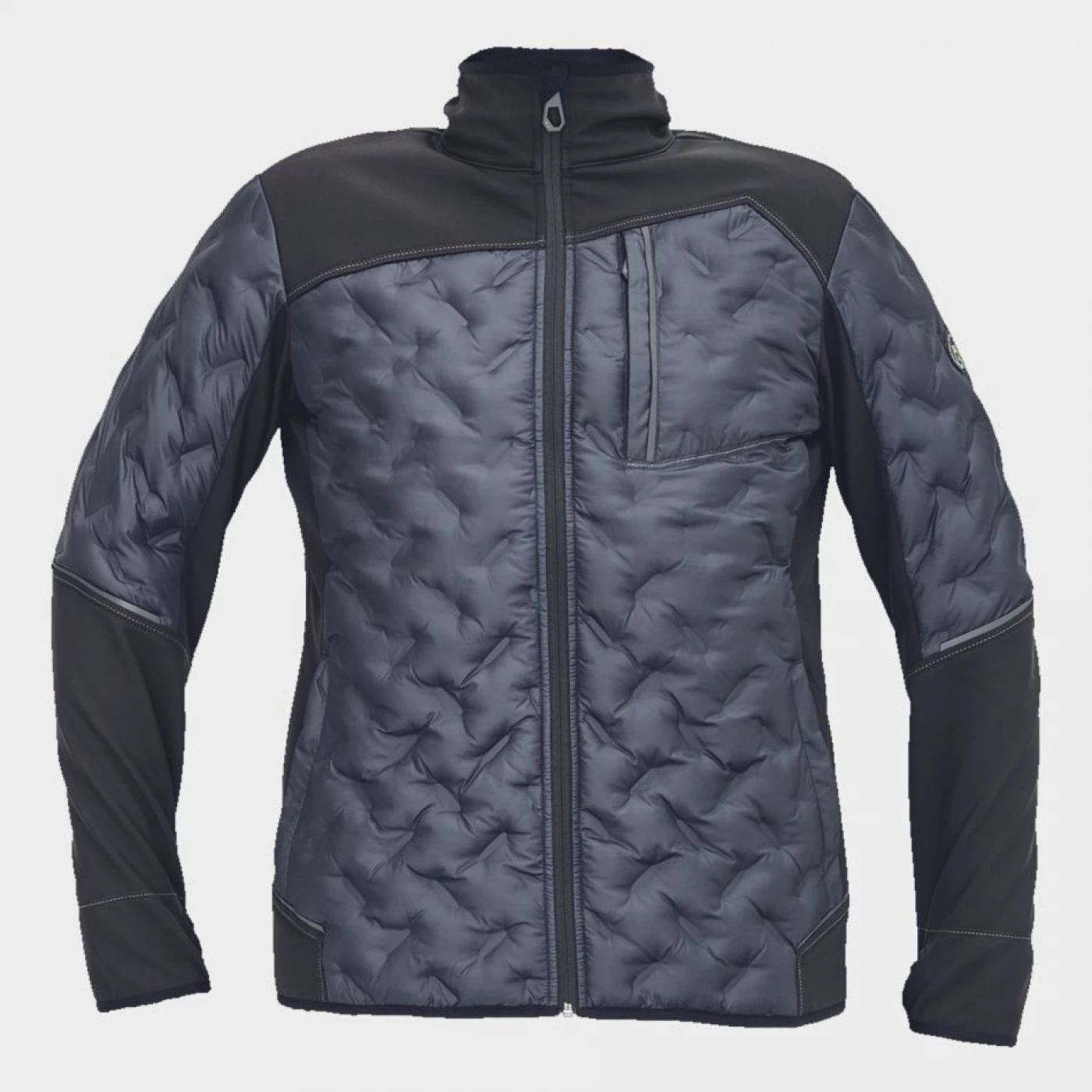 Jachetă softshell matlasată pentru bărbați, rezistentă la vânt și rezistentă la apă. Două buzunare laterale cu fermoar, un buzunar la piept cu fermoar. Cusături elastice pe mâneci și manșete. Orificii pentru degetul mare, elemente de semnalizare.