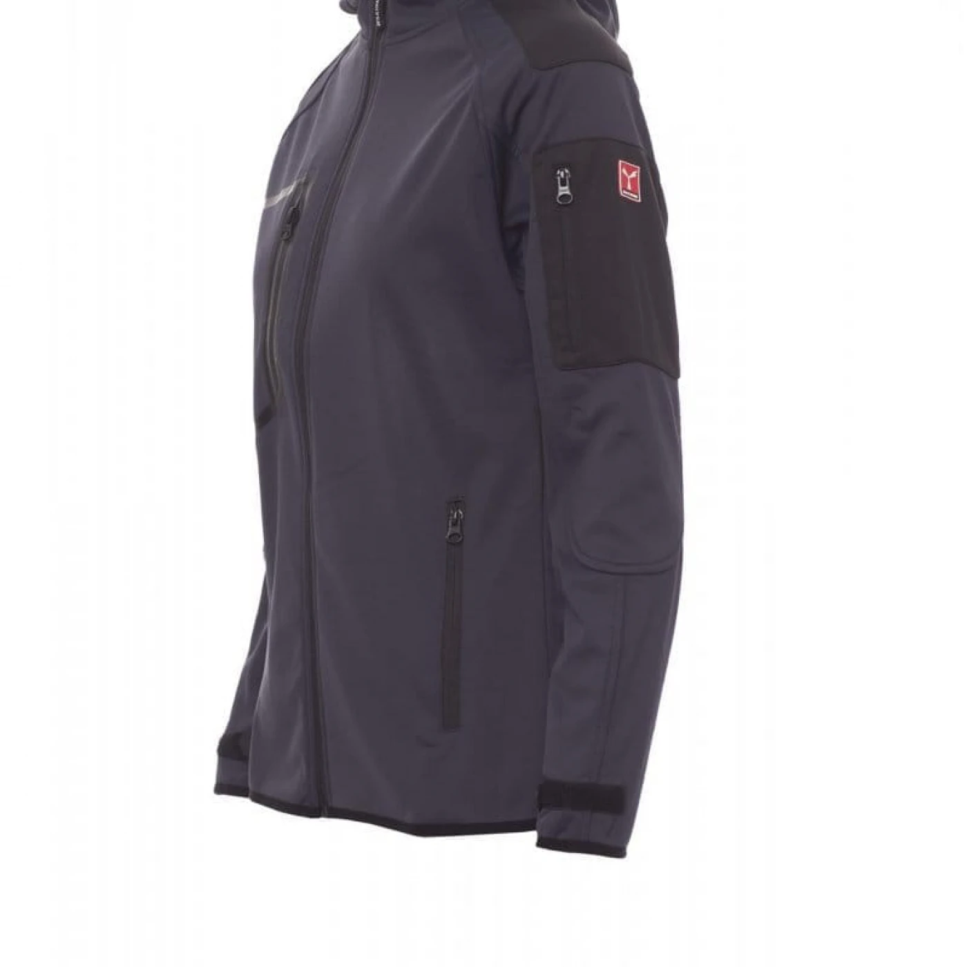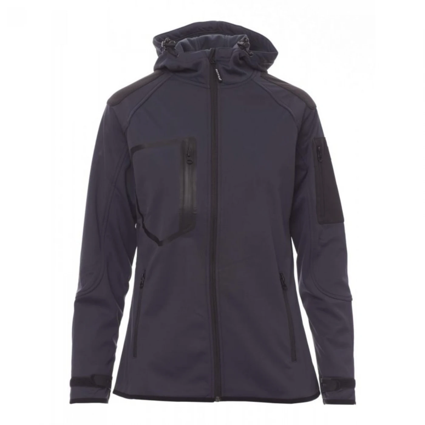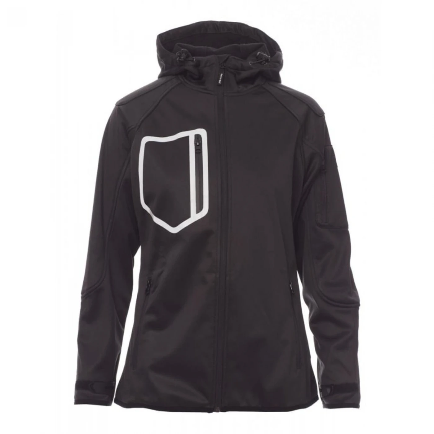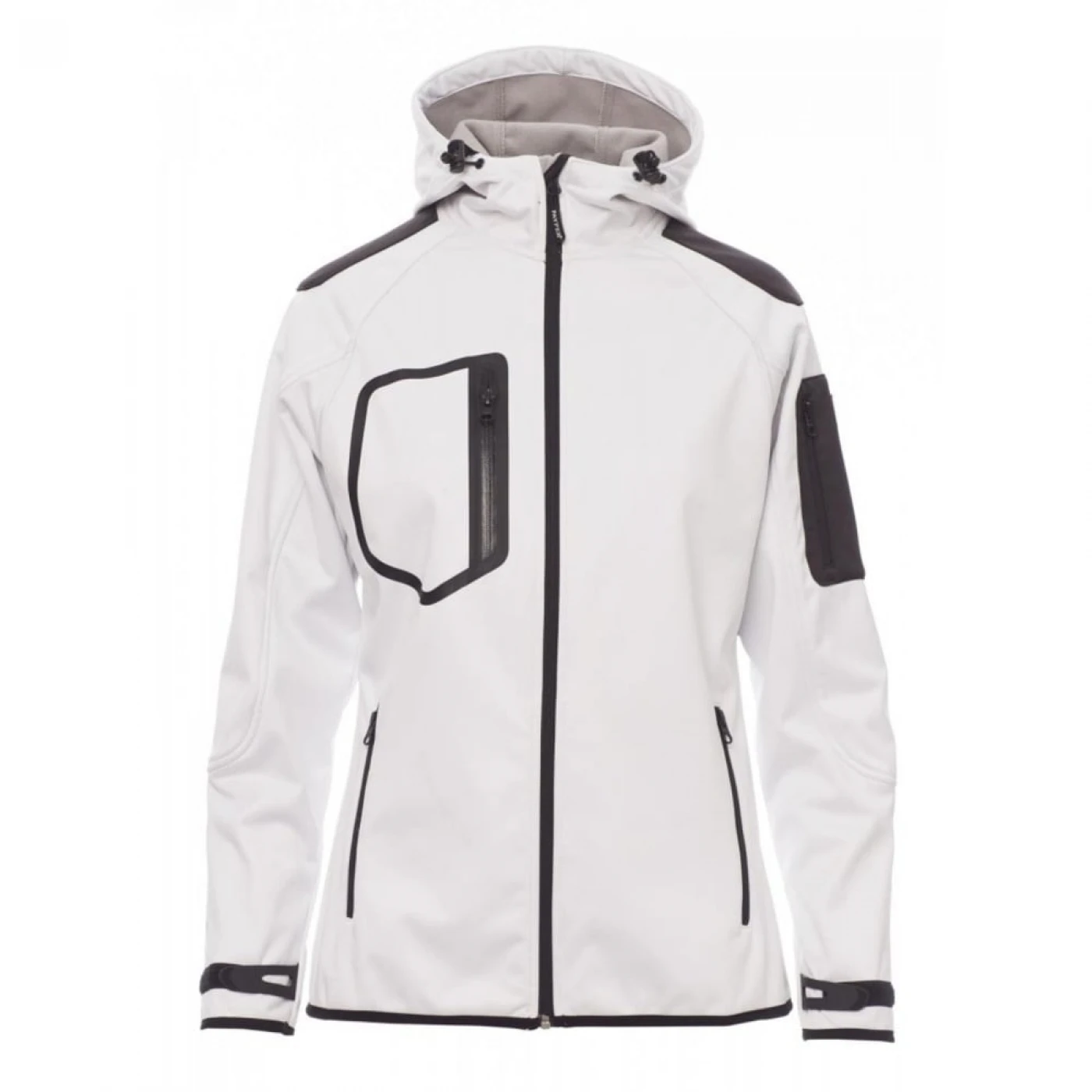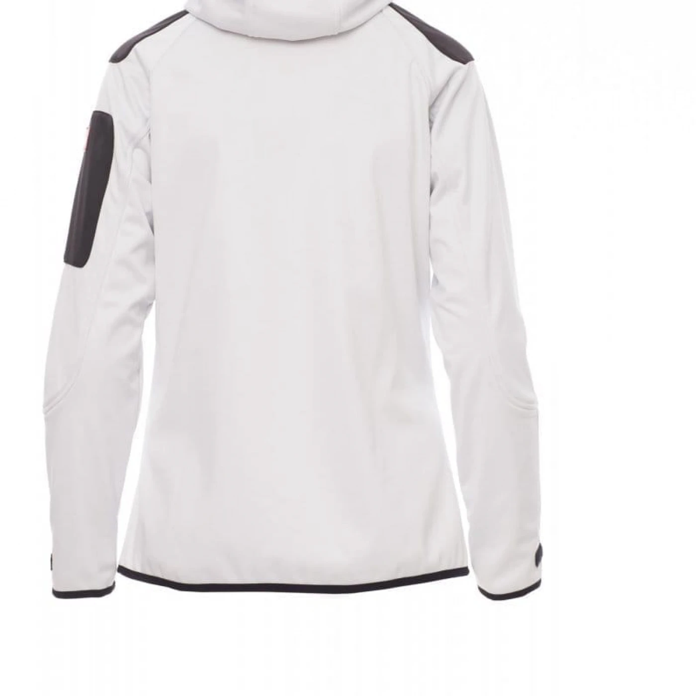 Jacheta dama softshell confortabila si respirabila care asigura o protectie sporita impotriva vantului (windproof) si impotriva apei (waterproof - WP 8000 mm H₂O, WVT 5000 g/m² 24h). Gluga are cusaturi duble si reglabila cu snur. Mansetele sunt reglabile cu velcro. Jacheta este echipata cu doua buzunare frontale, un buzunar la piept si unul pe maneca stanga, toate inchise cu fermoar. Culori contrastante pe umeri, maneci si mansete.