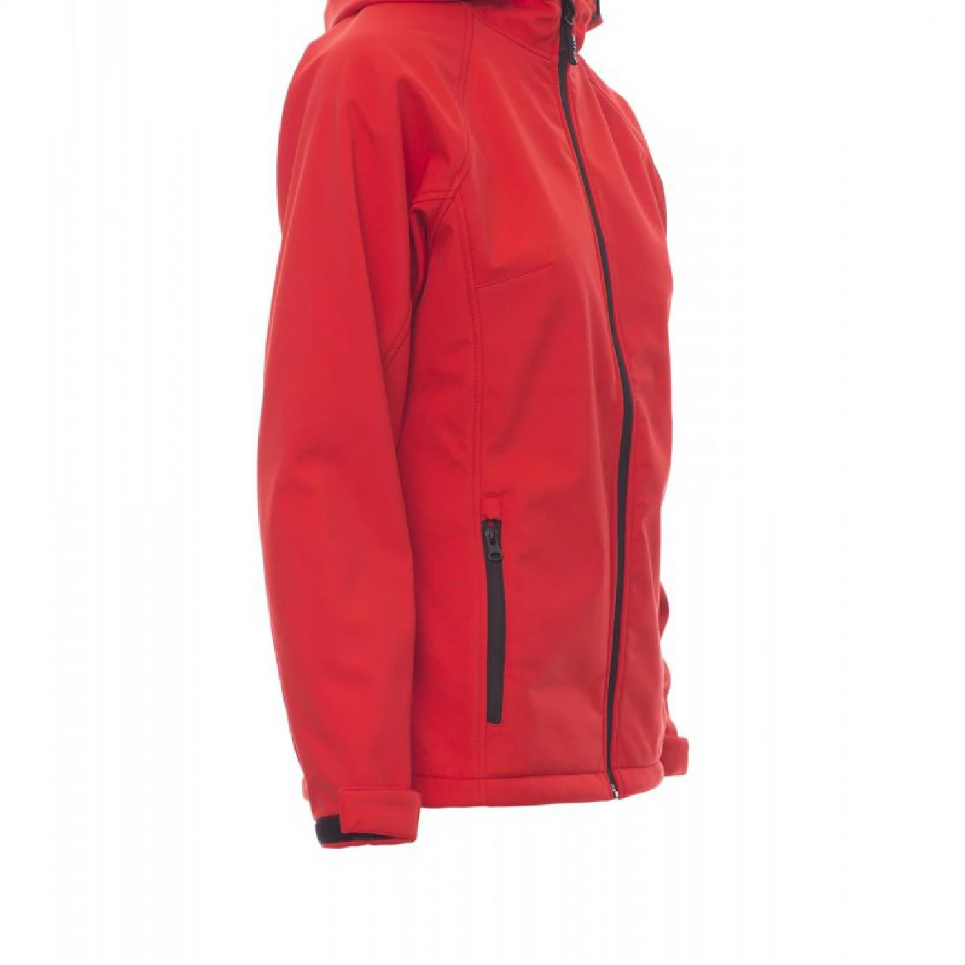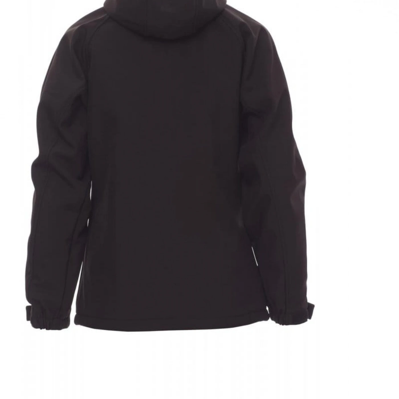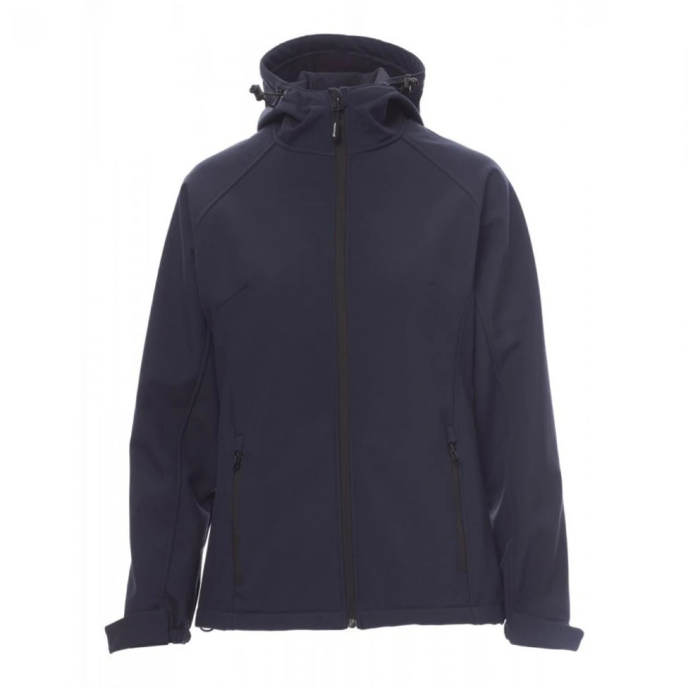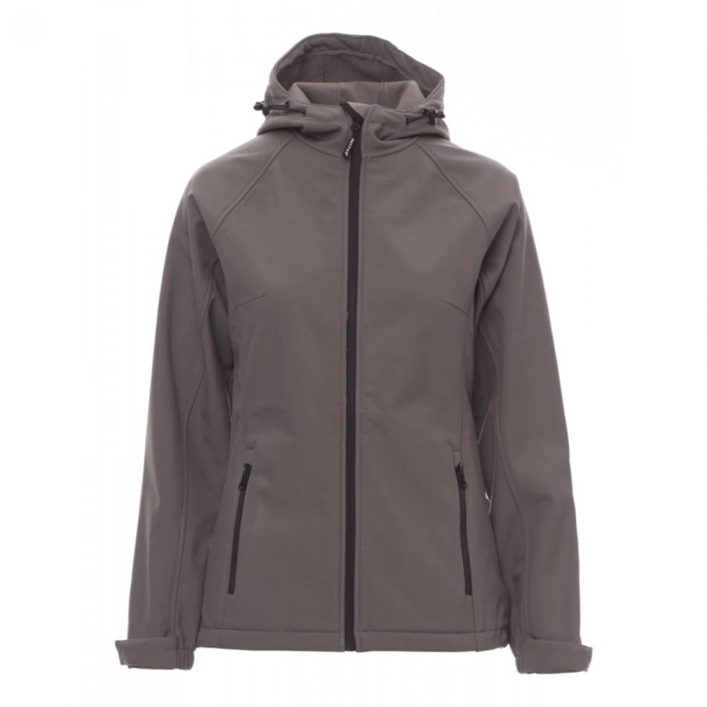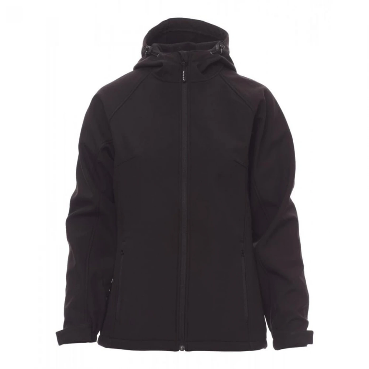 Jacheta softshell pentru femei, cu gluga nedetasabila si care asigura o protectie sporita impotriva vantului (windproof) si impotriva apei (waterproof - WP 8000 mm H₂O, WVT 5000 g/m² 24h). Inchiderea frontala se face cu fermoar lung cu sistem de semiblocare. Are o croiala confortabila si este echipata cu doua buzunare mari in partea din fata, mansete elastice inchise cu velcro si snur in talie. \n