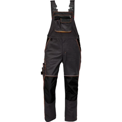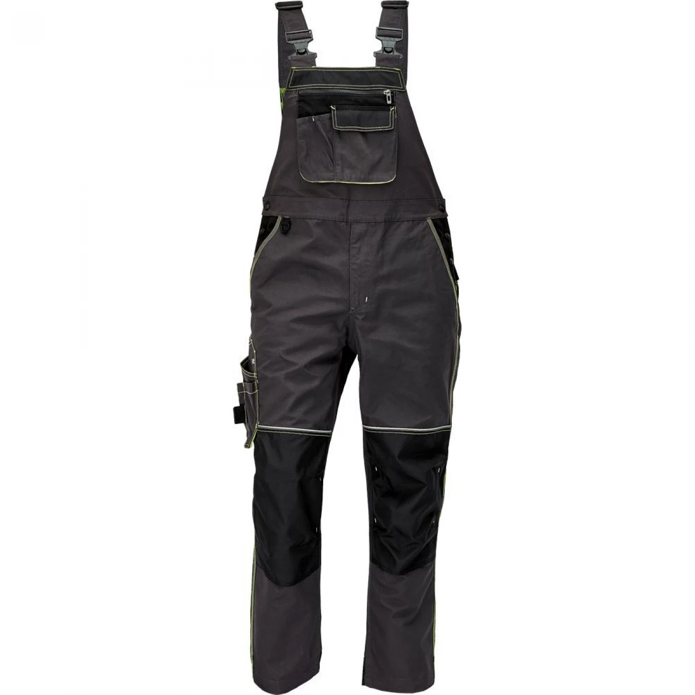 • salopetă de lucru pentru bărbați cu bretele și talie elastice • 2 buzunare laterale • 1 buzunar multifuncțional pe picior • 1 buzunar multifuncționar cu clapă pe piept • inel D pentru atașarea ecusonului de identificare • 2 buzunare cu clapă în partea din spate • întărituri la genunchi cu posibilitate de introducere a unor genunchiere • posibilitate de extindere a lungimii cracului cu 5 cm • întăritură pe dosul părții de jos a cracului • cusături decorative și detalii contrastante în culori cu vizibilitate ridicată.