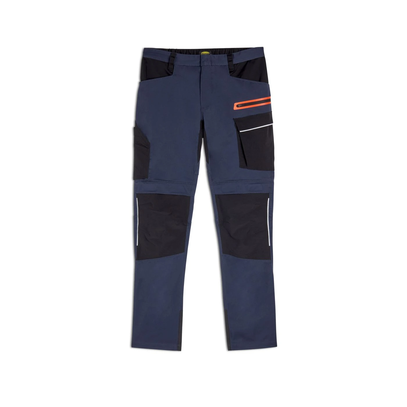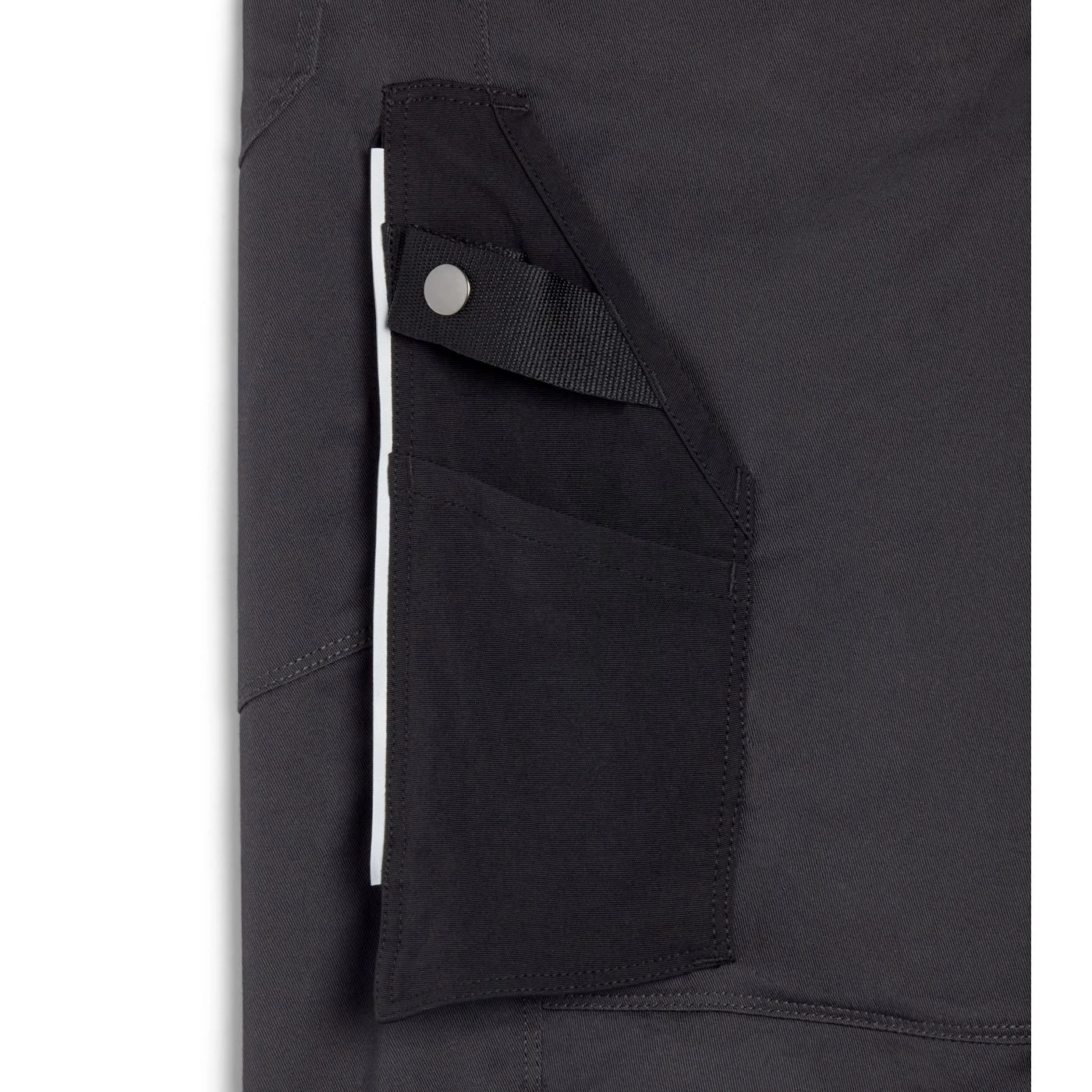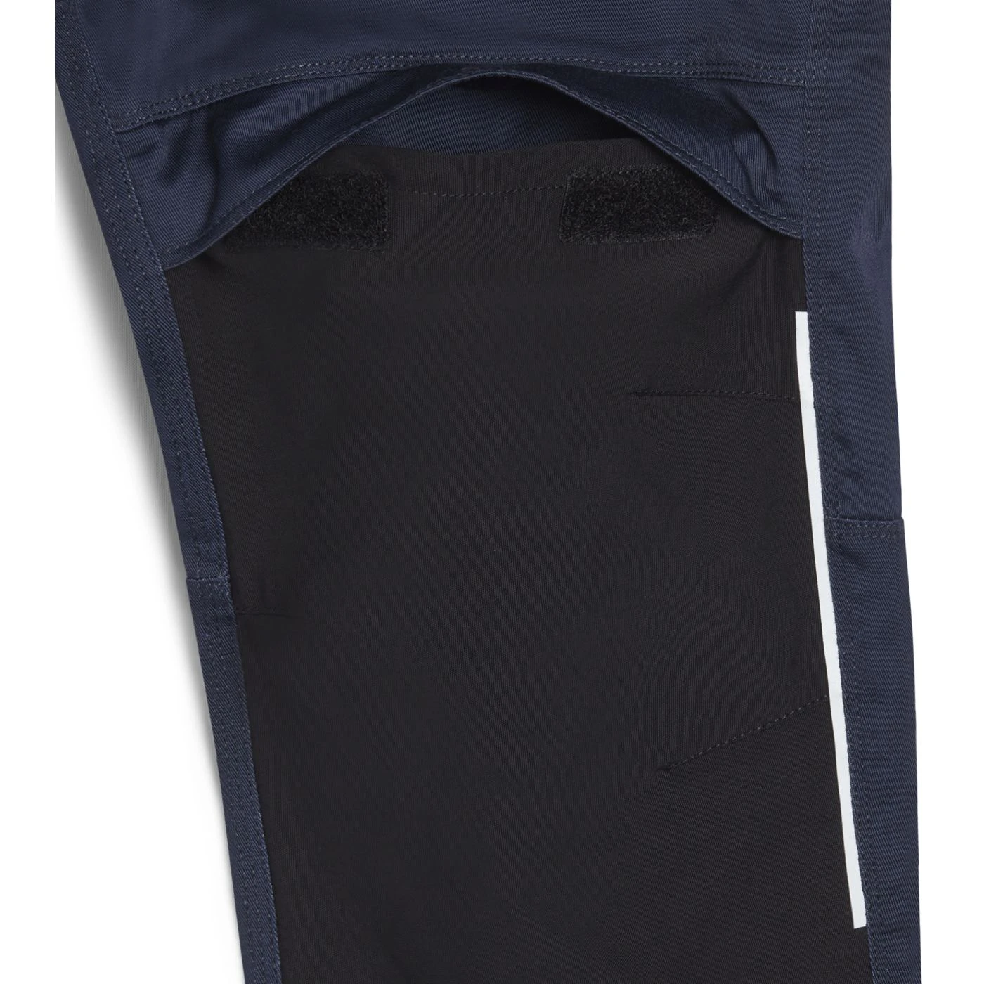 Stretchy mixed-material performance trousers. Elasticated waistband for increased comfort. Two open top pockets. Side pocket with ruler holder, hammer loop and adjustable loop. Side pocket with contrasting-coloured heat-sealed zip and spacious side pocket with Velcro fastening. Knee pad pocket with top opening in abrasion-resistant fabric. Two back pockets. Crotch insert for greater range of movement. Reinforced heel area with abrasion-resistant fabric. Reflective details.