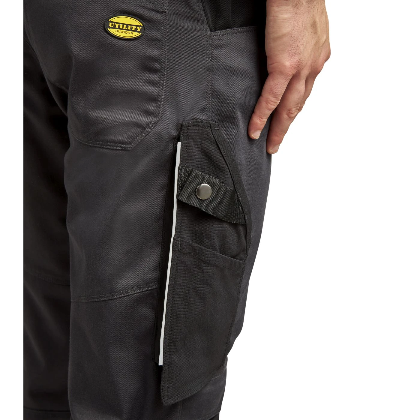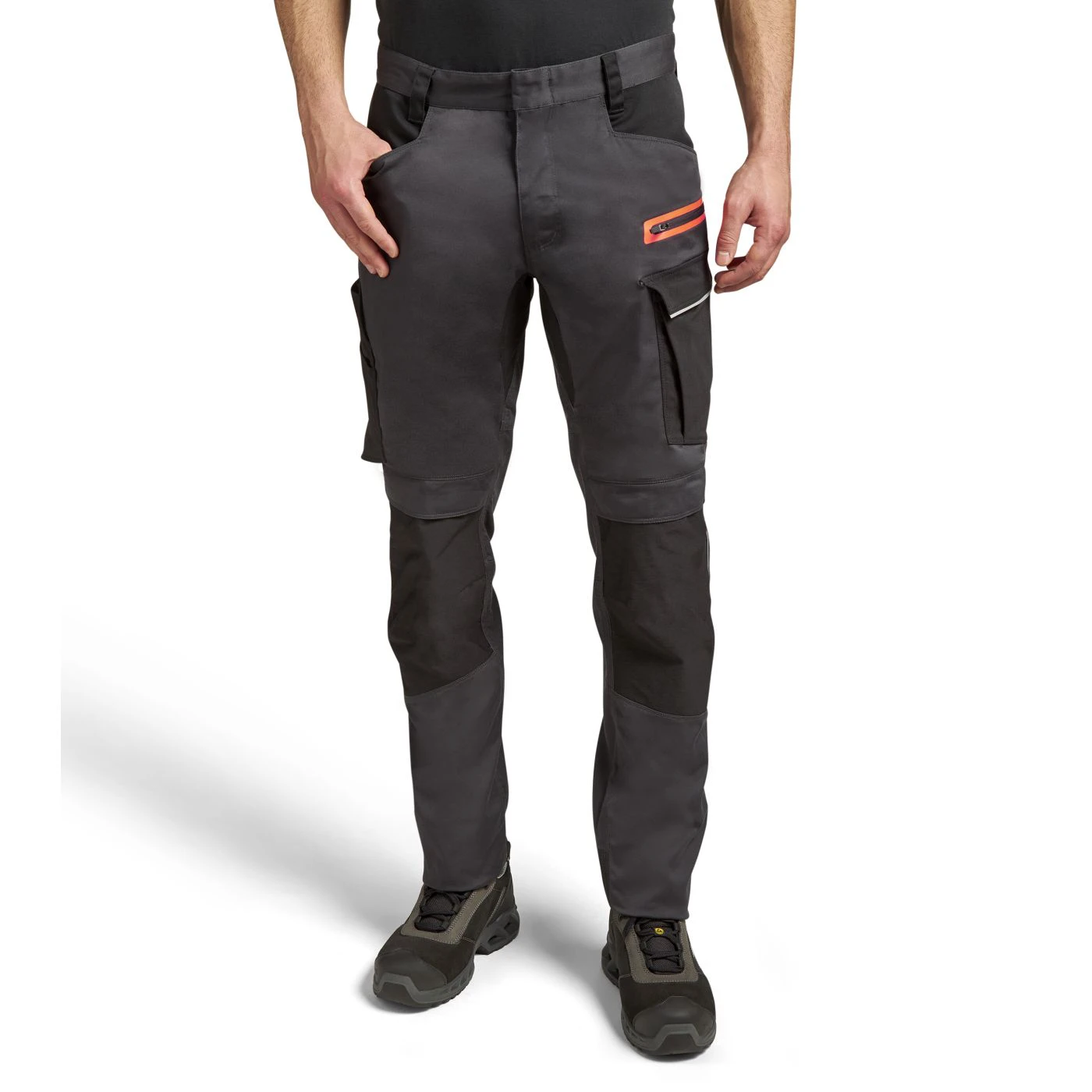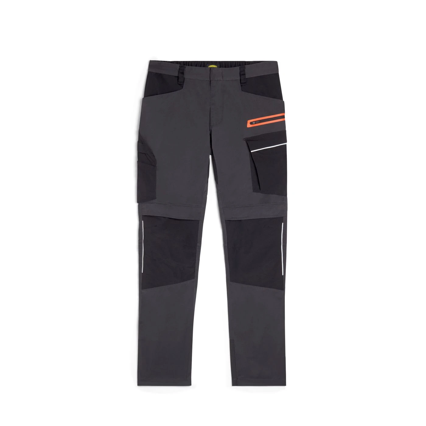 Stretchy mixed-material performance trousers. Elasticated waistband for increased comfort. Two open top pockets. Side pocket with ruler holder, hammer loop and adjustable loop. Side pocket with contrasting-coloured heat-sealed zip and spacious side pocket with Velcro fastening. Knee pad pocket with top opening in abrasion-resistant fabric. Two back pockets. Crotch insert for greater range of movement. Reinforced heel area with abrasion-resistant fabric. Reflective details.