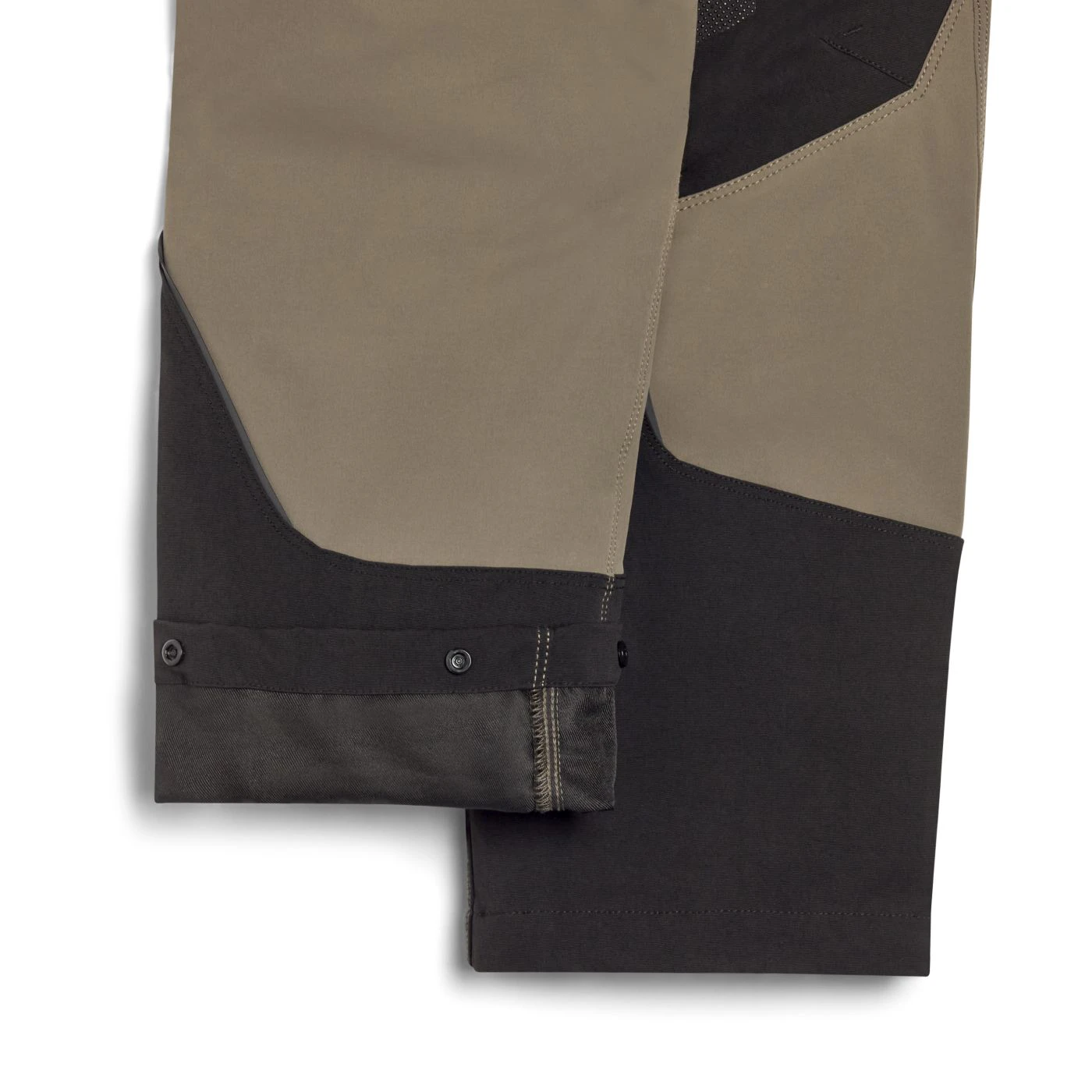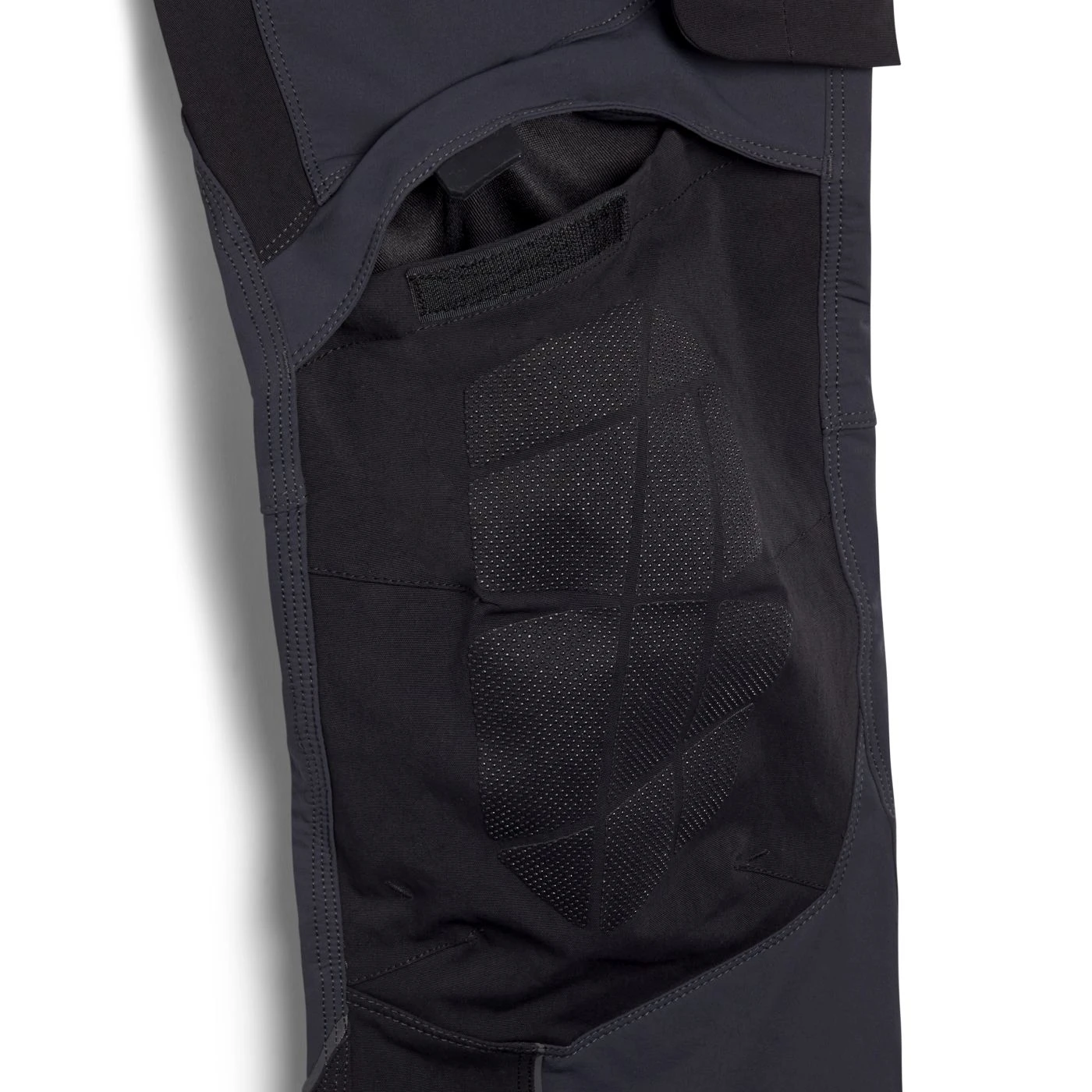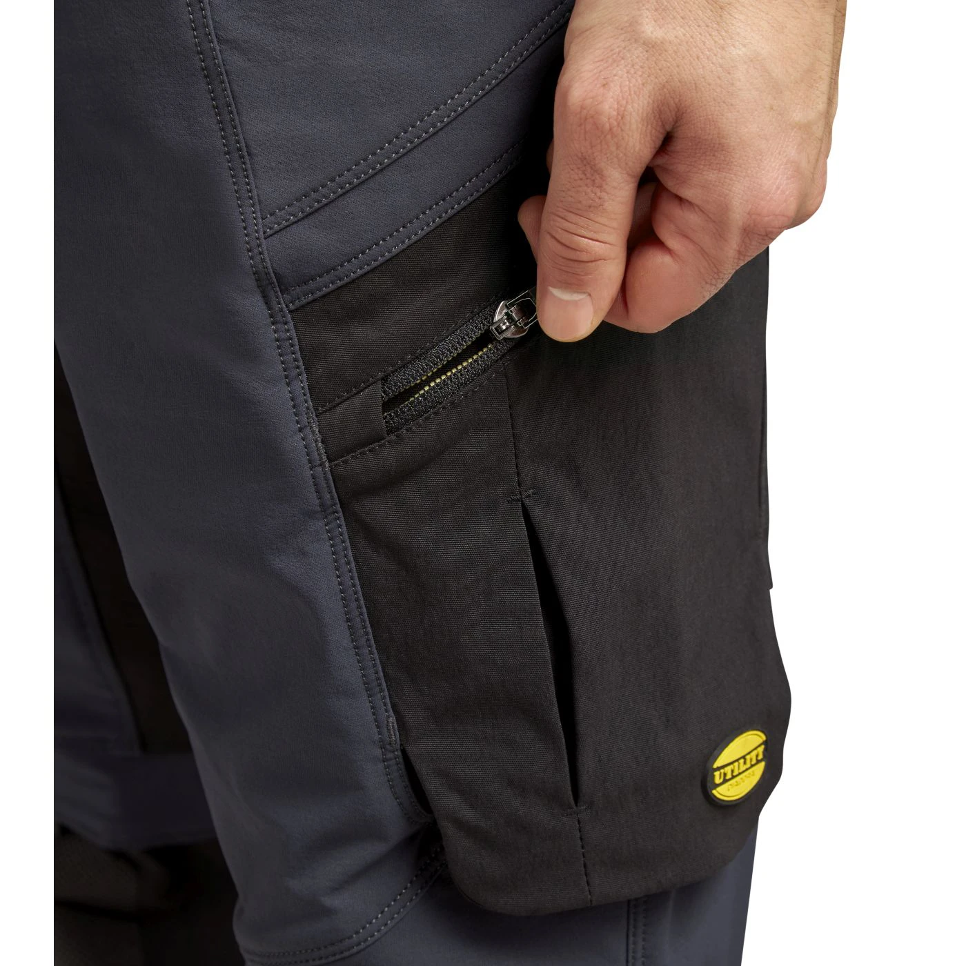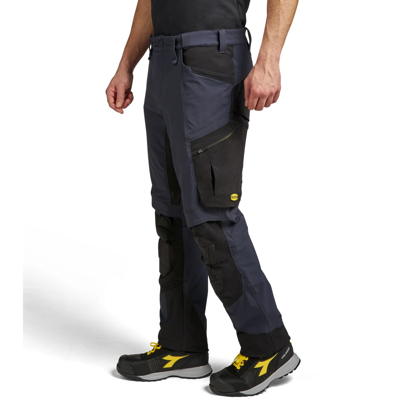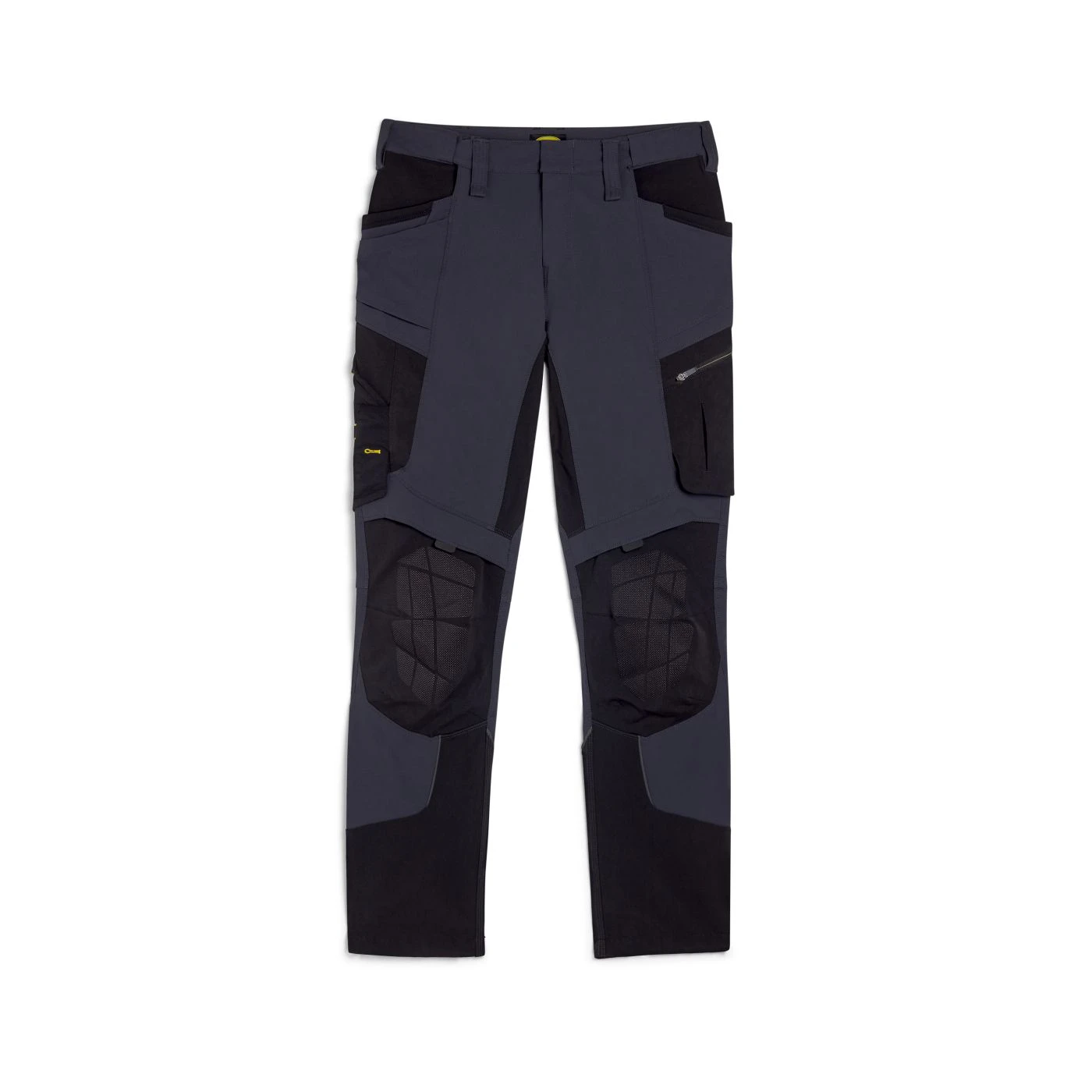 Stretchy mixed-material performance trousers with water-repellent treatment. Contoured waistband with sliding inner elastic for increased comfort and adaptability. Two open top pockets with Ripstop reinforcement and an additional bellow pocket for extra space. Multi-accessory side pocket with ruler holder and adjustable hammer loop. Zipped cargo pocket on the side. Two back pockets with Velcro straps in abrasion-resistant material. Crotch insert for greater range of movement. Knee pad pocket with top opening in abrasion-resistant fabric and a non-slip print. Ergonomic leg and adjustable length with press-stud buttons; heel area with abrasion-resistant material.