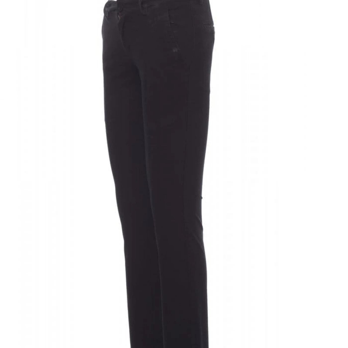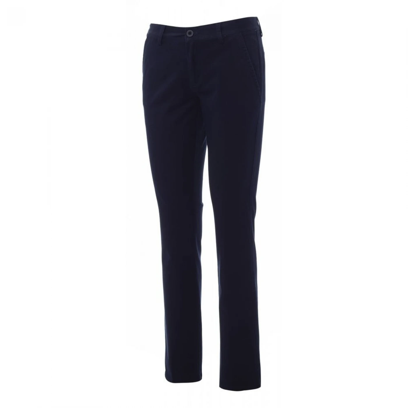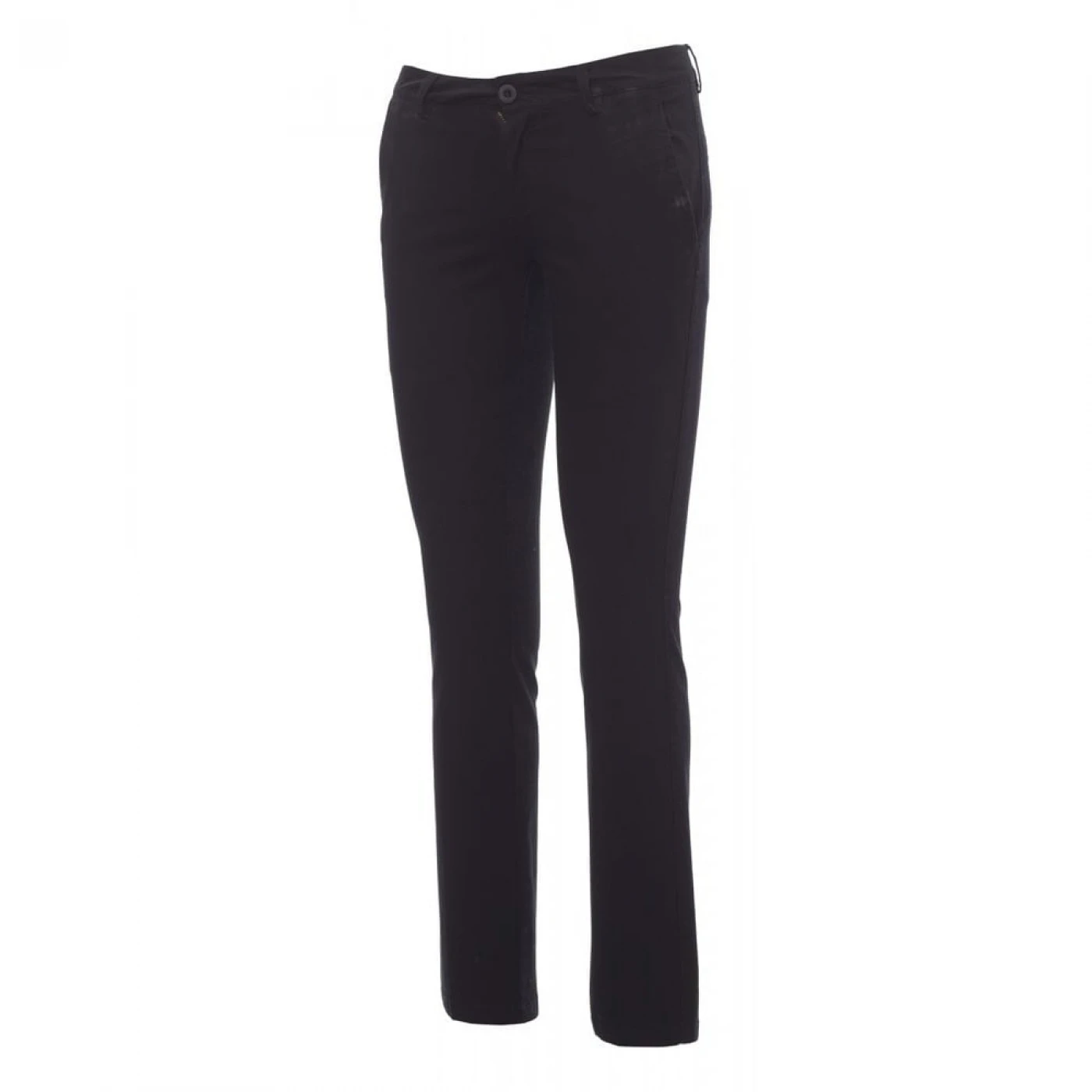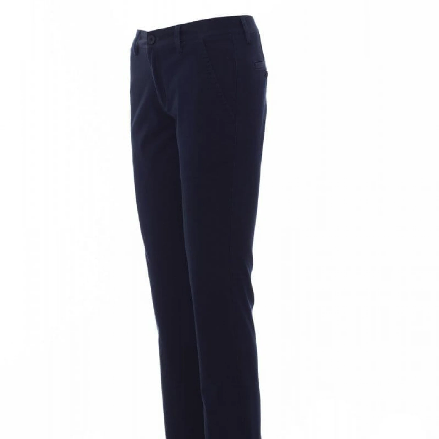 Pantaloni talie pentru femei cu o croiala clasica si confectionati din bumbac pieptănat cu două straturi de înaltă densitate. Au doua buzunare in partea din fata si doua buzunare cu inchidere cu nasture la spate.