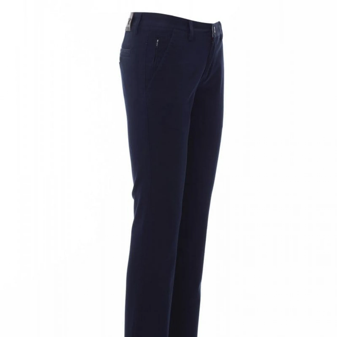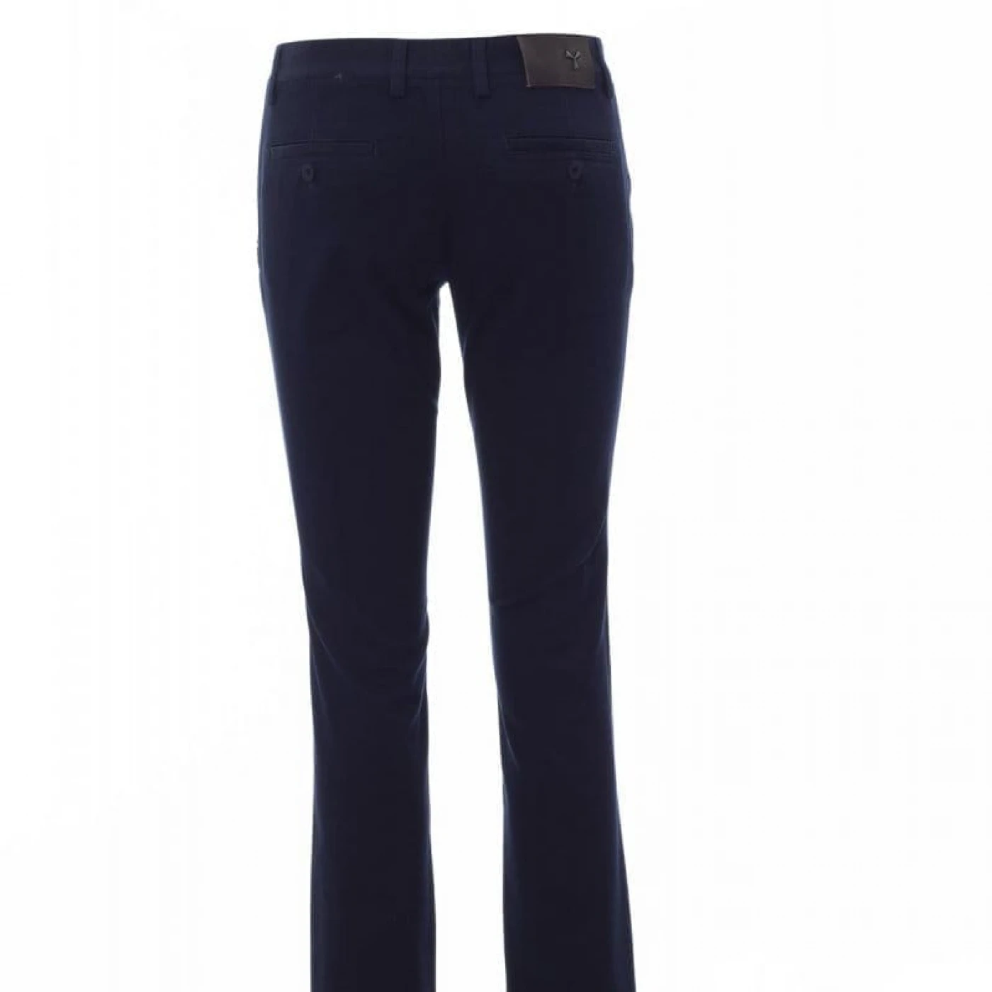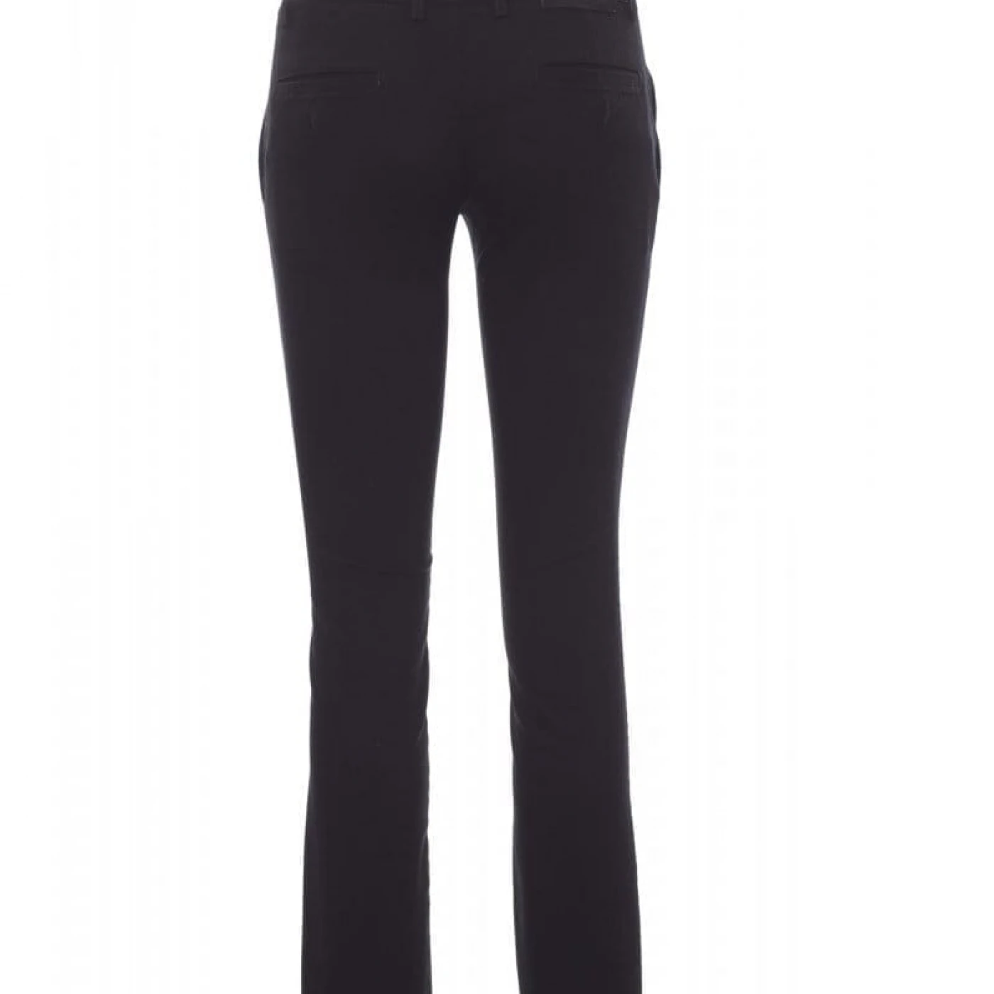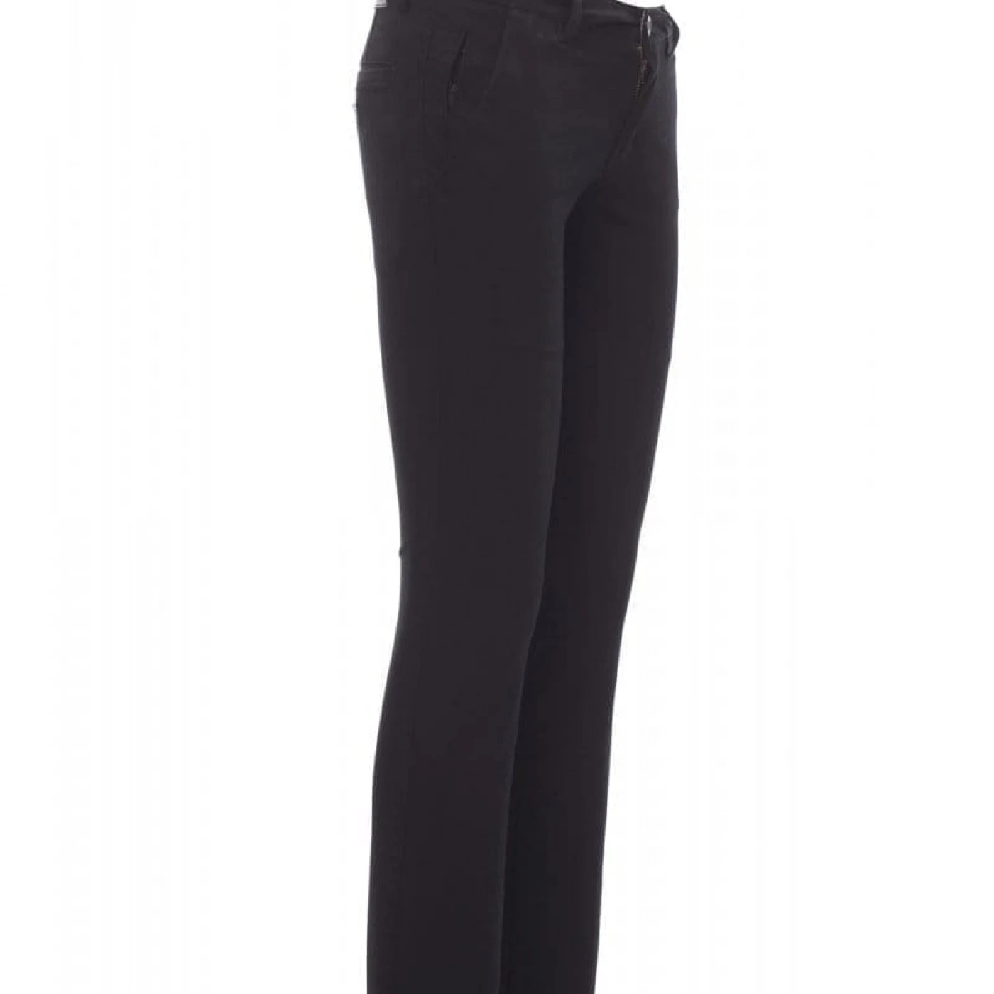 Pantaloni talie pentru femei cu o croiala clasica si confectionati din bumbac pieptănat cu două straturi de înaltă densitate. Au doua buzunare in partea din fata si doua buzunare cu inchidere cu nasture la spate.