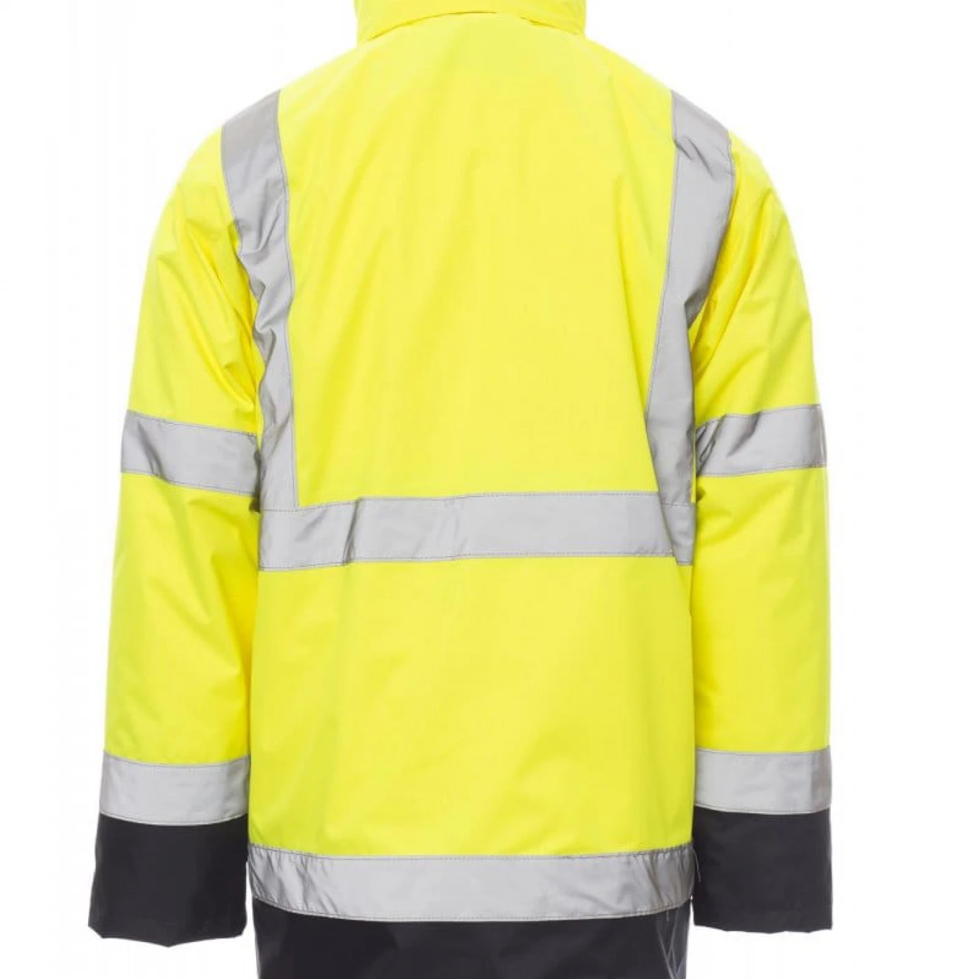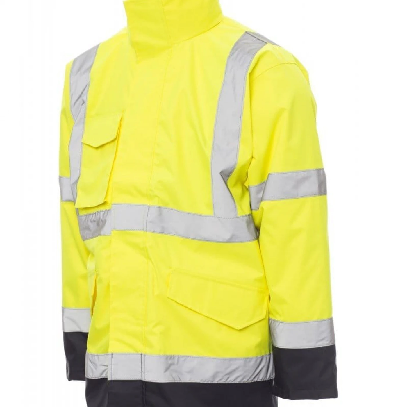 Jacheta de inalta vizibilitate 4 in 1 confectionata din polyester tip Oxford, acoperit cu poliuretan (PU). Jacheta exterioara este fara captuseala, cu gluga rabatabila si deschidere cu fermoar din plastic acoperit de o clapa prinsa cu scai velcro. Partea superioara este fluorescenta iar partea inferioara este de culoarea bleumarin pentru o rezistenta mai mare la murdarie. Vizibilitatea sporita se datoreaza benzilor reflectorizante verticale din zona pieptului si benzilor reflectorizante verticale in zona bratelor si in zona inferioara a jachetei. Jacheta interioara detasabila este captusita, are maneci detasabile iar deschiderea se face cu ajutorul unui fermoar din plastic. Atat jacheta exterioara cat si cea interioara au o echipare generoasa din punct de vedere al depozitarii, cu buzunare multiple exterioare si interioare. \n