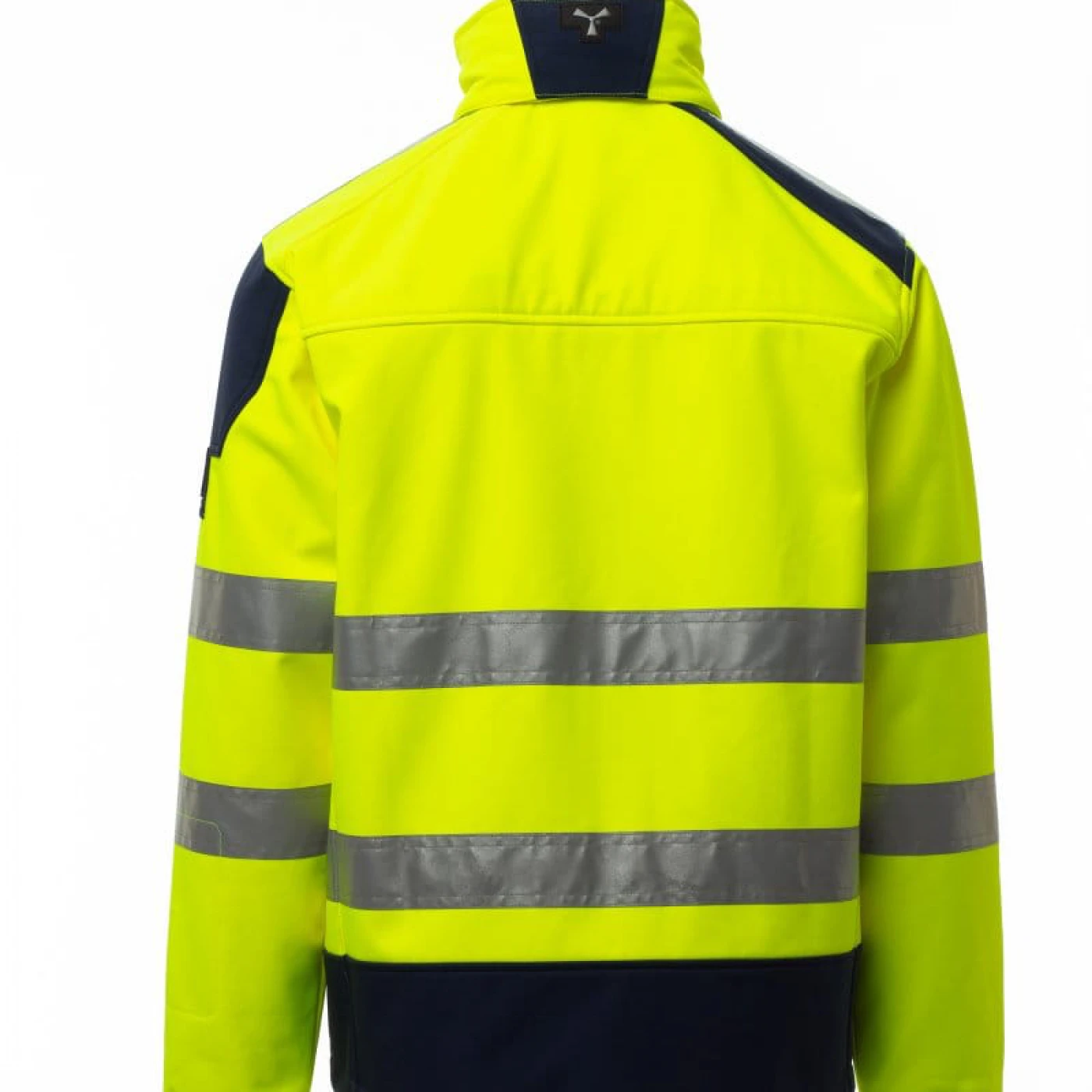 Jacheta softshell de inalta vizibilitate pentru barbati care asigura o protectie sporita impotriva vantului (windproof) si impotriva apei (waterproof - WP 8000 mm H₂O, WVT 5000 g/m² 24h). Are o croiala ergonomica, in doua tonuri de culoare, inchidere frontala cu fermoar si mansete elastice cu inchidere cu scai velcro. Echipata cu o gluga pliabila, doua buzunare frontale si un buzunar la piept, toate cu inchidere cu fermoar. Vizibilitatea sporita se datoreaza benzilor orizontale reflectorizante 3M. \n