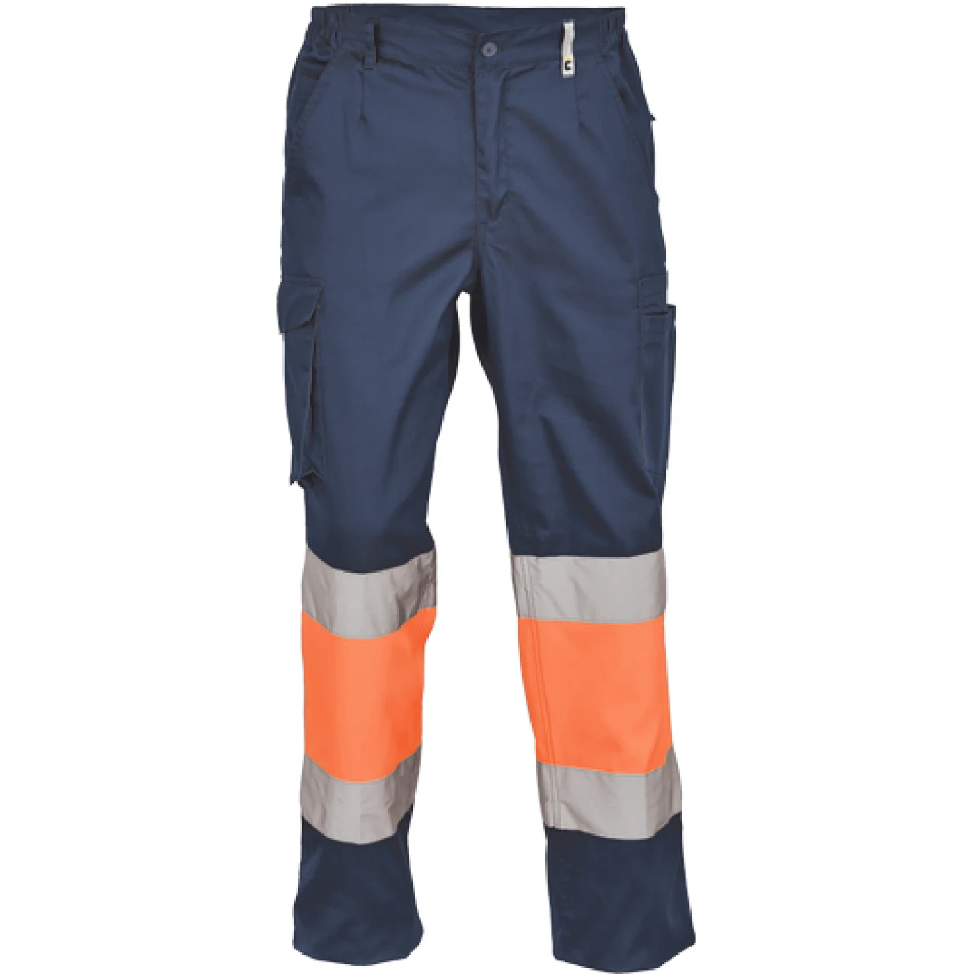 Pantaloni de lucru pentru bărbaţi în combinaţie cu o parte cu vizibilitate ridicată și dungi reflectorizante de 7 cm lăţime, 2 buzunare laterale + 1 buzunar pentru monede, 2 buzunare laterale pe picior, 2 buzunare la spate, talie elastică, posibilitate de extindere a lungimii cracului
