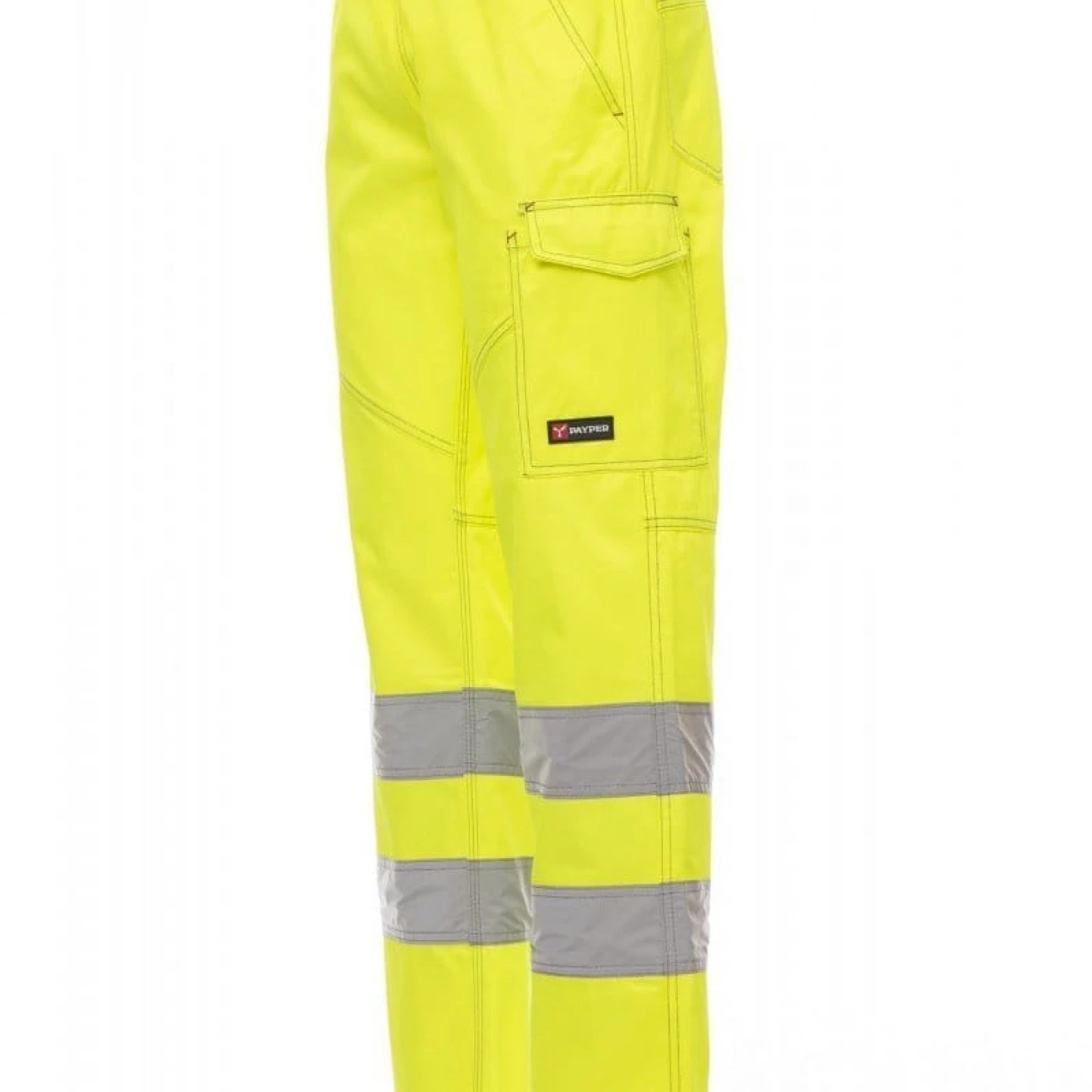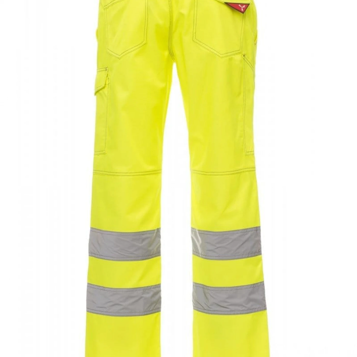 Pantaloni talie de înaltă vizibilitate pentru barbati, in doua tonuri de culoare si confectionati dintr-un material de tip twill in compozitie de 50% bumbac si 50% poliester. Inchidere frontala cu fermoar si nasture din plastic, echipati cu doua buzunare clasice in fata, un buzunar lateral LOCK SYSTEM, doua buzunare la spate, din care unul deschis si unul inchis cu clapa si velcro. Beneficiaza de dungi reflectorizante in dreptul genunchiului si cusături triple contrastante pe interiorul piciorului. \n