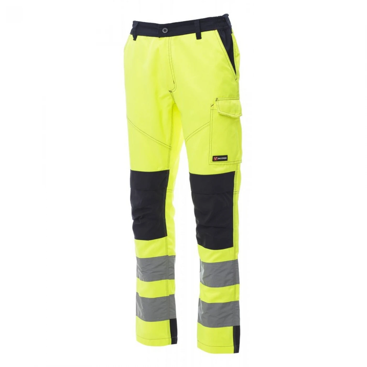 Pantaloni talie de înaltă vizibilitate pentru barbati, in doua tonuri de culoare si confectionati dintr-un material de tip twill in compozitie de 50% bumbac si 50% poliester. Inchidere frontala cu fermoar si nasture din plastic, echipati cu doua buzunare clasice in fata, un buzunar lateral LOCK SYSTEM, doua buzunare la spate, din care unul deschis si unul inchis cu clapa si velcro. Beneficiaza de intarituri in zona genunchiului si suport pentru genunchiere. Au dungi reflectorizante sub genunchi si cusături triple contrastante pe interiorul piciorului pentru o rezistenta sporita. \n