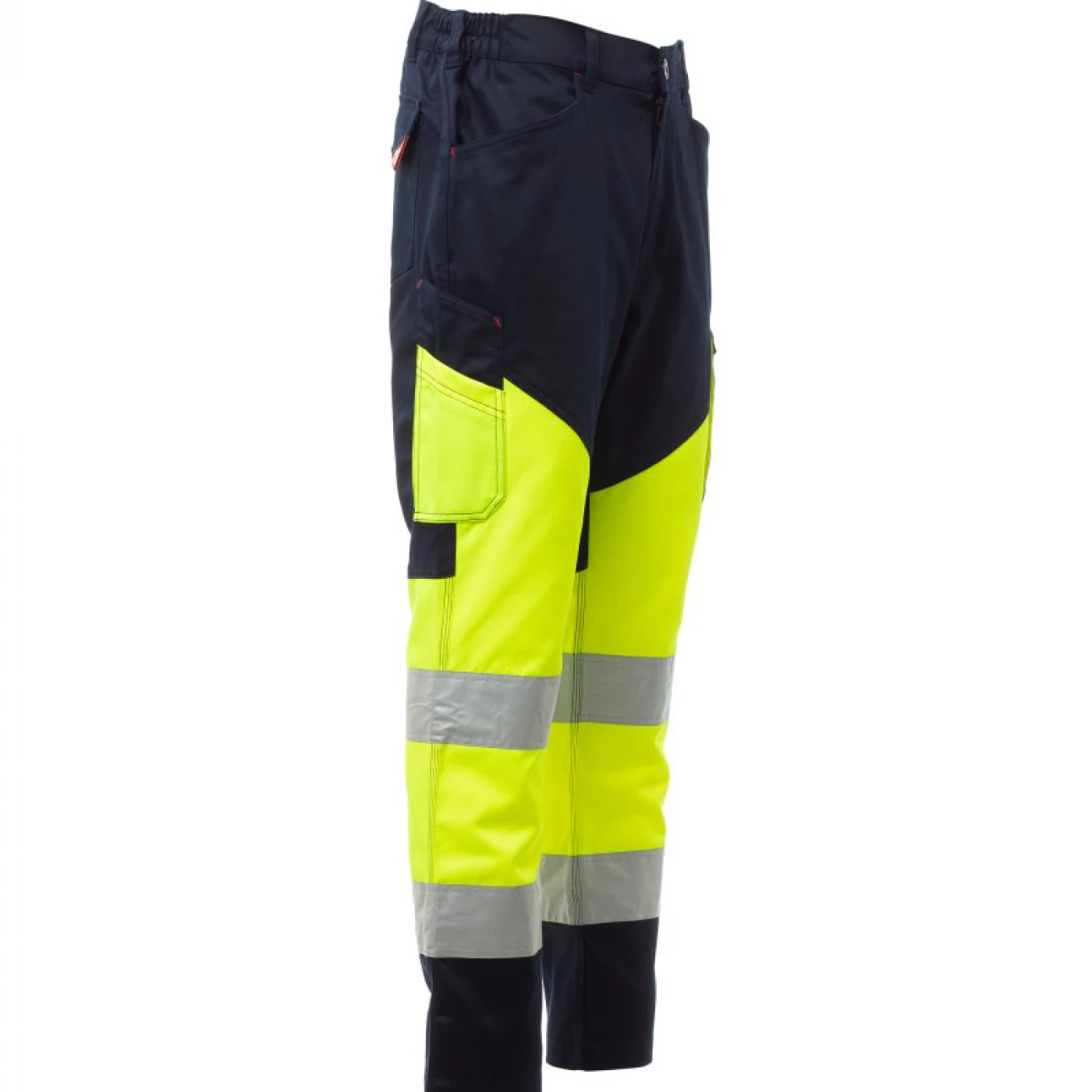 Pantaloni talie unisex de inalta vizibilitate, in doua tonuri de culoare, croiala regular fit si confectionati dintr-un amestec de tip stretch din polyester si bumbac cu o greutate de 250 gr/m2. Inchidere frontala cu fermoar si in talie cu nasture din plastic si curea. Beneficiaza de o echipare generoasa pentru depozitare, cu doua buzunare clasice frontale si unul pe pe picior cu inchidere cu clapeta si doua buzunare la spate, unul deschis cu dungi reflectorizante si unul inchis cu clapeta si scai velcro. Cusaturi triple in ton cu materialul contrastant. \n