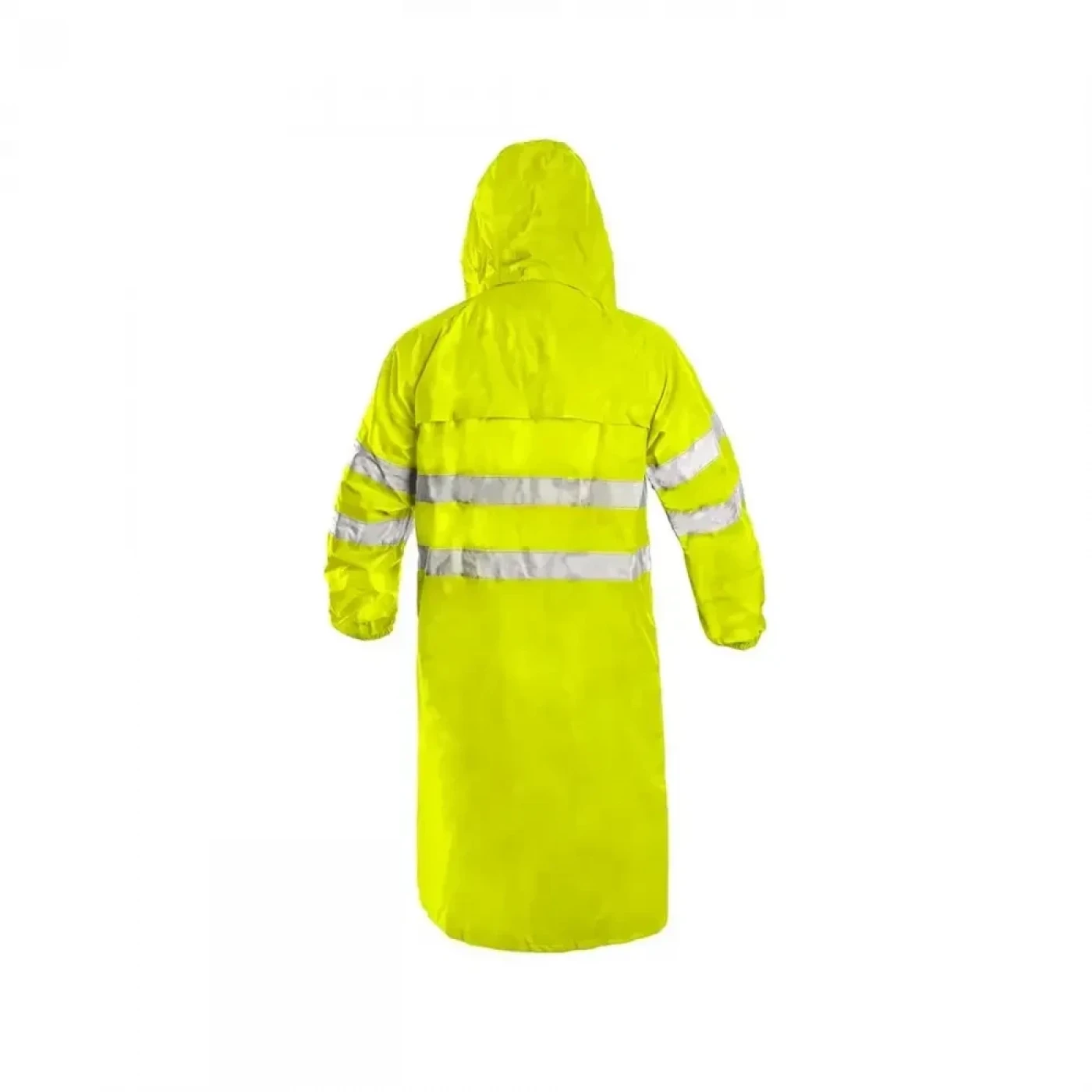 Pelerină de înaltă vizibilitate cu benzi reflectorizante, impermeabil, cu cusături lipite, glugă detașabilă ascunsă în guler, închidere cu fermoar acoperit de garnitură, mâneci raglan cu manșete elastice, două buzunare inferioare cu clapetă, ventilație pe spate și la subraț. Pardesiul este pliat într-un ambalaj practic cu fermoar. Lungime 120 cm.