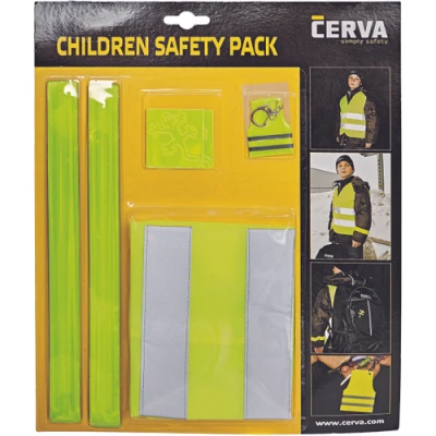 Set de avertizare: vestă de avertizare, benzi de avertizare, autocolant de avertizare, inel port chei cu avertizor. Îmbrăcăminte de avertizare cu mare vizibilitate. Îmbrăcămintea este potrivită pentru copiii peste 3 ani (120 - 140 cm inaltime) se poartă peste haine, pentru alertă vizuală de prezenţă a utilizatorului pe parcursul zilei dar şi a nopţii. EN 1150