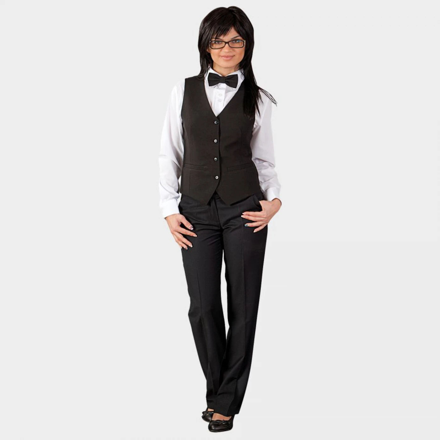 Vestă pentru dame, spate din gabardină, închidere cu trei nasturi, două buzunare cu file în față, legături de ajustare în talie plasate pe spatele vestei.
