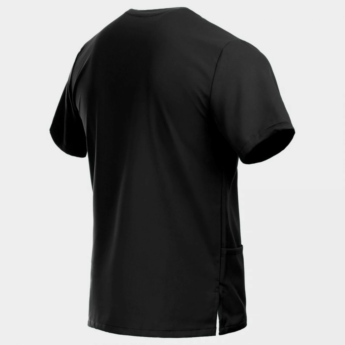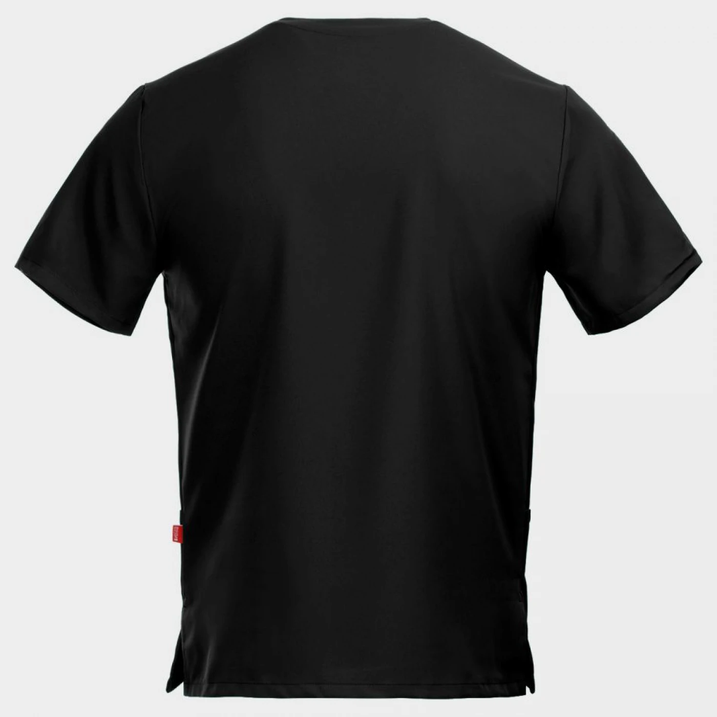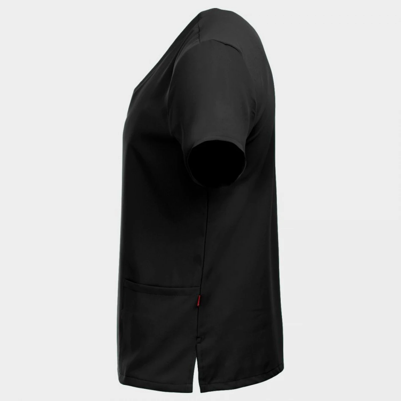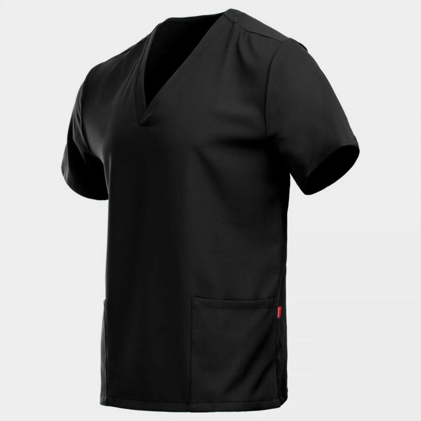 Tunică cu mâneci scurte, decolteu în forma V și fante laterale, două buzunare exterioare inferioare cusute, unul buzunar are în interior un mai mic. Material hidrofug, rezistent la pete, antibacterian, respirabil. Croială liberă.
