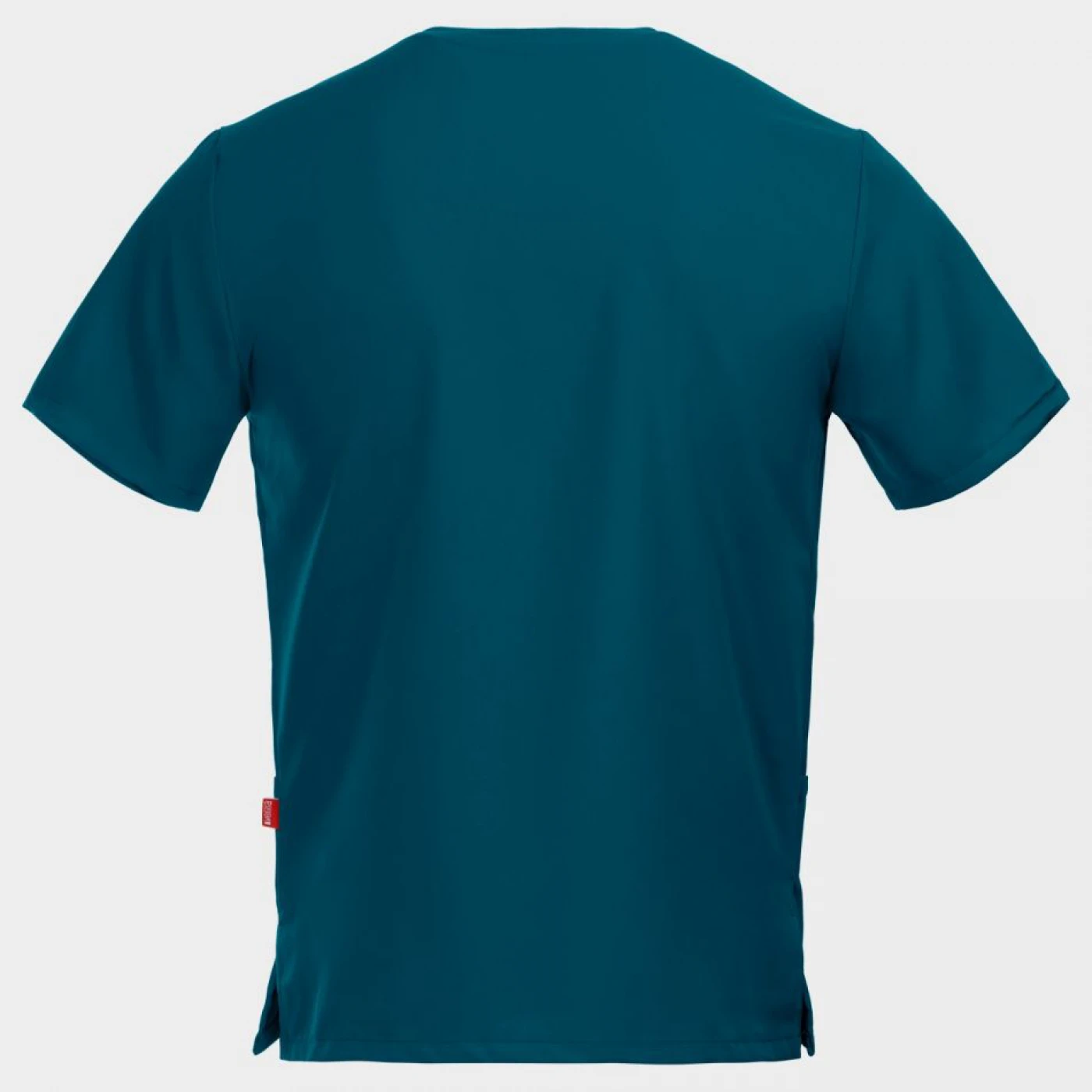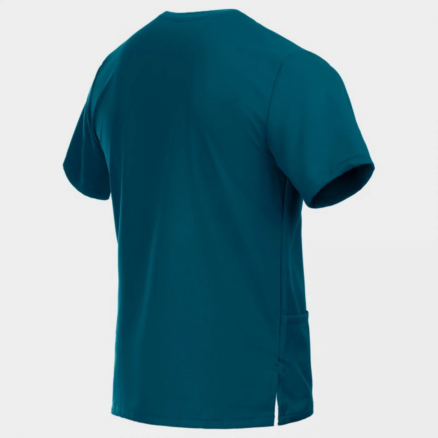 Tunică cu mâneci scurte, decolteu în forma V și fante laterale, două buzunare exterioare inferioare cusute, unul buzunar are în interior un mai mic. Material hidrofug, rezistent la pete, antibacterian, respirabil. Croială liberă.