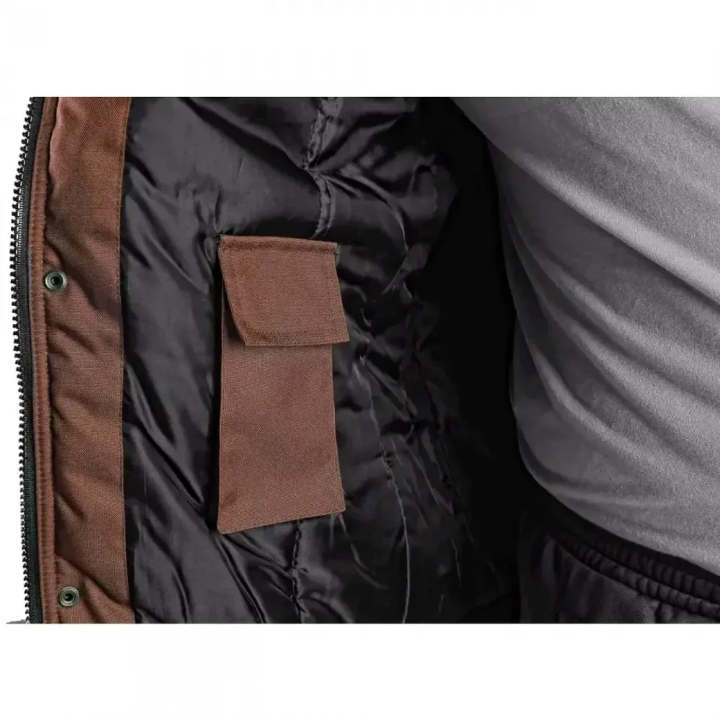 Geacă matlasată, pentru bărbați, 2 în 1, cu fermoar acoperit de garnitură, glugă detașabilă, guler din fleece, mâneci detașabile, mâneci cu manșete reglabile, buclă din plastic sub buzunarul drept de pe piept, ajustare în partea de jos, cusături lipite, accesorii reflectorizante.