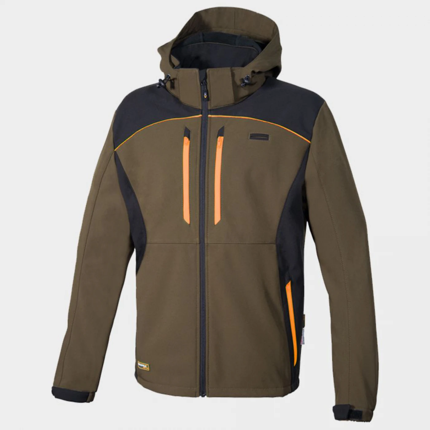 Jachetă softshell de iarnă cu membrană rezistentă la vânt COFRA-TEX. Căptușeală interioară din lână. Două buzunare laterale cu fermoar, două buzunare largi la piept cu fermoar și compartiment pentru radio, buzunar la spate cu fermoar. Glugă reglabilă și detașabilă, manșete reglabile cu velcro. MATERIAL: 94% poliester, 6% elastan + membrana COFRA-TEX + fleece 100% poliester