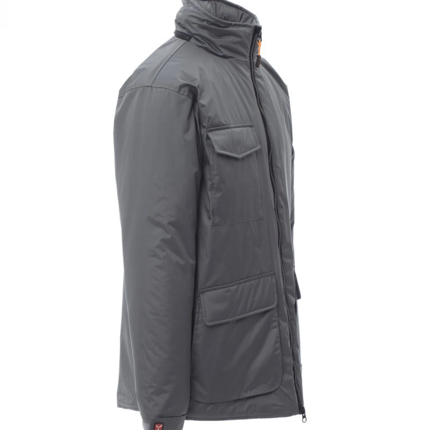 Jacheta unisex 3/4 cu captuseala vatuita la interior, confectionata din 100%. Echipata cu gluga pliabila, doua buzunare frontale cu sistem de inchidere Lock System, doua buzunare laterale si un buzunar la piept, inchise cu clapeta. Mansetele sunt elastice, ajustabile cu banda velcro.