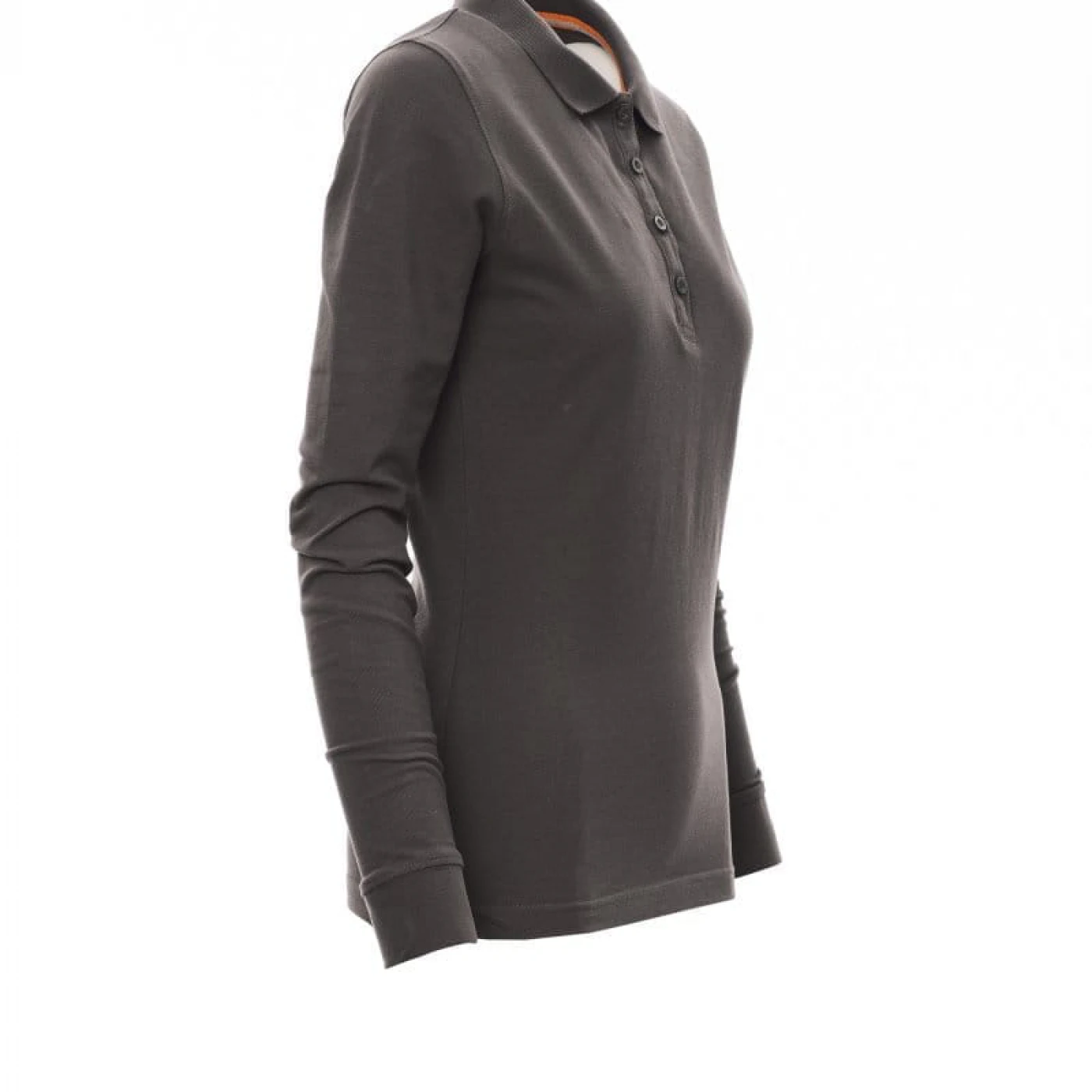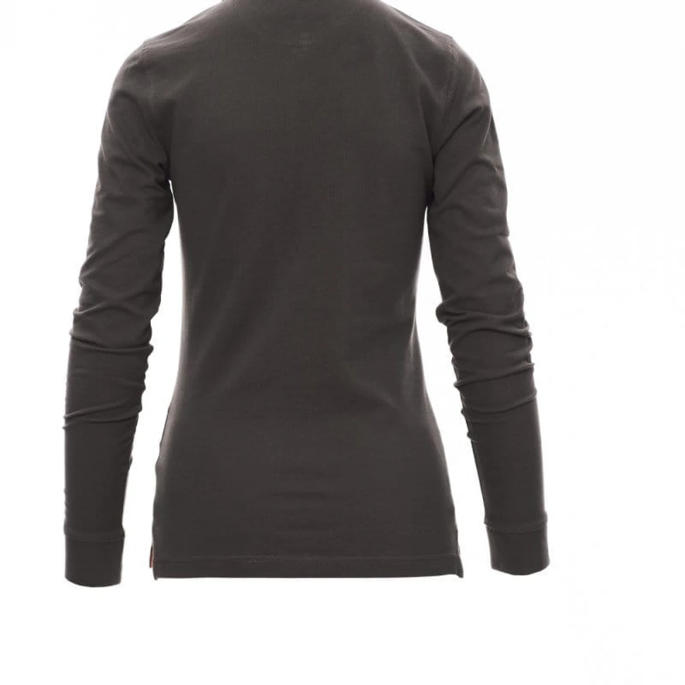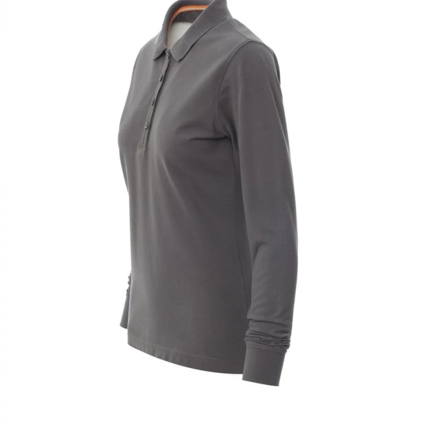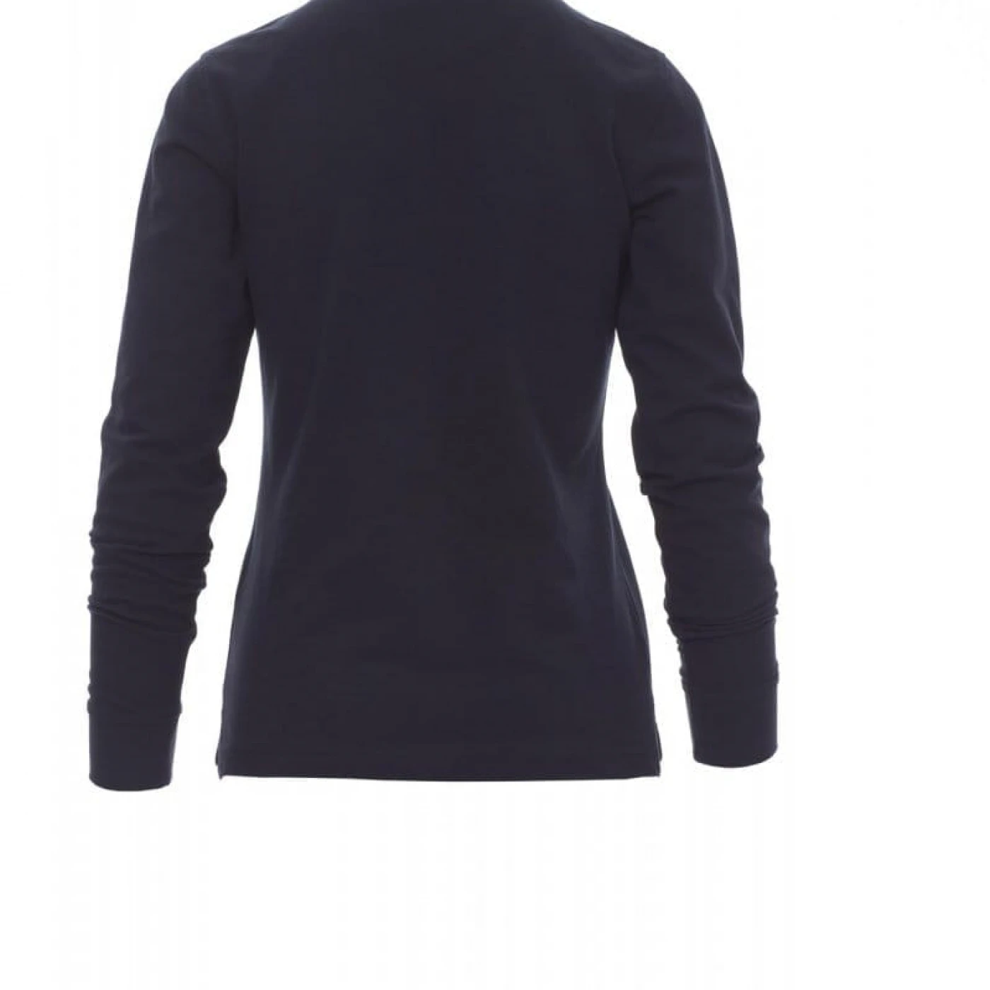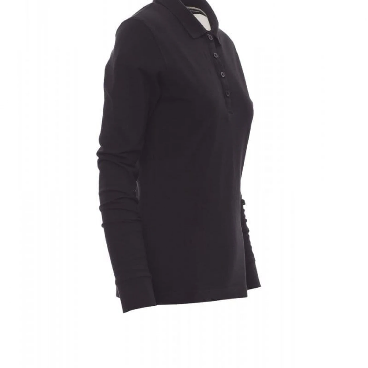 Tricou polo cu maneca lunga pentru femei confectionat din 100% bumbac pique. Gulerul si mansetele sunt intarite si cu cusaturi ascunse. Inchiderea la baza gatului se face cu ajutorul a trei nasturi sidefati in culoarea materialului de baza. \n