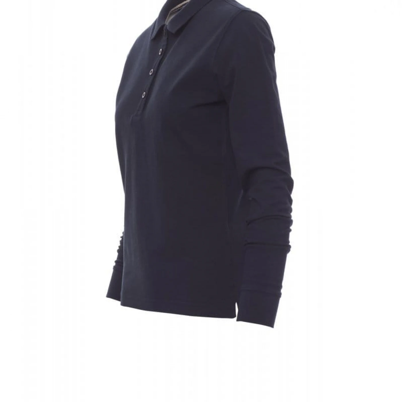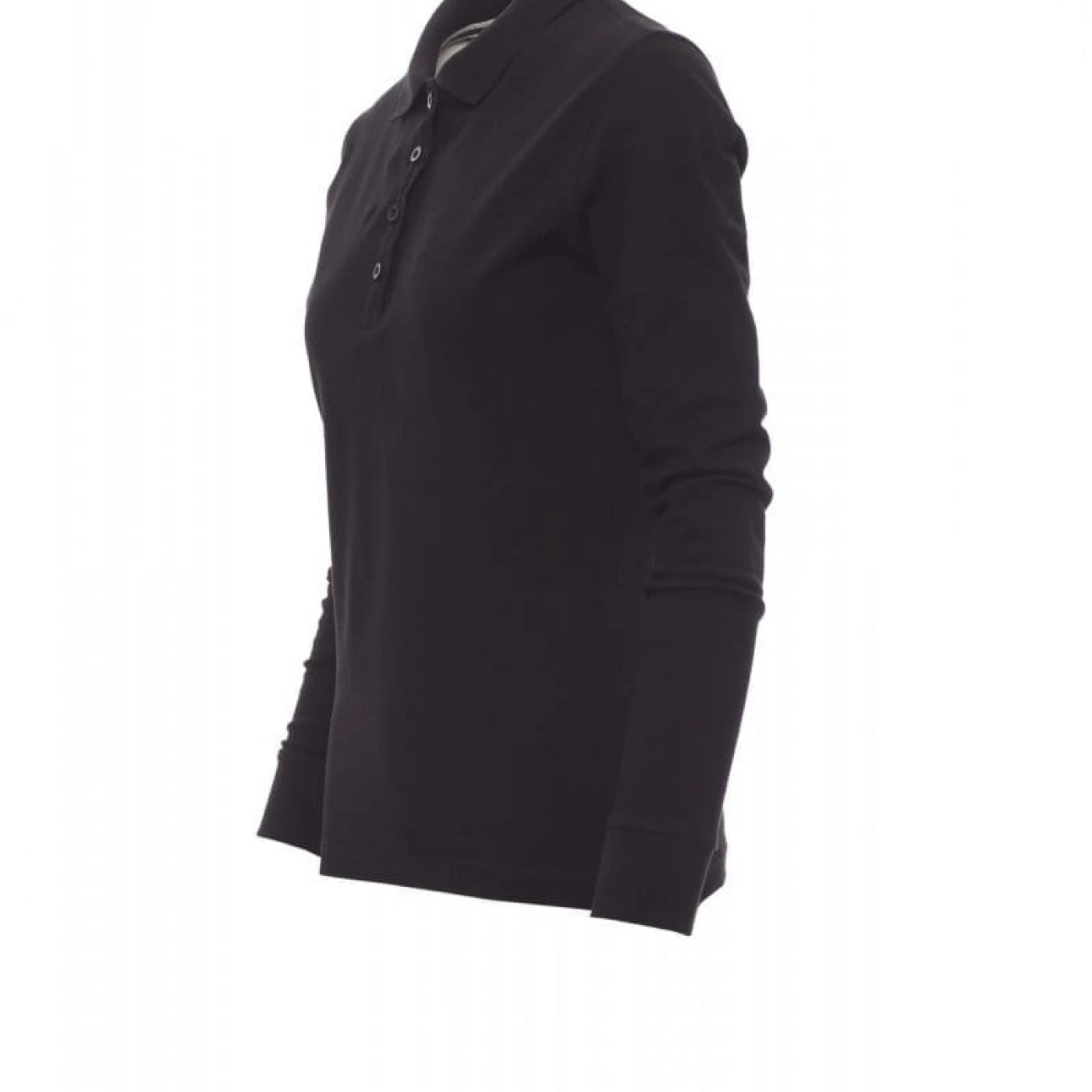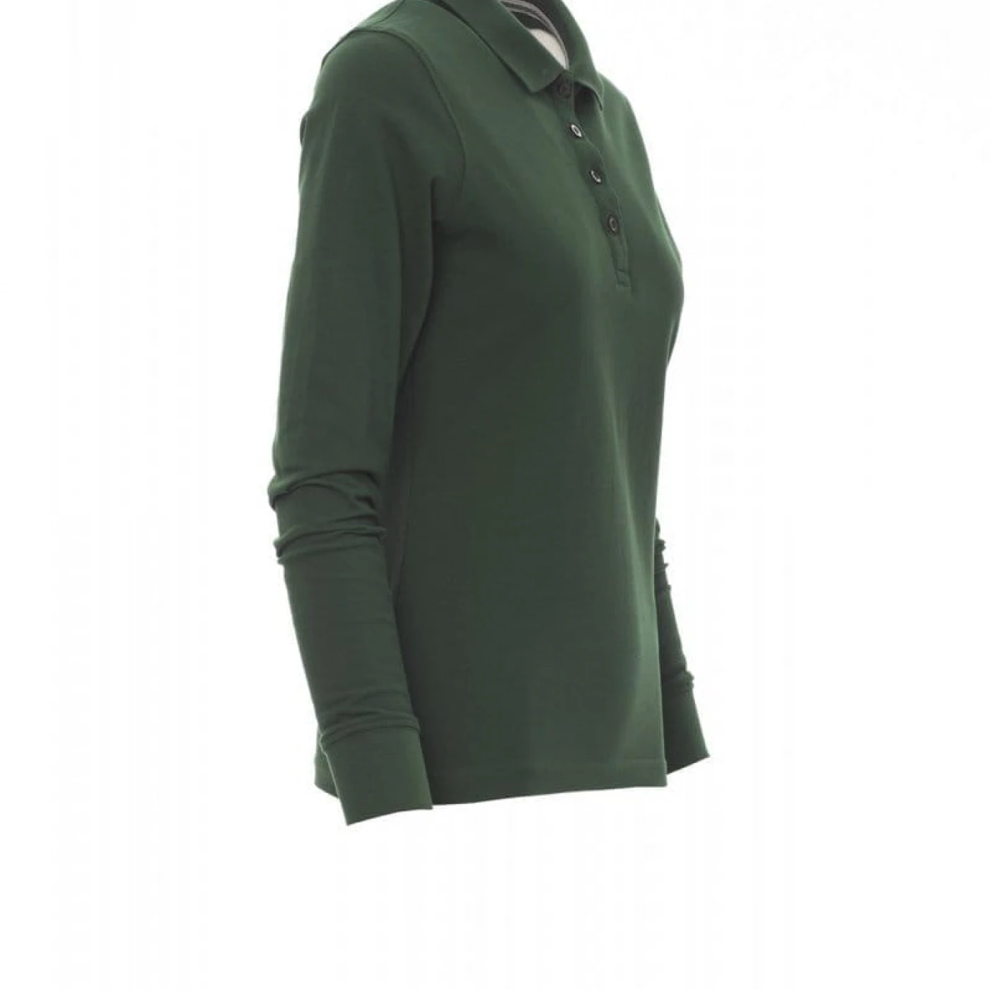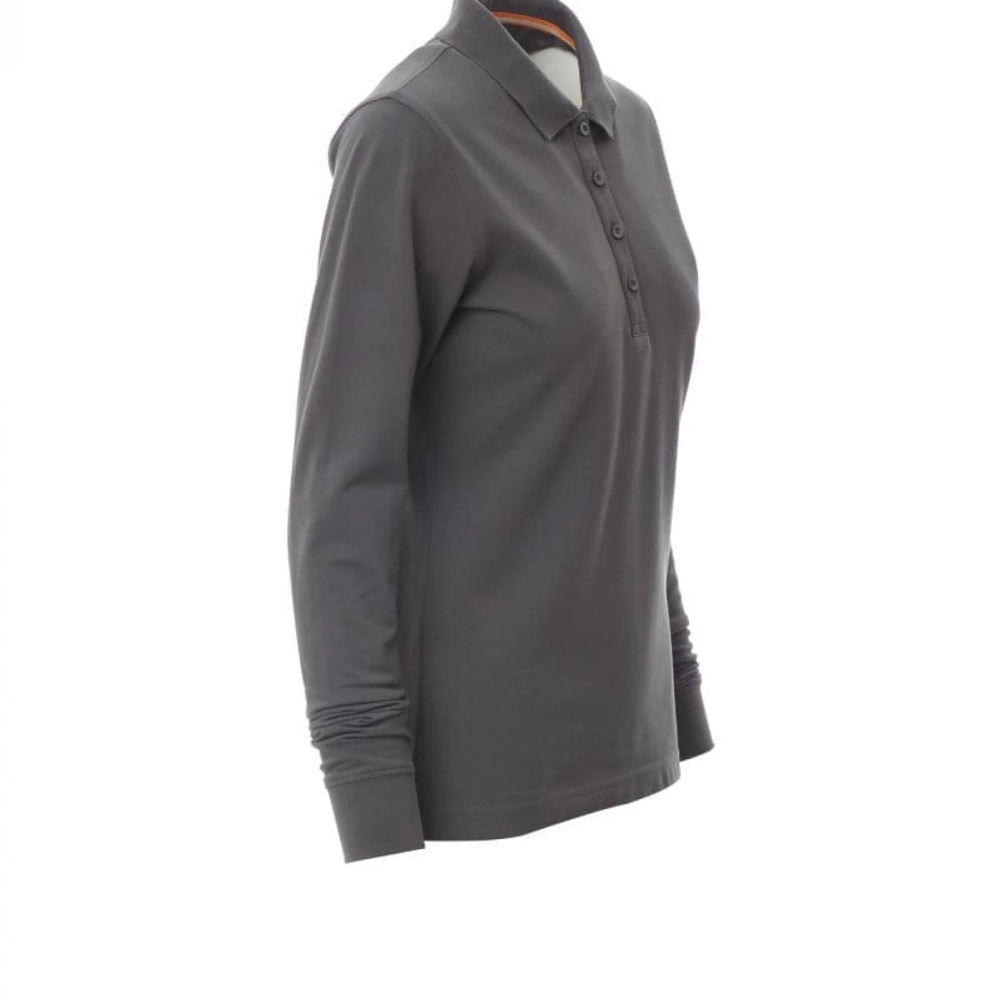Tricou polo cu maneca lunga pentru femei confectionat din 100% bumbac pique. Gulerul si mansetele sunt intarite si cu cusaturi ascunse. Inchiderea la baza gatului se face cu ajutorul a trei nasturi sidefati in culoarea materialului de baza. \n