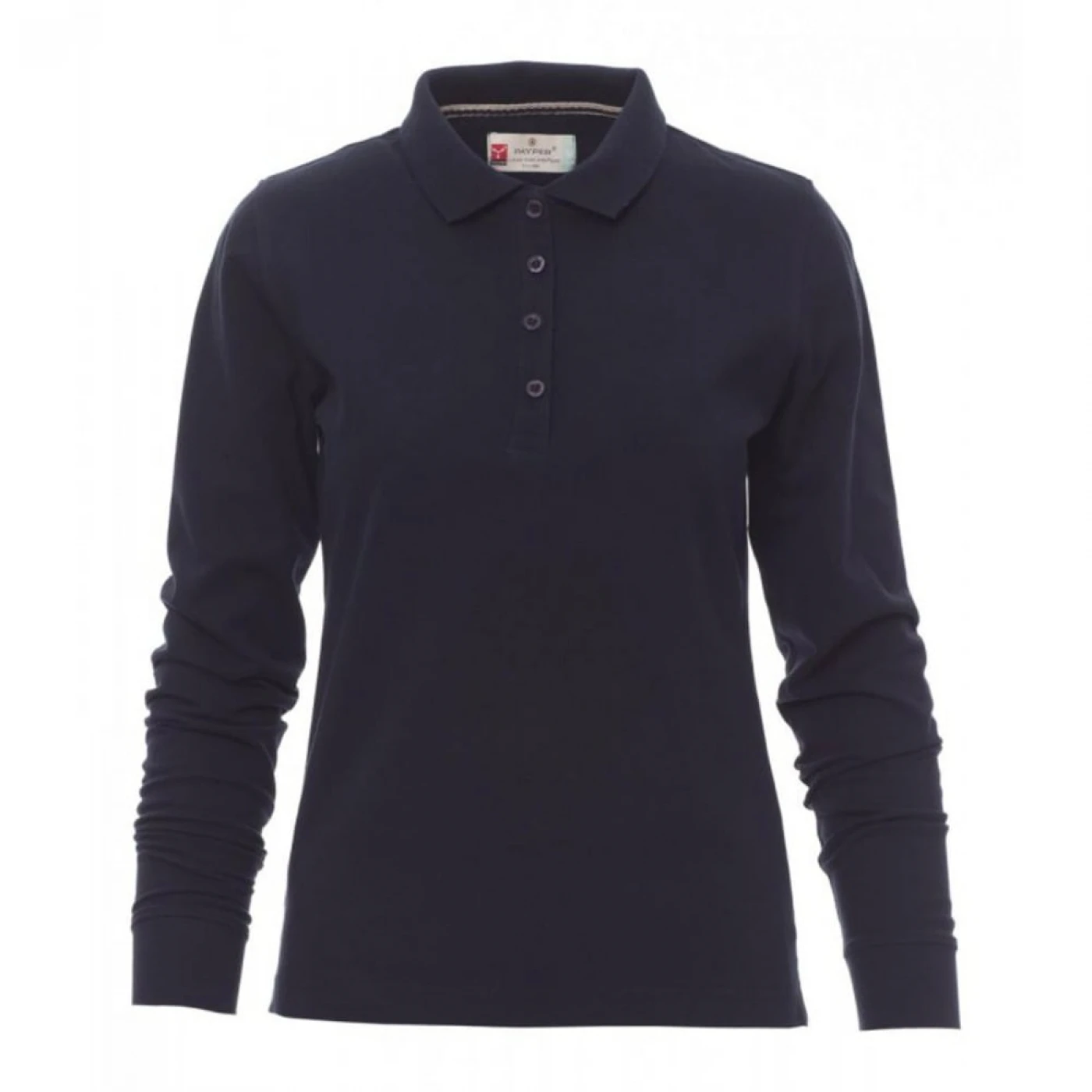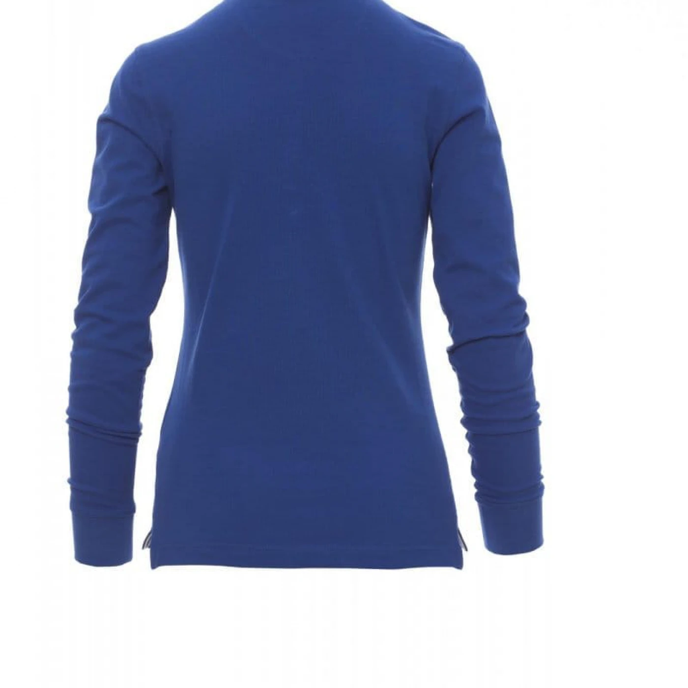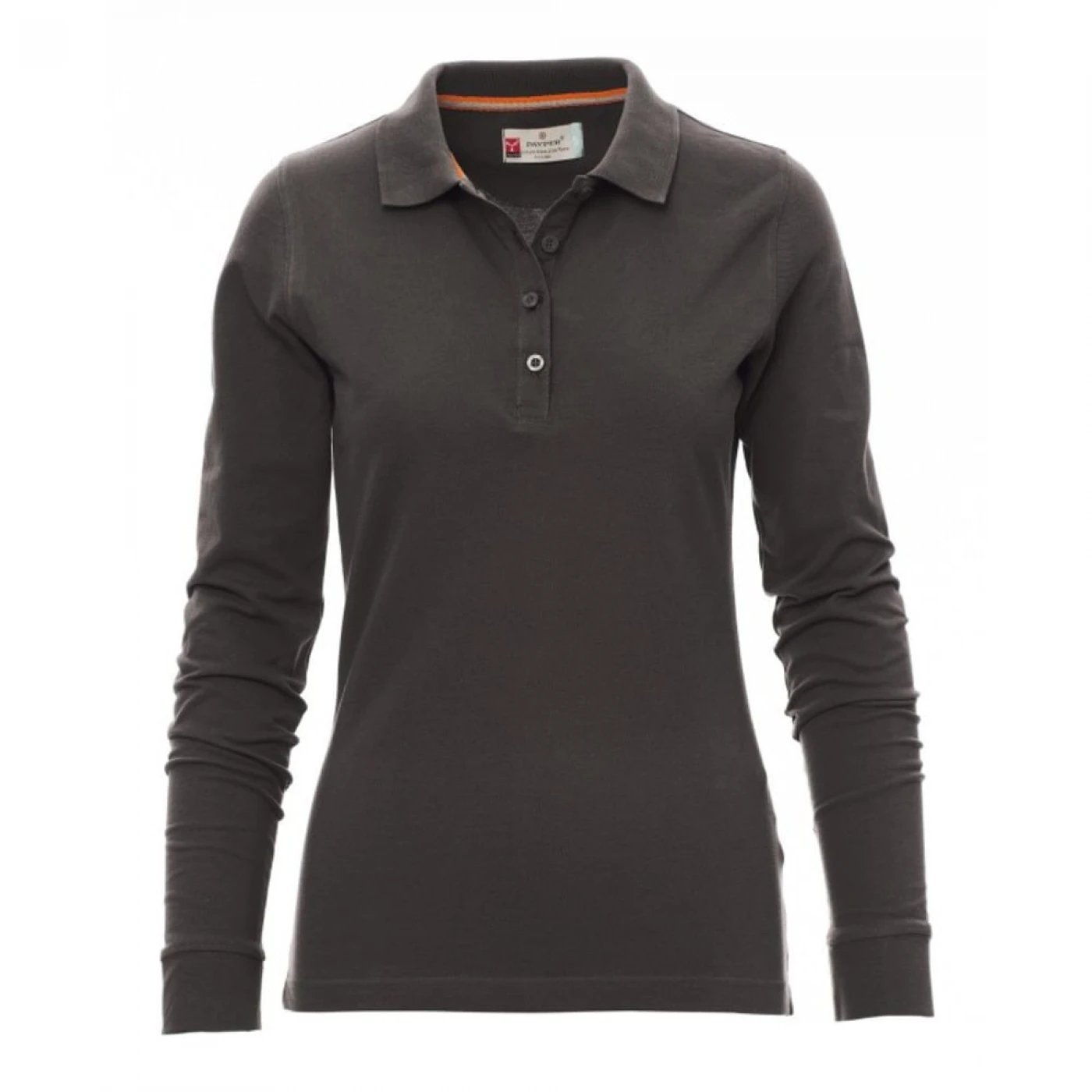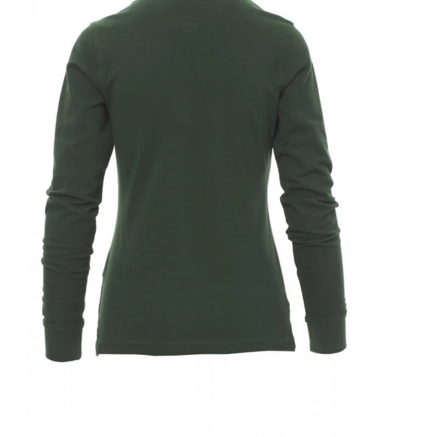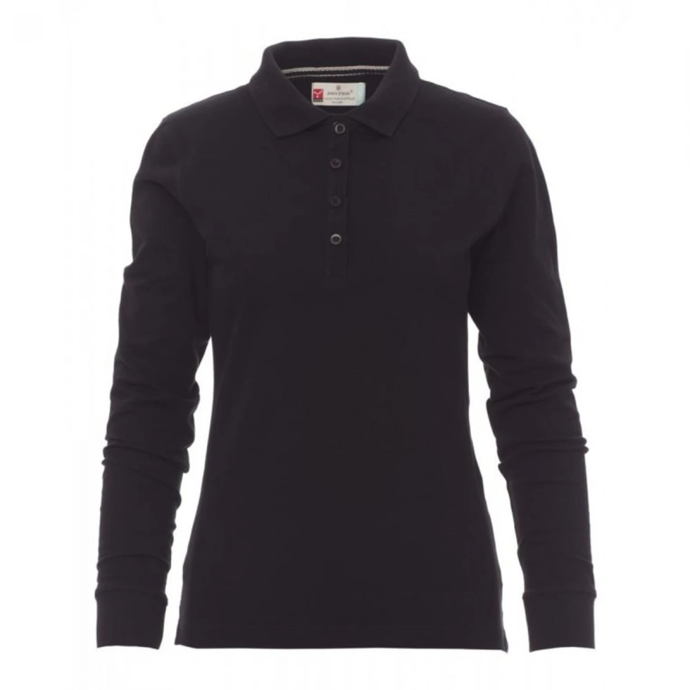 Tricou polo cu maneca lunga pentru femei confectionat din 100% bumbac pique. Gulerul si mansetele sunt intarite si cu cusaturi ascunse. Inchiderea la baza gatului se face cu ajutorul a trei nasturi sidefati in culoarea materialului de baza. \n