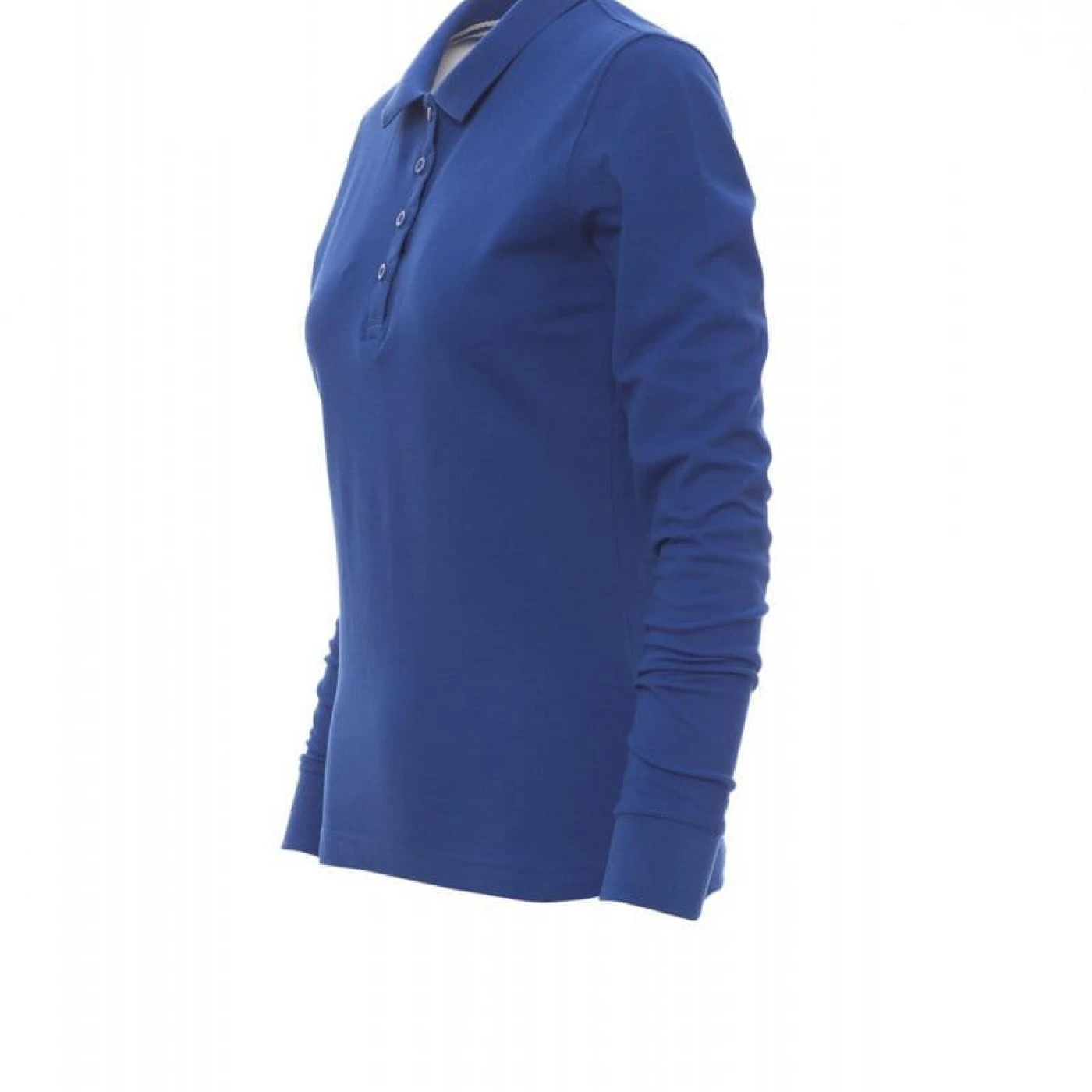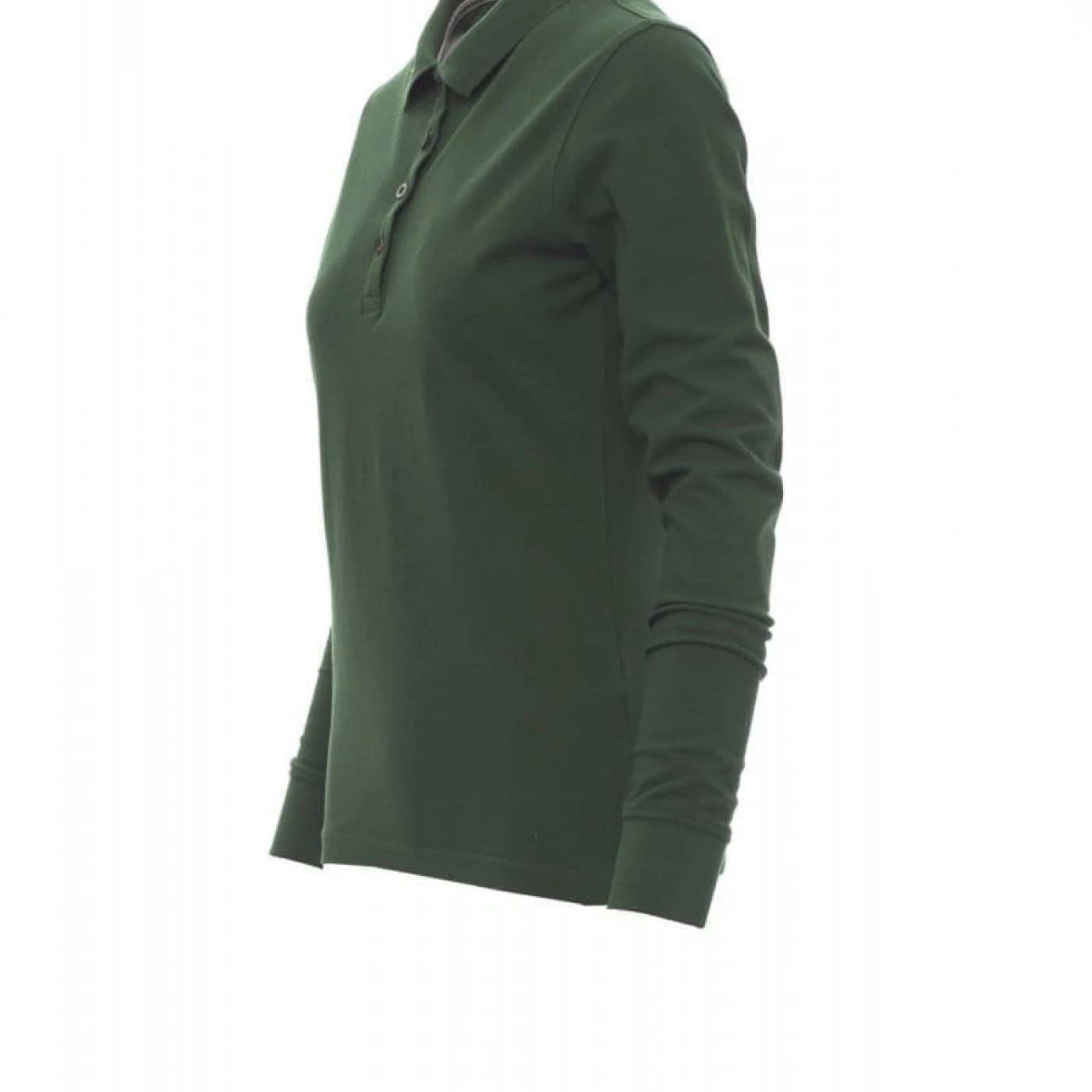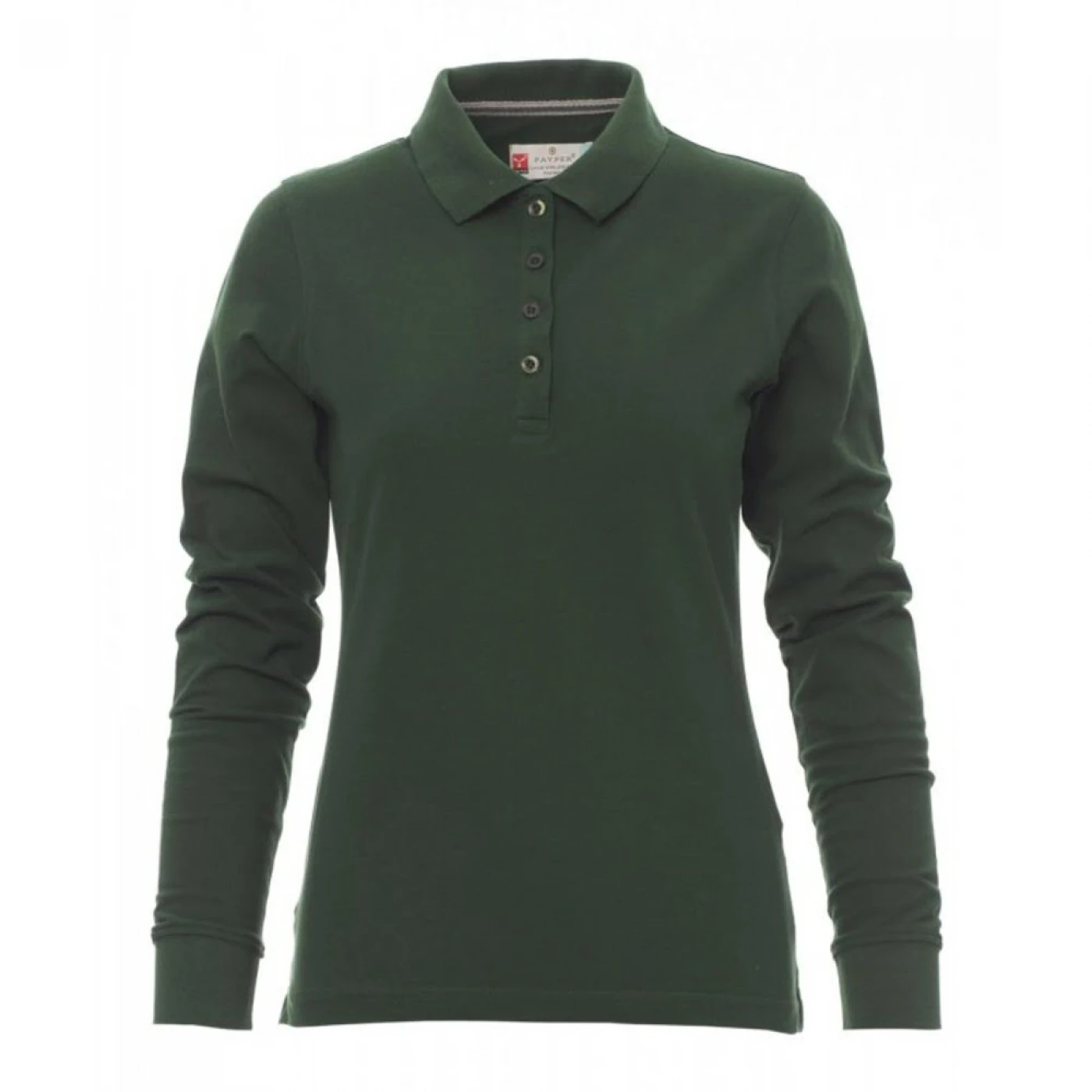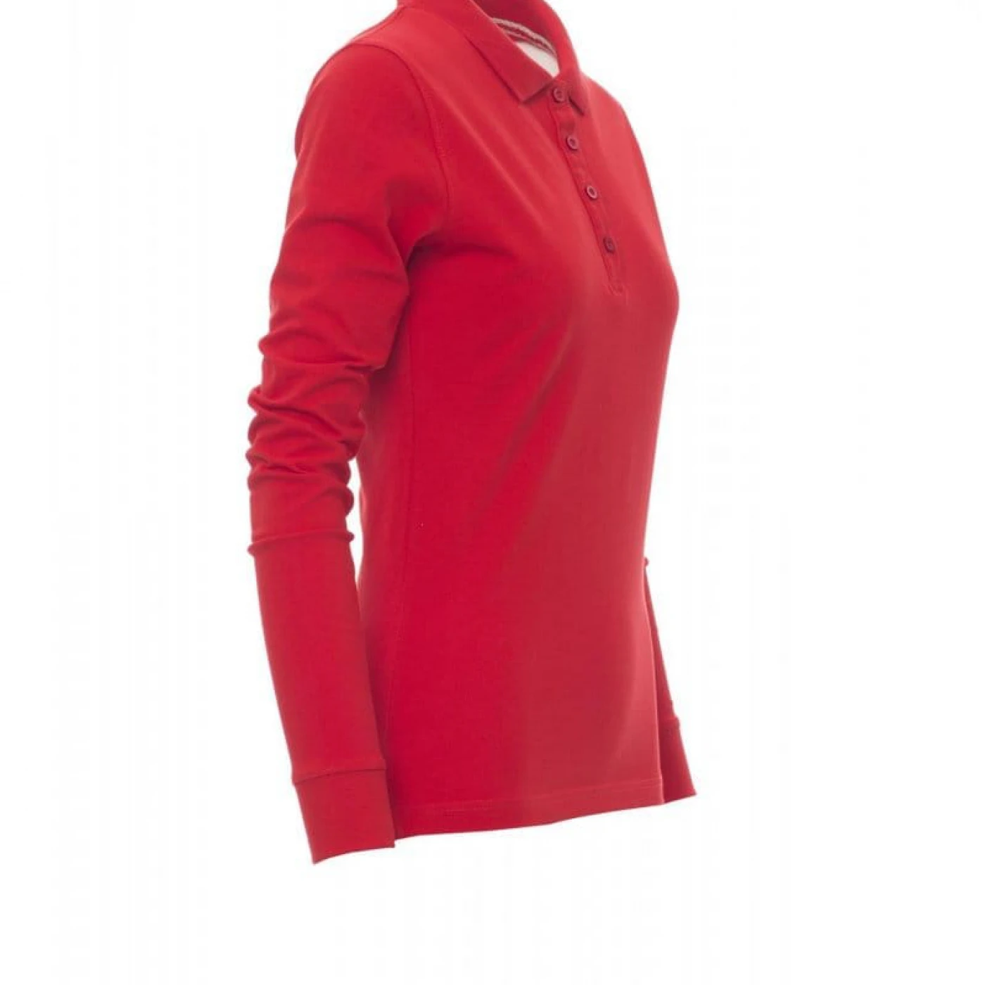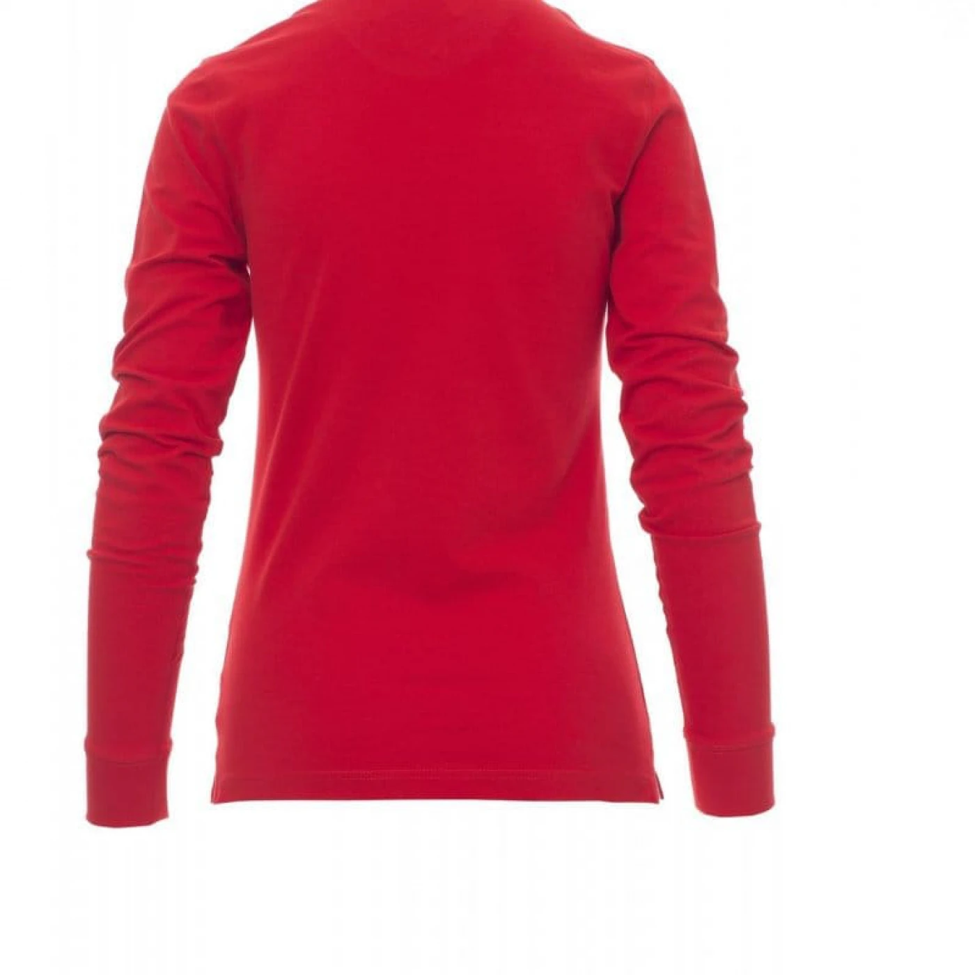 Tricou polo cu maneca lunga pentru femei confectionat din 100% bumbac pique. Gulerul si mansetele sunt intarite si cu cusaturi ascunse. Inchiderea la baza gatului se face cu ajutorul a trei nasturi sidefati in culoarea materialului de baza. \n