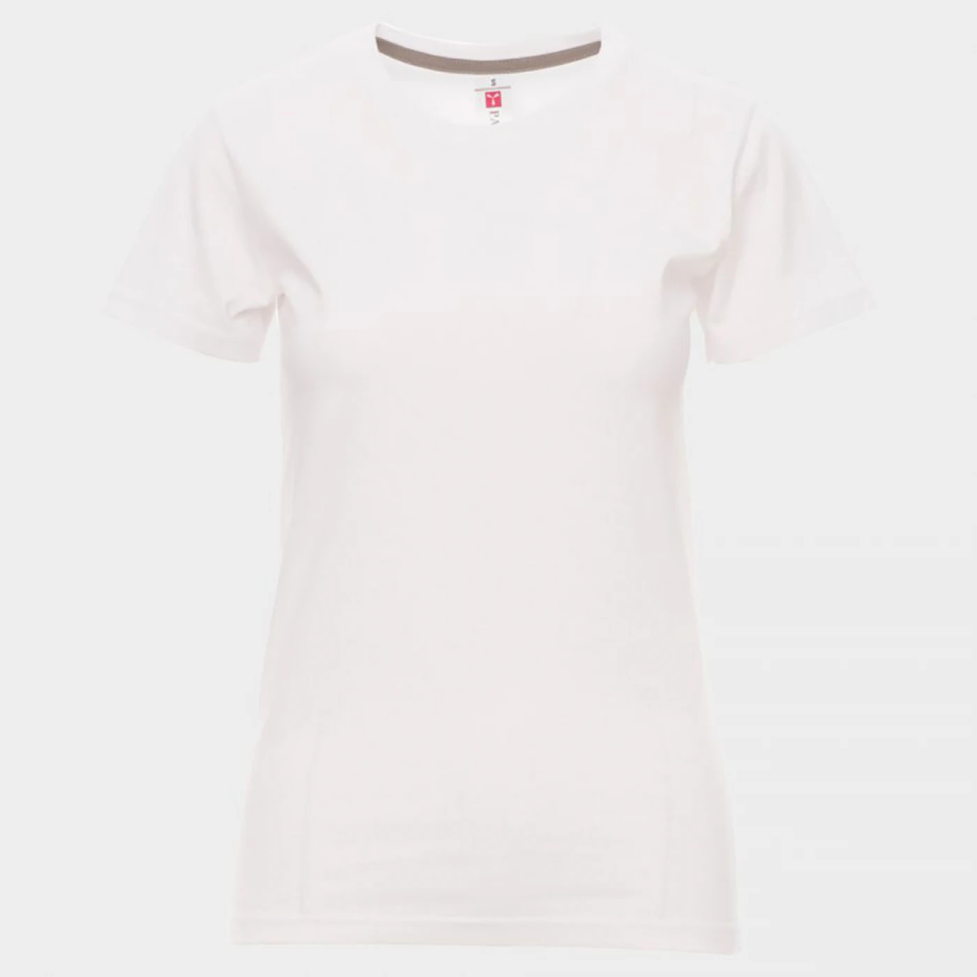 Tricou ajustat pentru femei cu guler rotund, mânecă scurtă, guler cu nervuri cu combinație de spandex de 1,5 cm, cu cusătură dublă la exterior, bandă de întăritură la nivelul umerilor în culoare contrastantă vizibilă pe partea interioară a gulerului, cusături stretch, cusătură laterală
