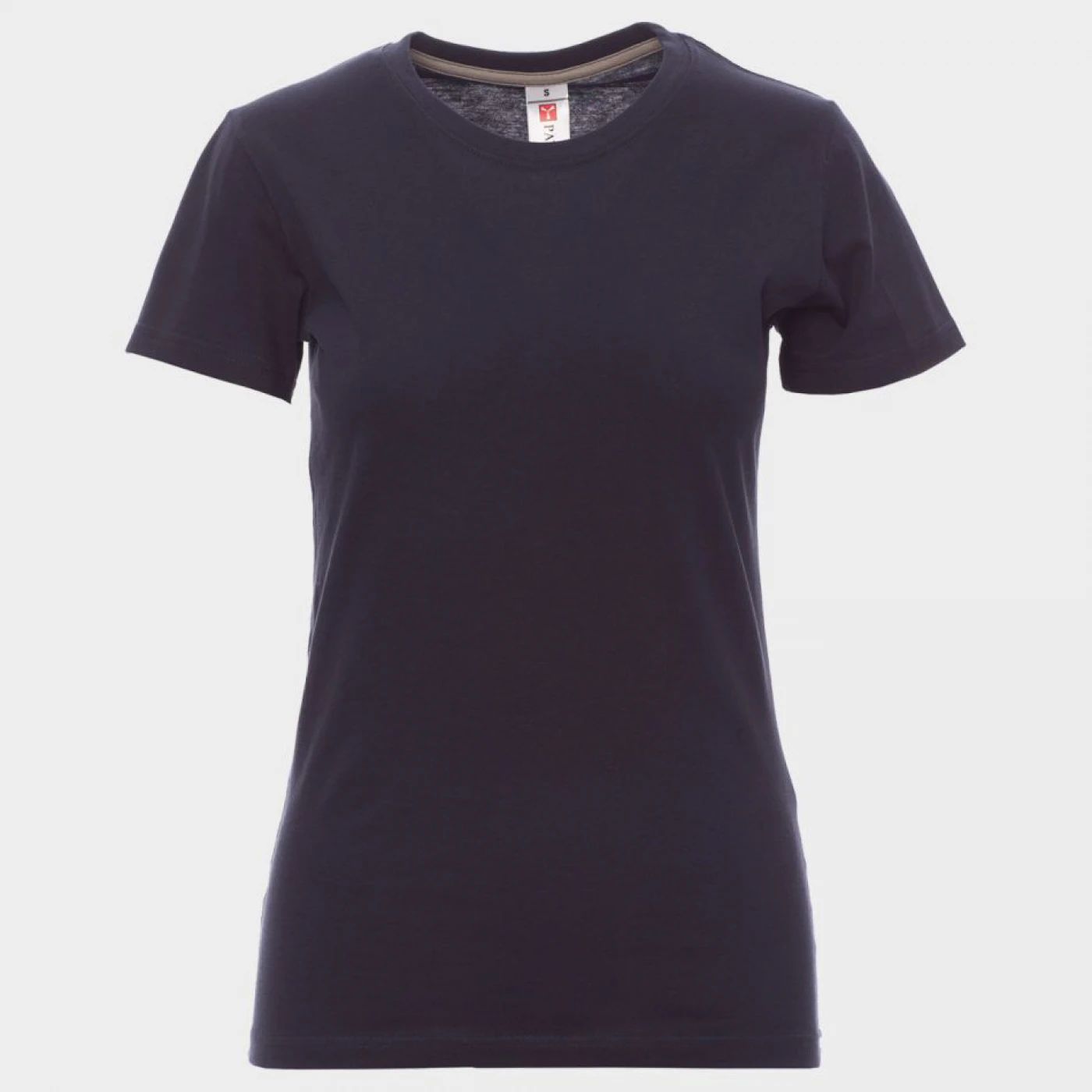 Tricou ajustat pentru femei cu guler rotund, mânecă scurtă, guler cu nervuri cu combinație de spandex de 1,5 cm, cu cusătură dublă la exterior, bandă de întăritură la nivelul umerilor în culoare contrastantă vizibilă pe partea interioară a gulerului, cusături stretch, cusătură laterală
