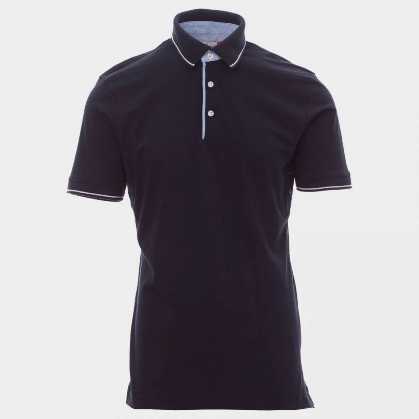 Tricou polo pentru bărbați cu mânecă scurtă, cu 3 nasturi albi, partea interioară a gulerului, banda și micile fante laterale din oxford bleu, guler și margine mânecă elastice cu profil contrastant, ochiuri sub braț, mici fante laterale cu cusături întărite, bandă de întăritură laterală, cusături stretch, întăritură modelată în partea din spate a gulerului.