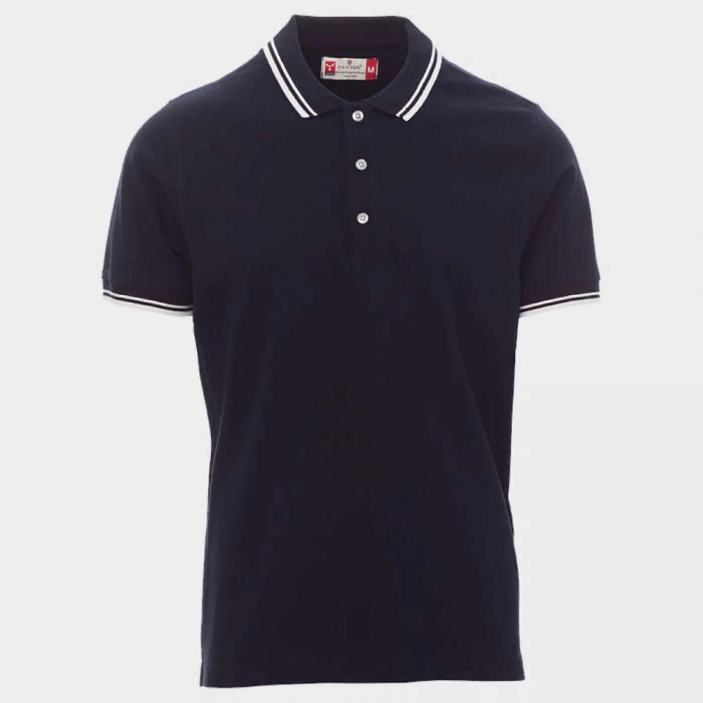 Tricou polo pentru bărbați cu mânecă scurtă, cu 3 nasturi albi, guler și margine mânecă cu profil fin contrastant, guler și margine mânecă elastice, mici fante laterale cu cusături întărite, cusături ascunse ale gulerului, bandă de întăritură laterală, cusături stretch, întăritură modelată în partea din spate a gulerului.