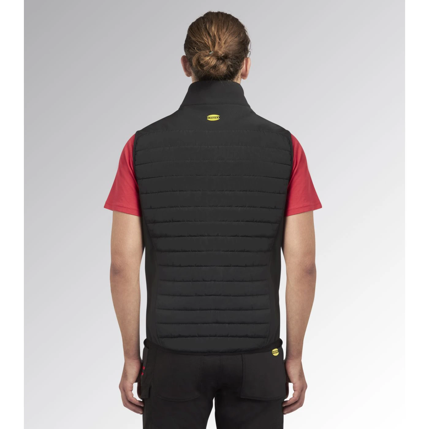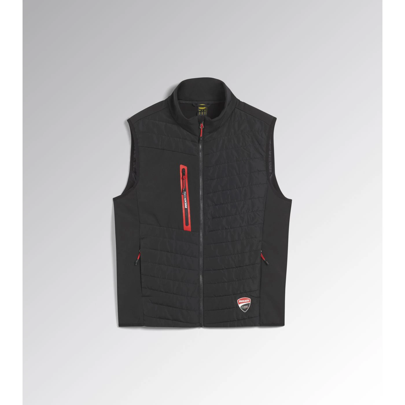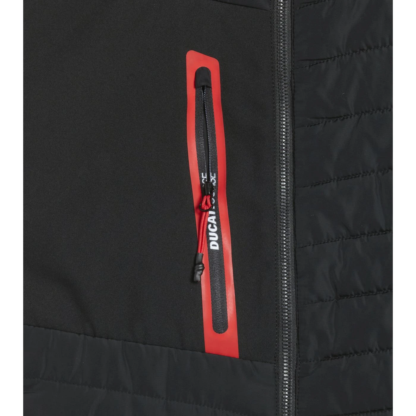 Gilet imbottito leggero. Collo in piedi con inserto salvabarba. Due tasche laterali e una tasca petto con dettaglio termonastrato e personalizzazione DUCATI CORSE, tutte con chiusura zip. Giro manica e fondo elasticizzati con Lycra. Finiture rosse a contrasto. Emblema Ducati Corse sul lato frontale.