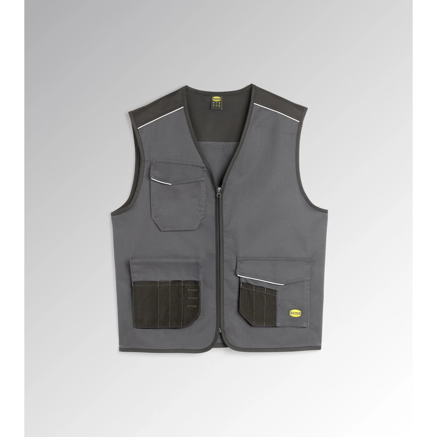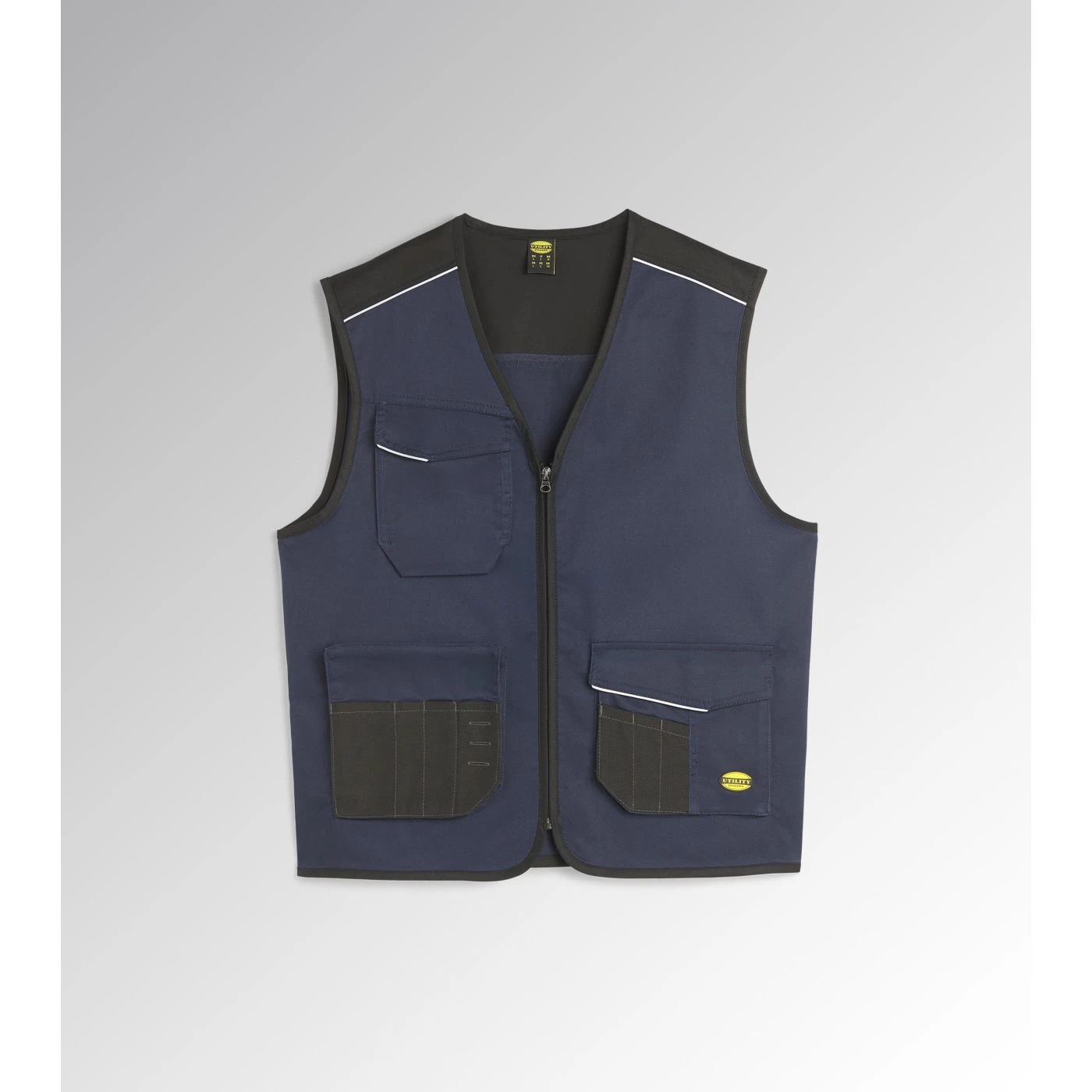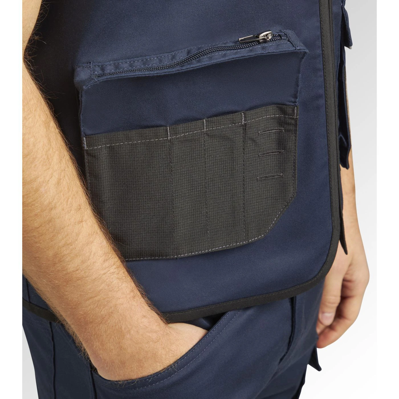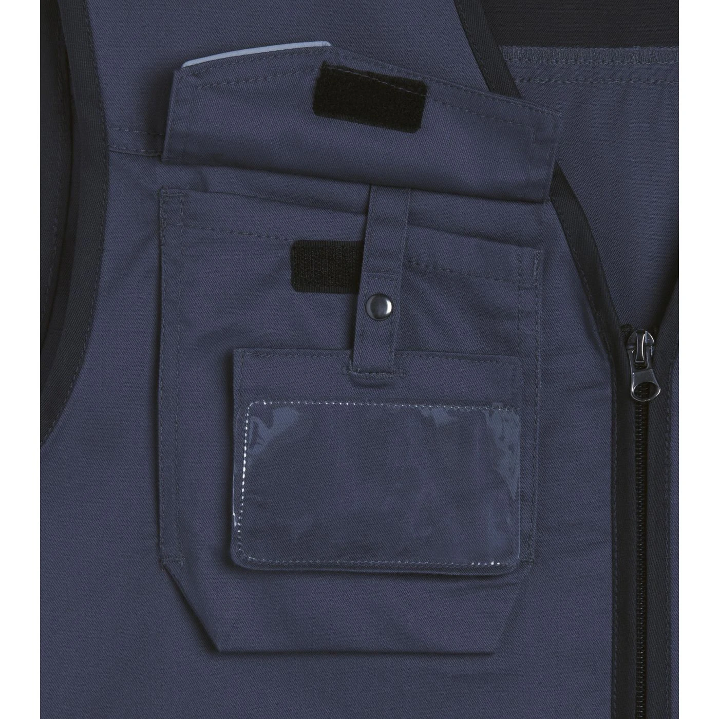 Stretch poly-cotton vest with full-zip V-neck. Breast pocket with badge holder on the left side, right side free for customisation, multifunctional patch pockets on the hem with ripstop reinforcements: one zip pocket and one flap pocket, reflective details.