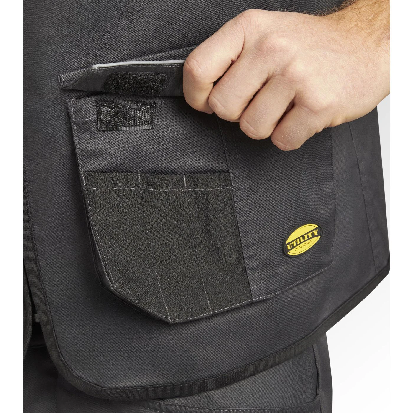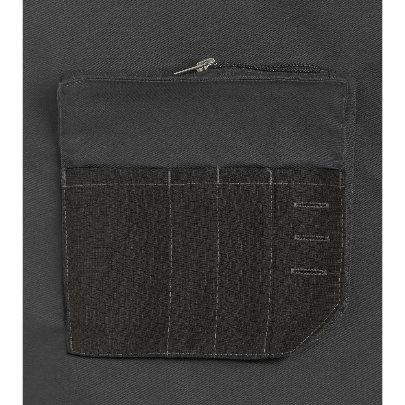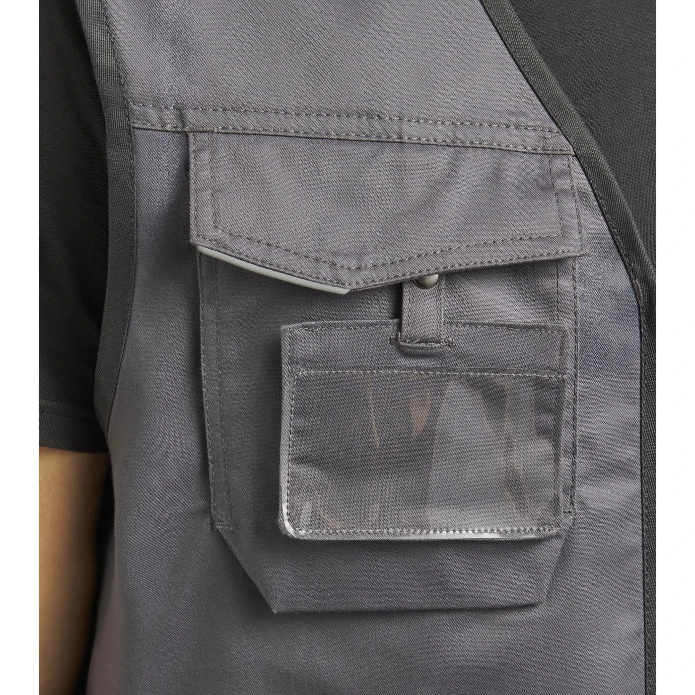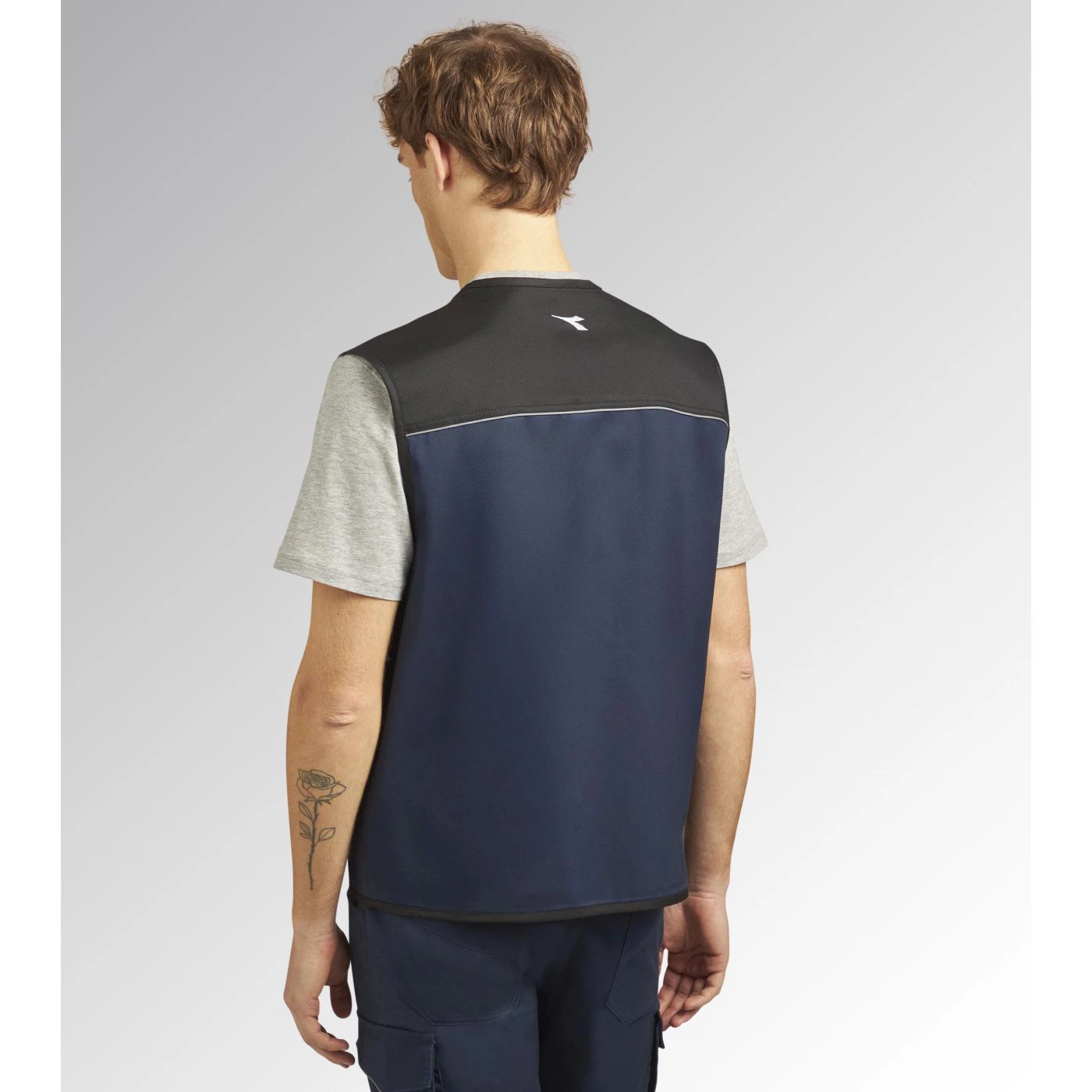 Stretch poly-cotton vest with full-zip V-neck. Breast pocket with badge holder on the left side, right side free for customisation, multifunctional patch pockets on the hem with ripstop reinforcements: one zip pocket and one flap pocket, reflective details.