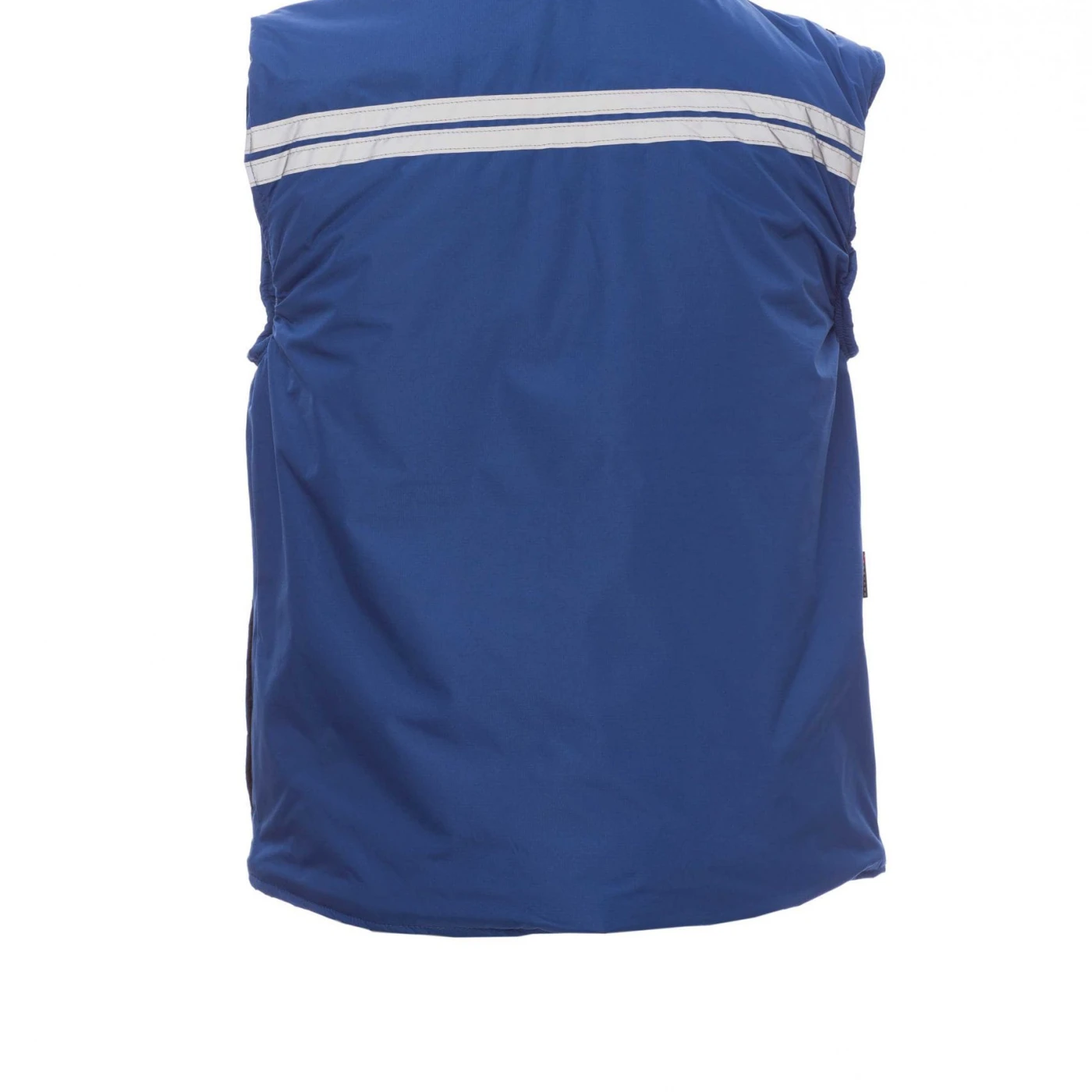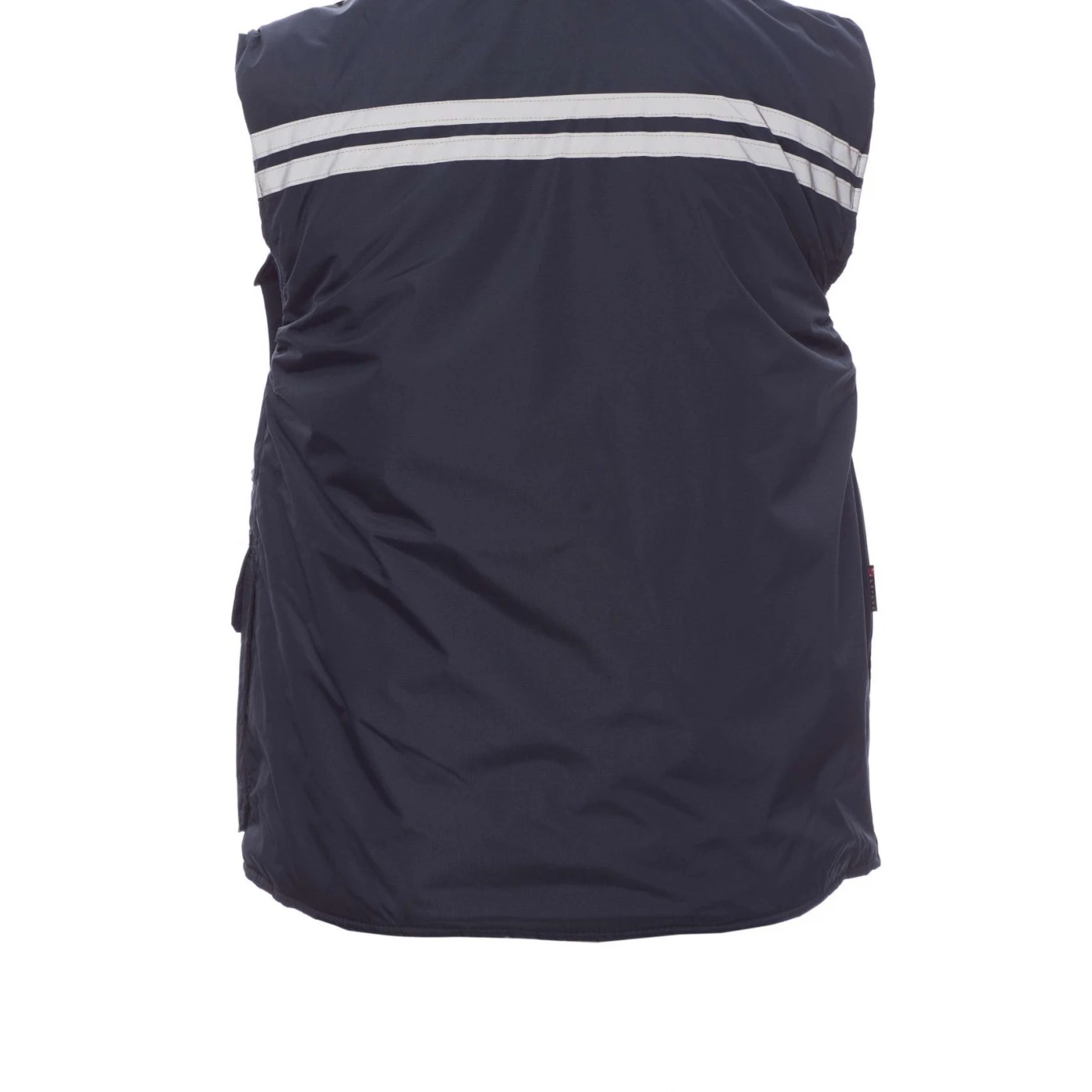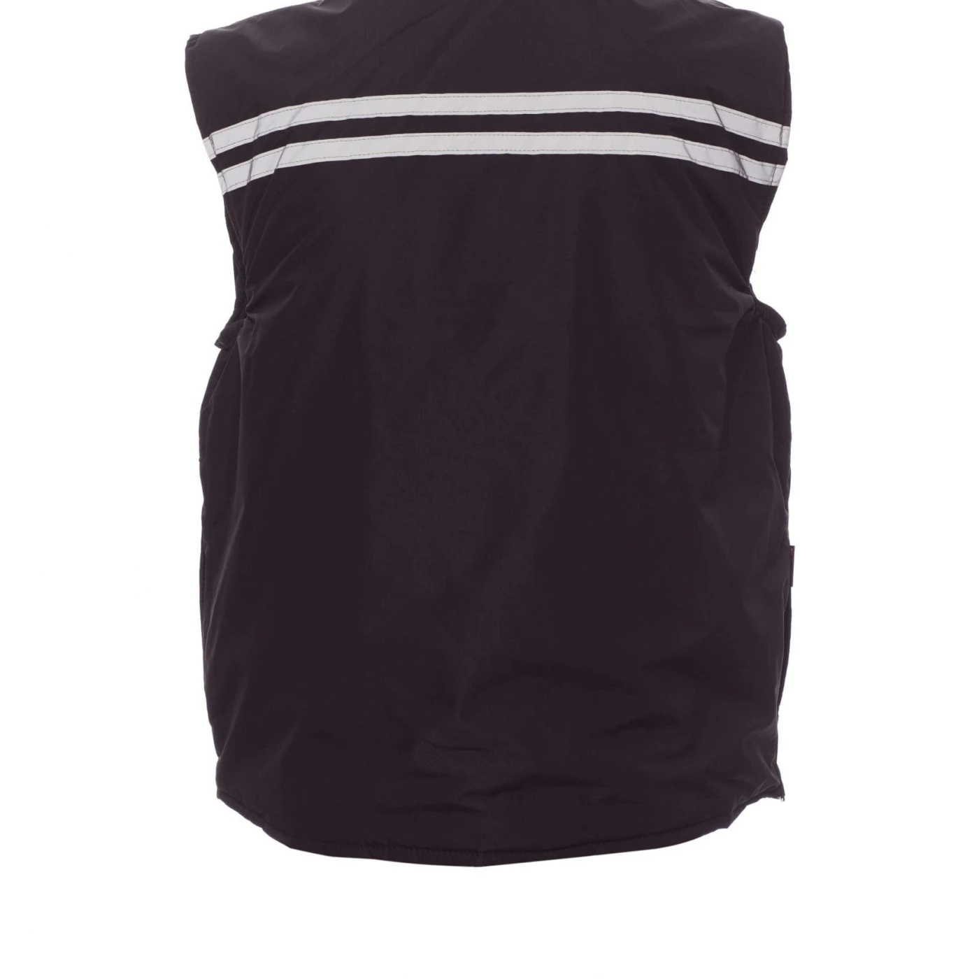 Vestă pentru bărbați, fermoar de 8 mm din plastic cu cursor metalic cu clapă și nasturi din plastic, glugă detașabilă și/sau ce poate fi închisă în interiorul gulerului, benzi reflectorizante gri pe partea din față și spate, fante laterale cu îmbinări și fermoar, nouă buzunare exterioare dintre care două prevăzute cu LOCK SYSTEM, două cu fermoar și parte interioară întărită, unul cu suport de ecuson cu două fețe. La interior este vătuită, partea interioară a gulerului, spatele și zona lombară sunt acoperite cu micro-fleece, în talie, este prevăzută cu șnur