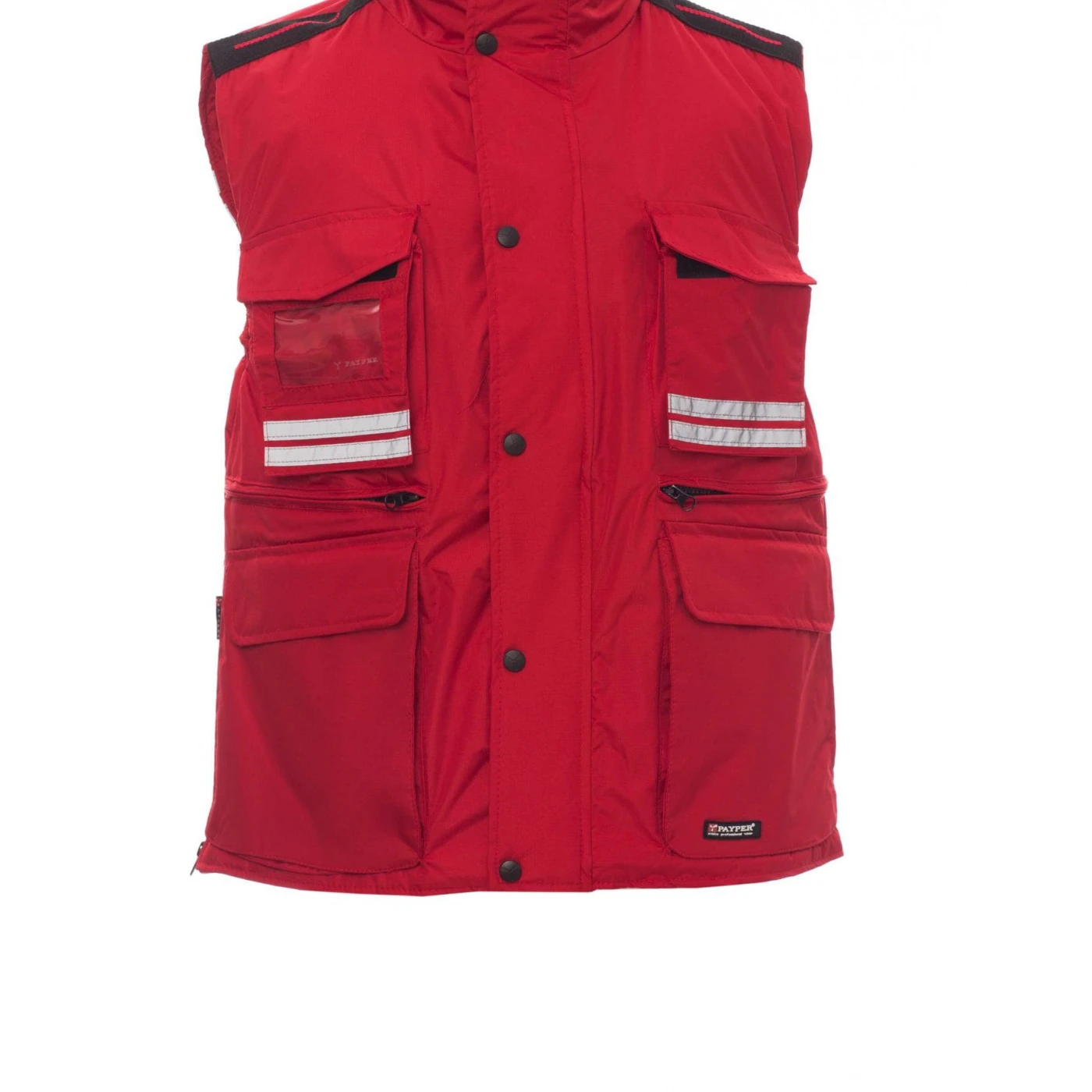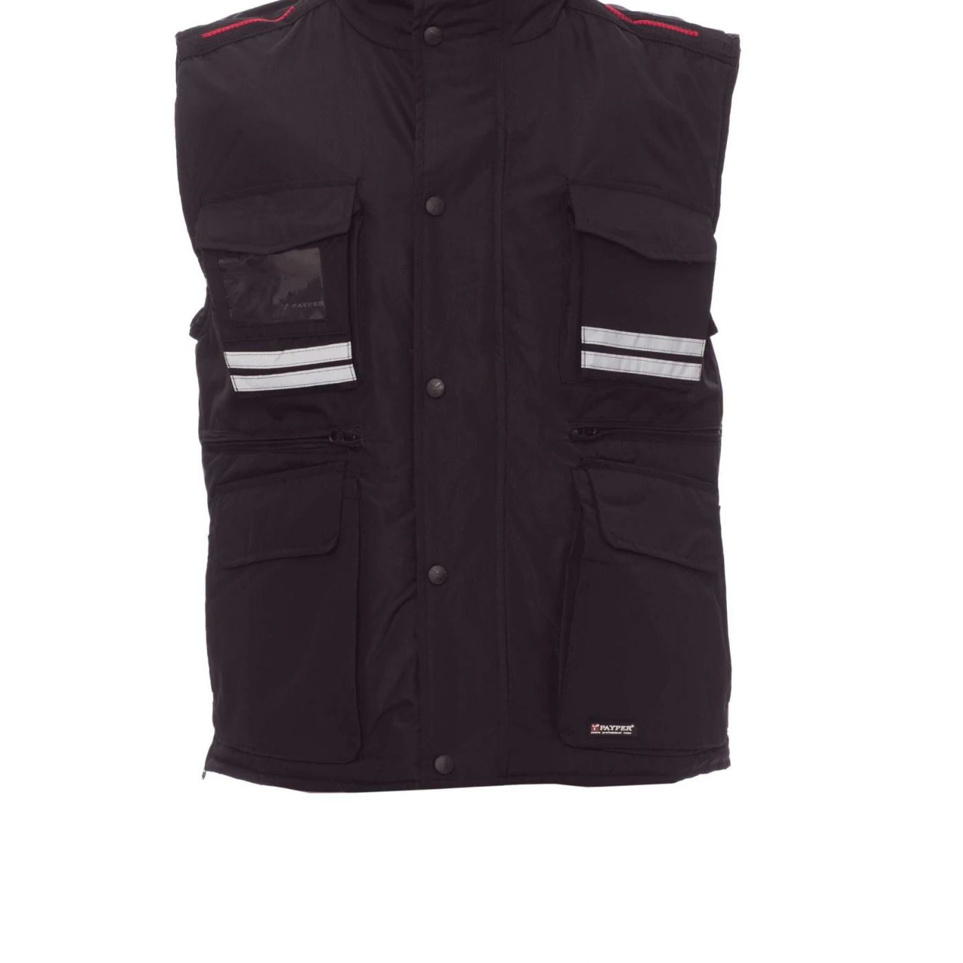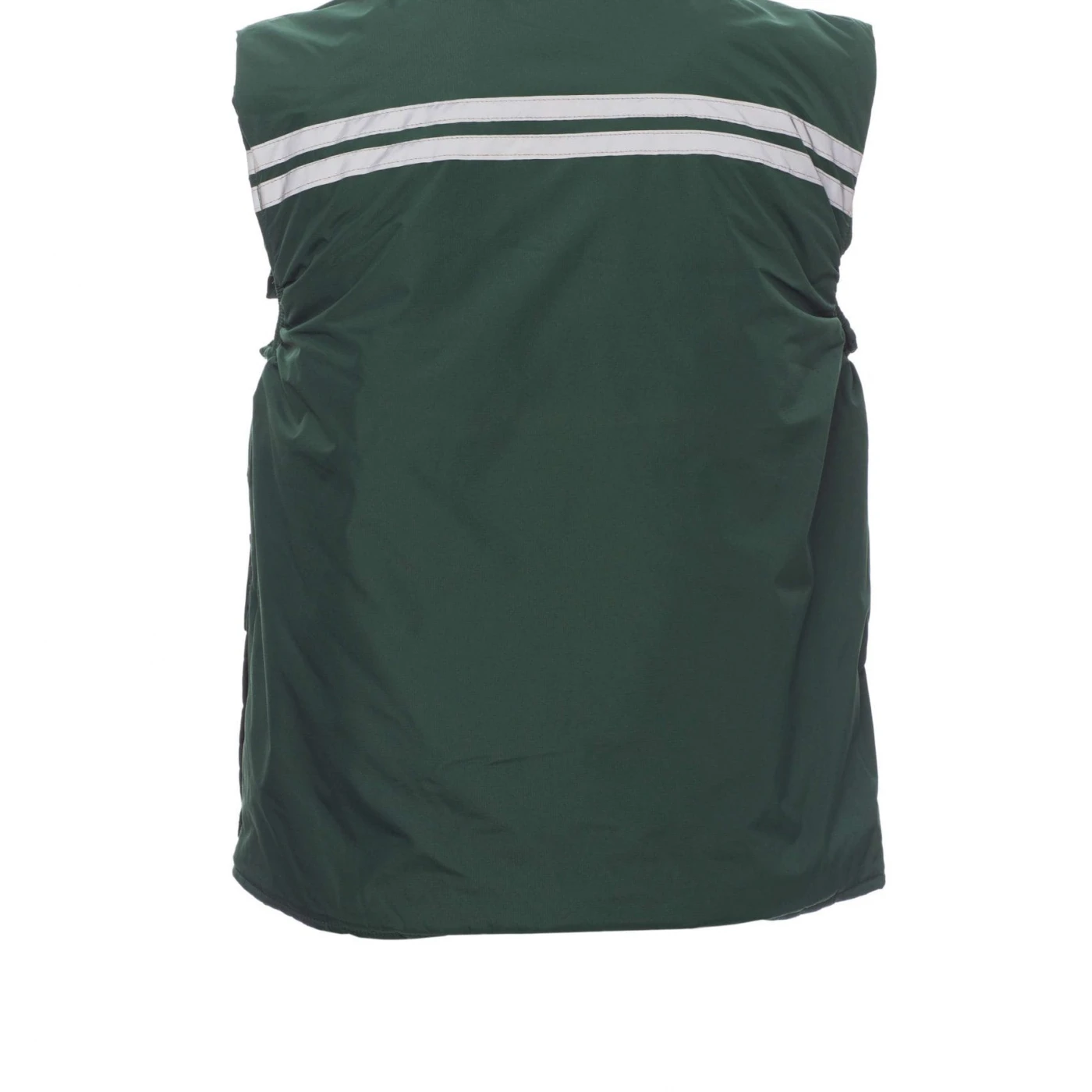 Vestă pentru bărbați, fermoar de 8 mm din plastic cu cursor metalic cu clapă și nasturi din plastic, glugă detașabilă și/sau ce poate fi închisă în interiorul gulerului, benzi reflectorizante gri pe partea din față și spate, fante laterale cu îmbinări și fermoar, nouă buzunare exterioare dintre care două prevăzute cu LOCK SYSTEM, două cu fermoar și parte interioară întărită, unul cu suport de ecuson cu două fețe. La interior este vătuită, partea interioară a gulerului, spatele și zona lombară sunt acoperite cu micro-fleece, în talie, este prevăzută cu șnur