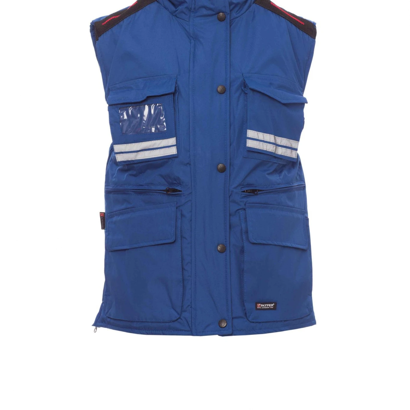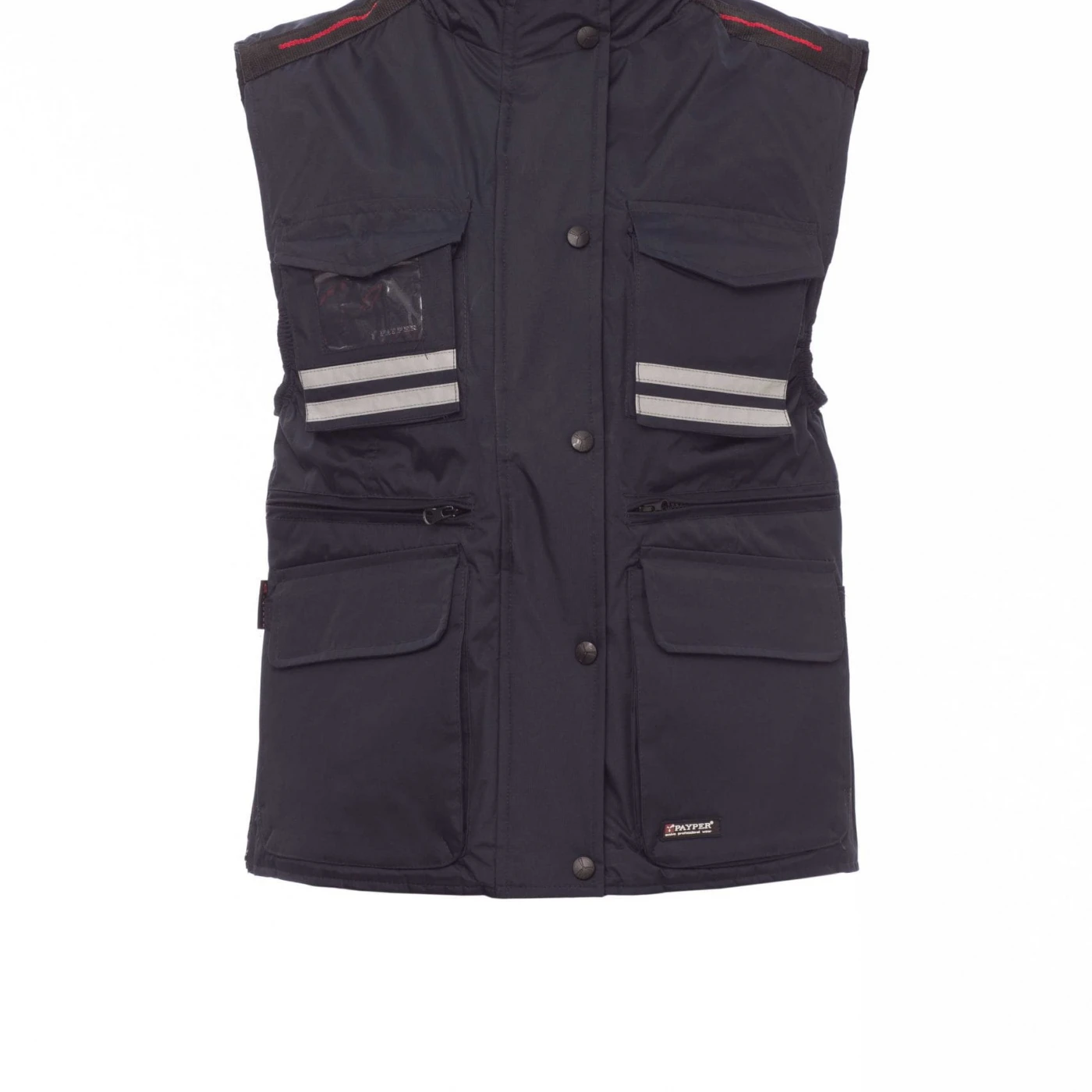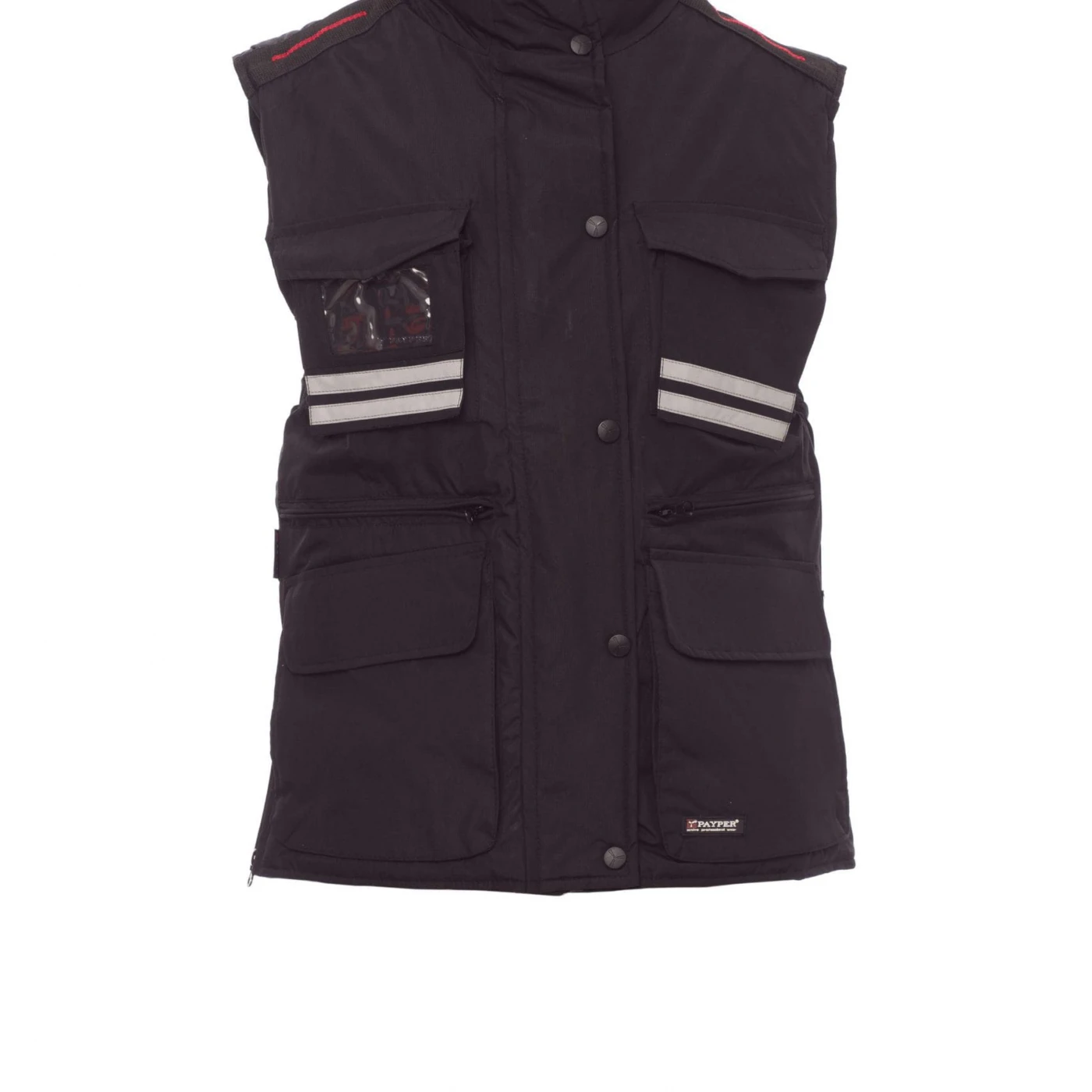 Vestă ergonomică pentru femei, fermoar de 8 mm din plastic cu cursor metalic cu clapă și nasturi din plastic, glugă detașabilă și/sau ce poate fi închisă în interiorul gulerului, benzi reflectorizante gri pe partea din față și spate, fante laterale cu îmbinări și fermoar, nouă buzunare exterioare dintre care două prevăzute cu LOCK SYSTEM, două cu fermoar și parte interioară întărită, unul cu suport de ecuson cu două fețe. La interior este vătuită, partea interioară a gulerului, spatele și zona lombară sunt acoperite cu micro-fleece, în talie, este prevăzută cu șnur