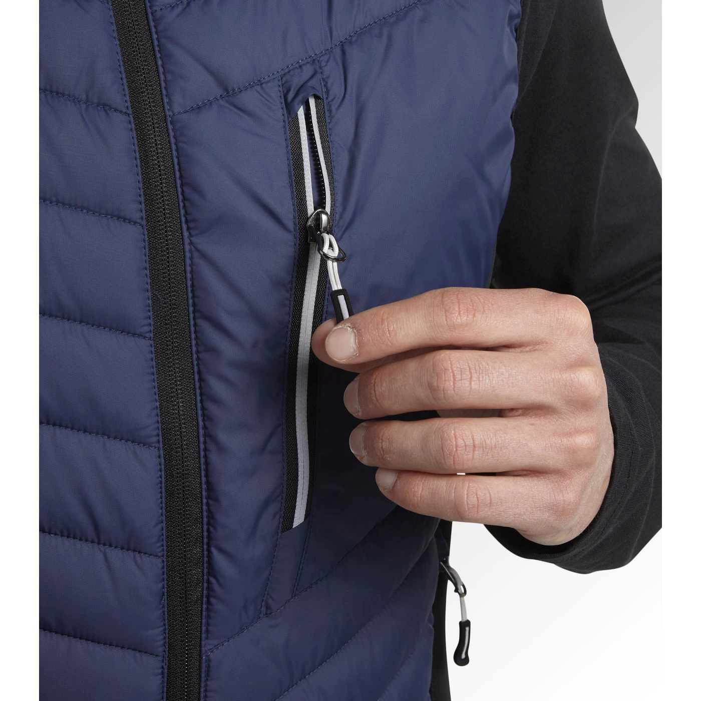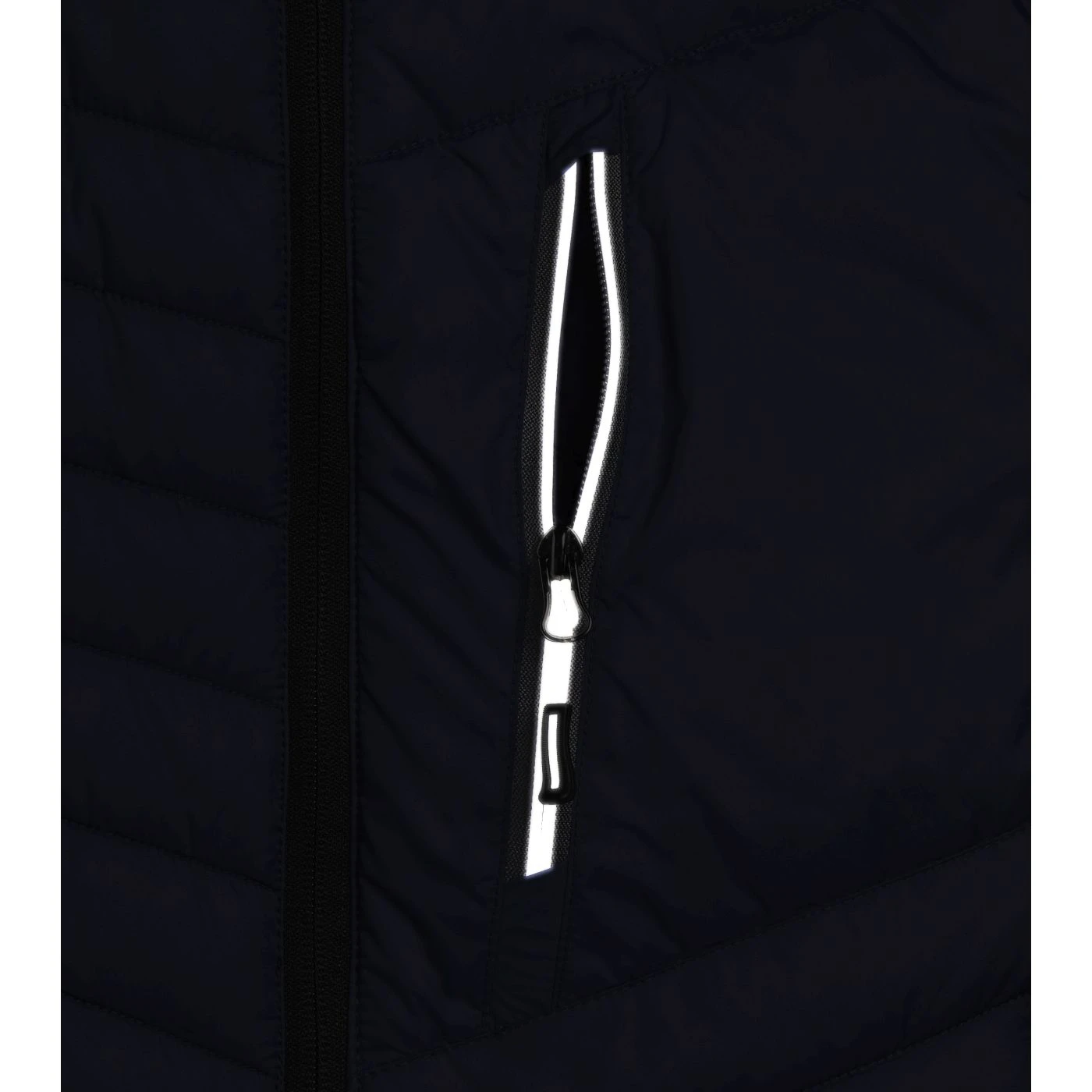 Lightweight padded vest with comfort fit and stretch inserts. Longer back for optimal wearability. One side pocket with inside safety pocket, one standard side pocket and one chest pocket, all with zip closures. Three inside pockets. Adjustable drawstring hem. Reflective details.