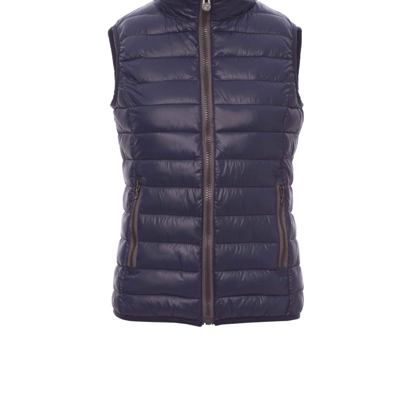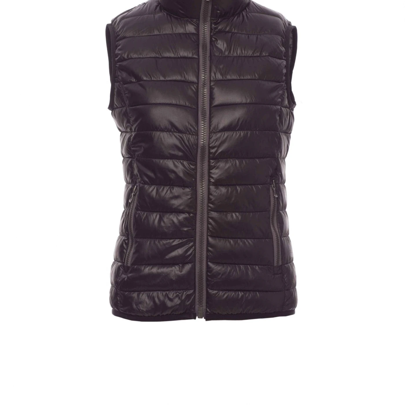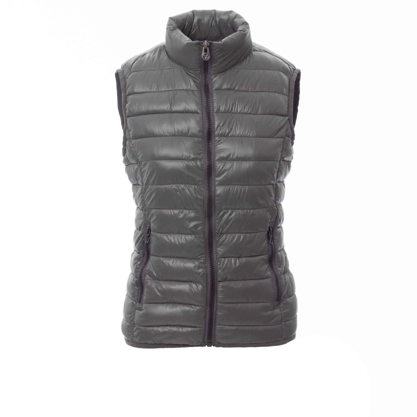 Vestă matlasată ergonomică pentru femei, fermoar de 8 mm din plastic cu cursor metalic, margine îngustă în talie, două buzunare exterioare. Vătuită la interior cu poliester, trei buzunare.